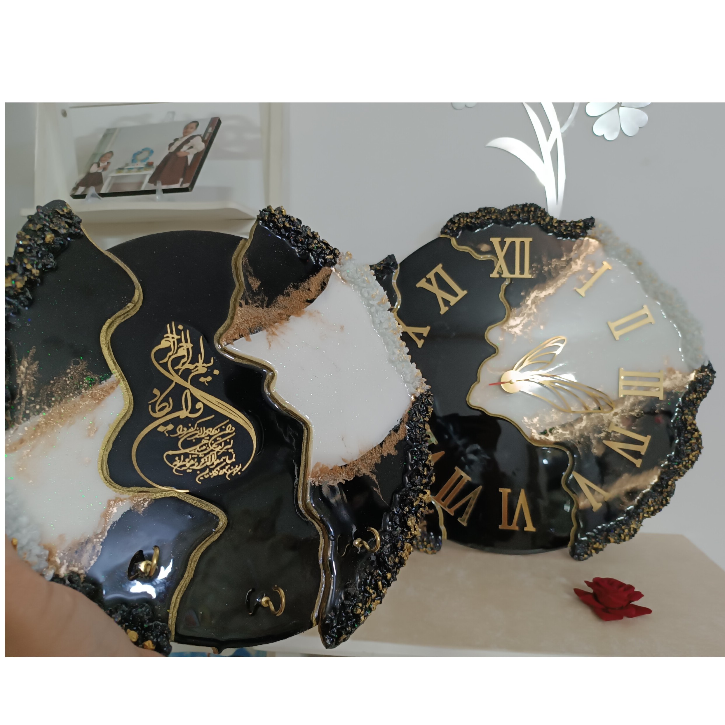 بیس دایره وسط50 سانتی ضخامت16 میل موتور تایوانی درجه یک آرام گرد با دوتا دفرمه های کنارش حدودا60 سانتی میشه پوشش دولایه رزین شفاف و زیبا جاکلیدی هم حدودا30 سانتی قابل اجرا ب رنگ و طرح و سایز دلخواه شما