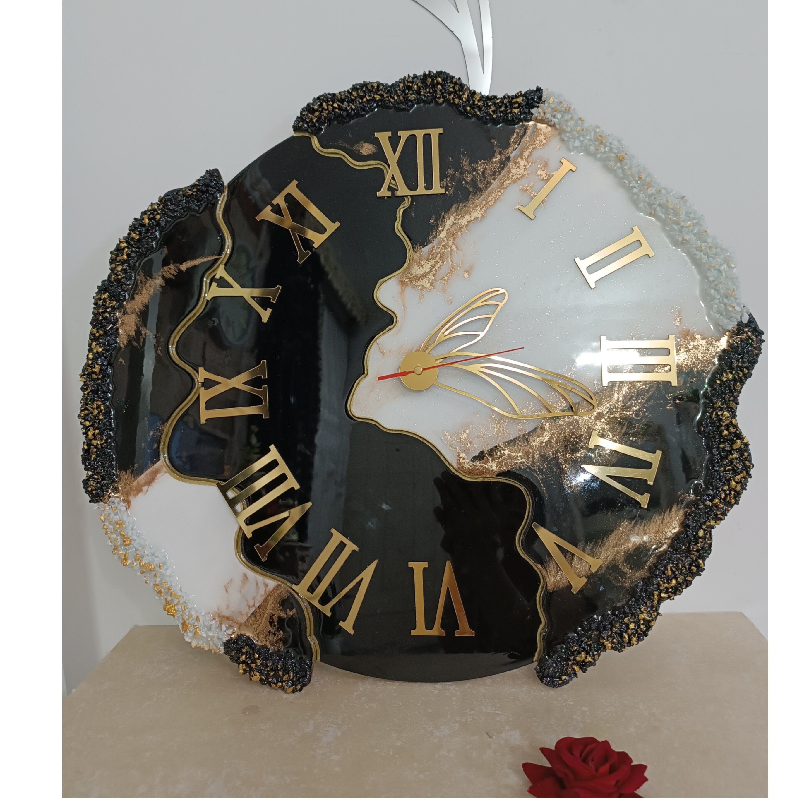 ساعت دیواری رزینی دفرمه مشکی طلایی مبلمونسرا مدل 236954