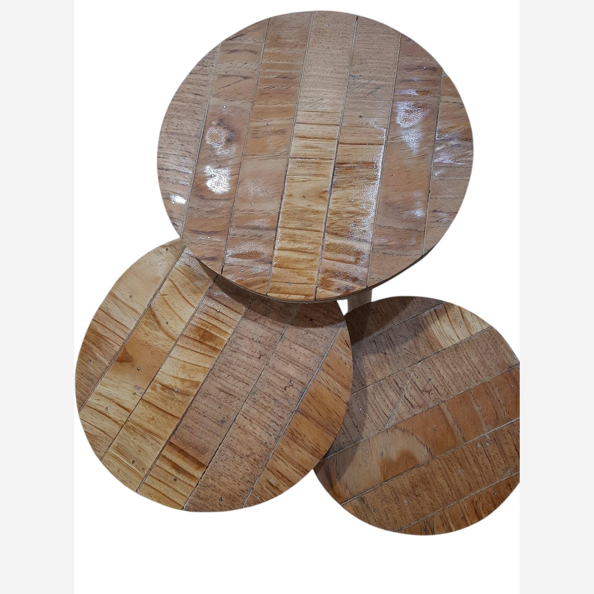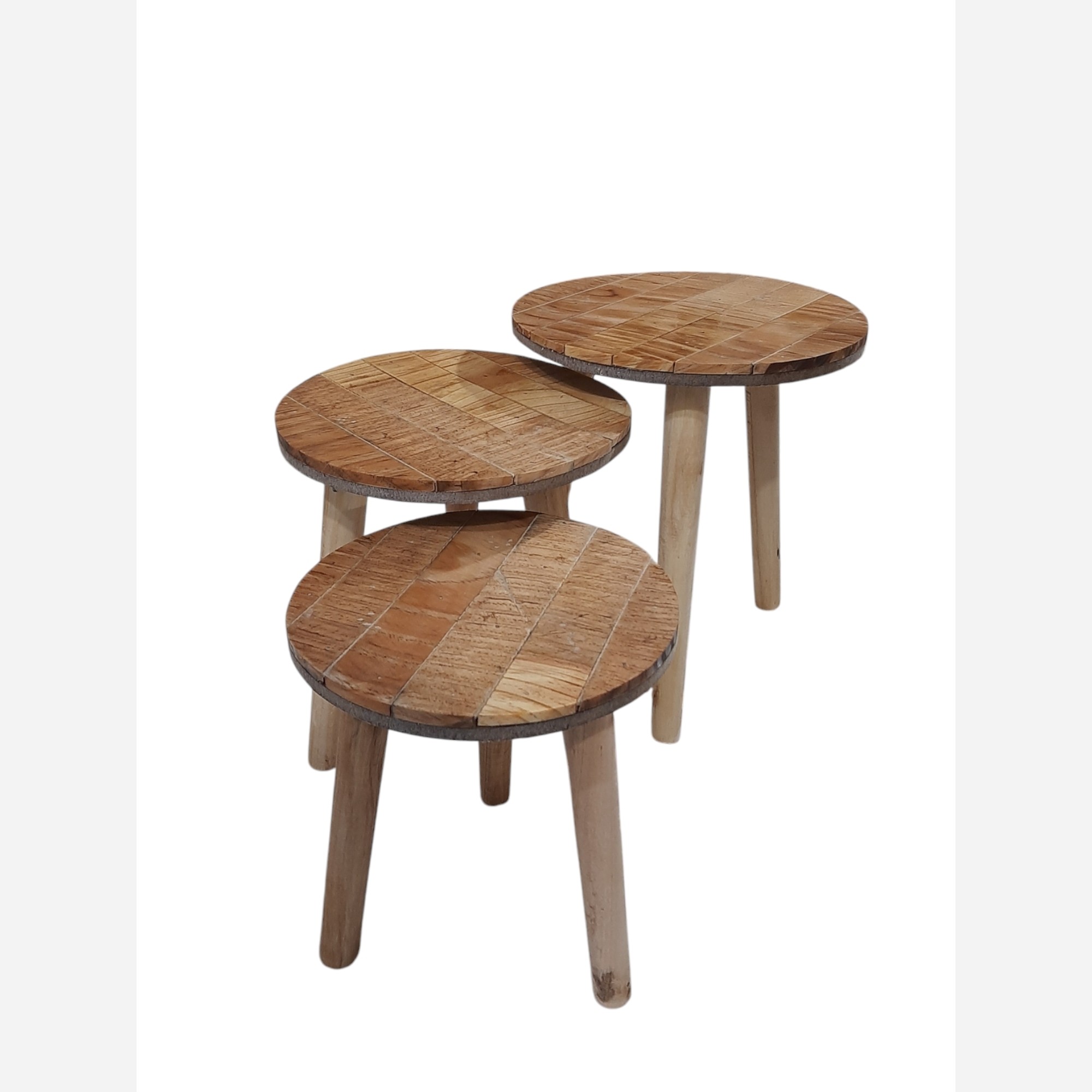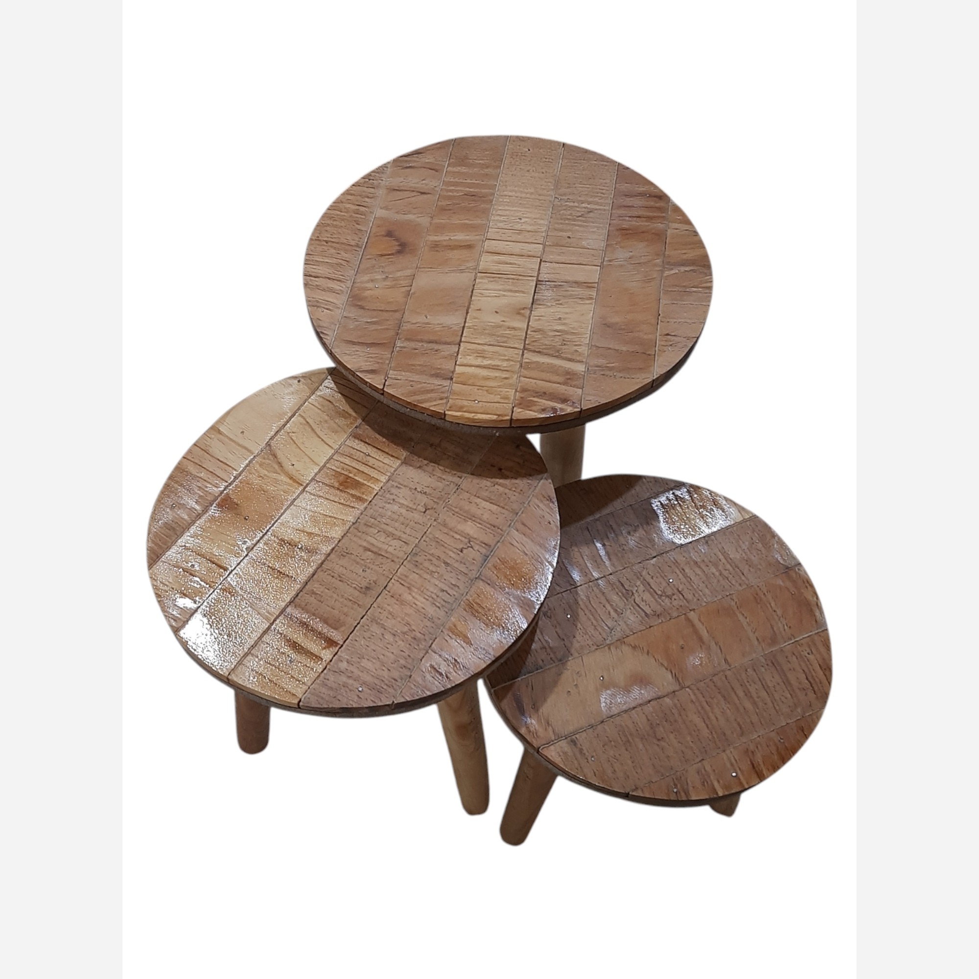 میز سه تیکه ساخته شده با برش های نواری چوب کاج که با نقش فوق العاده خودش جلوه خاصی داره این میز تحمل وزن بالاو مقاوم به رطوبته و برای انواع دکوری و گلدان مناسبه
