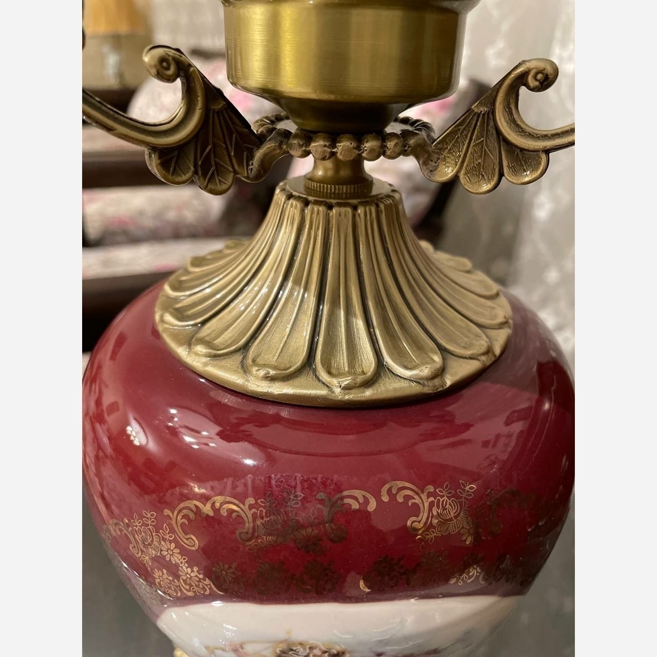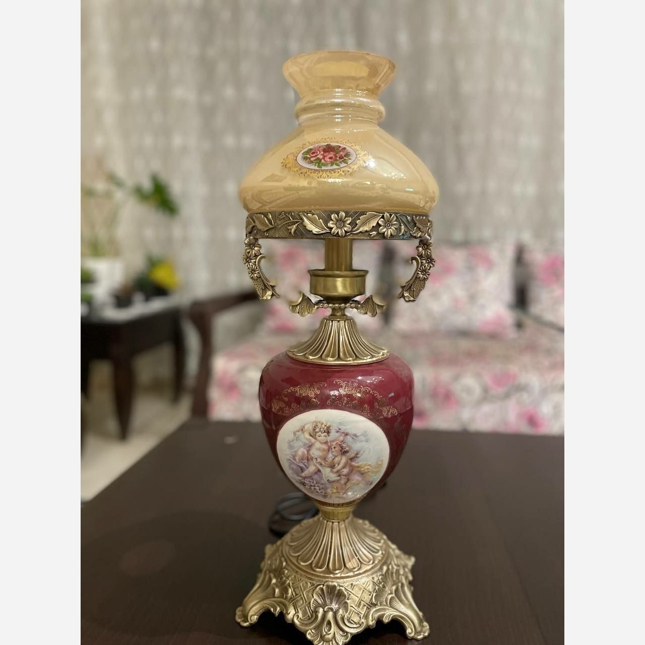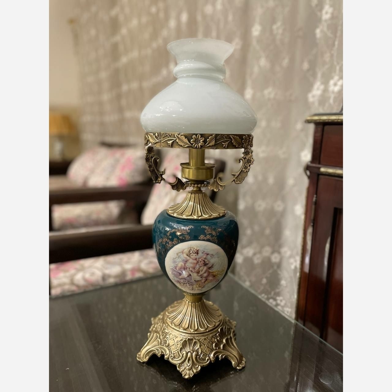 آباژور رومیزی آنتیک لمپا چراغ نفتی شب خواب لنتر چینی برنز گردسوز گرسوز چراغ درباری حباب دار قالپاقی شمعدان مبلمونسرا مدل 234517