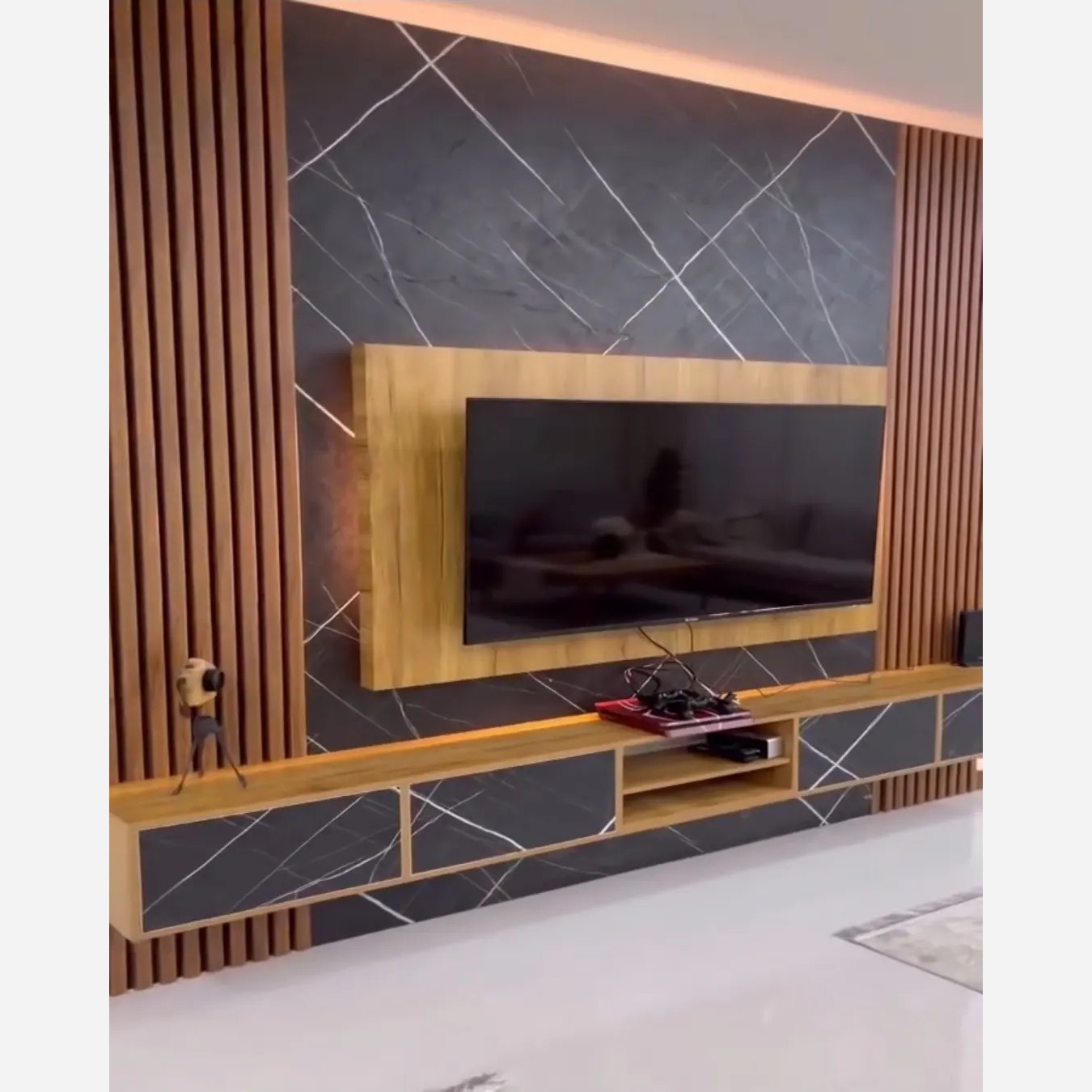 تیوی وال دیوار تلویزیون TWWall رنگ چوب و بتن رگه سفید سبک ترموود از خود رنگ چوب کار شده چهار درب