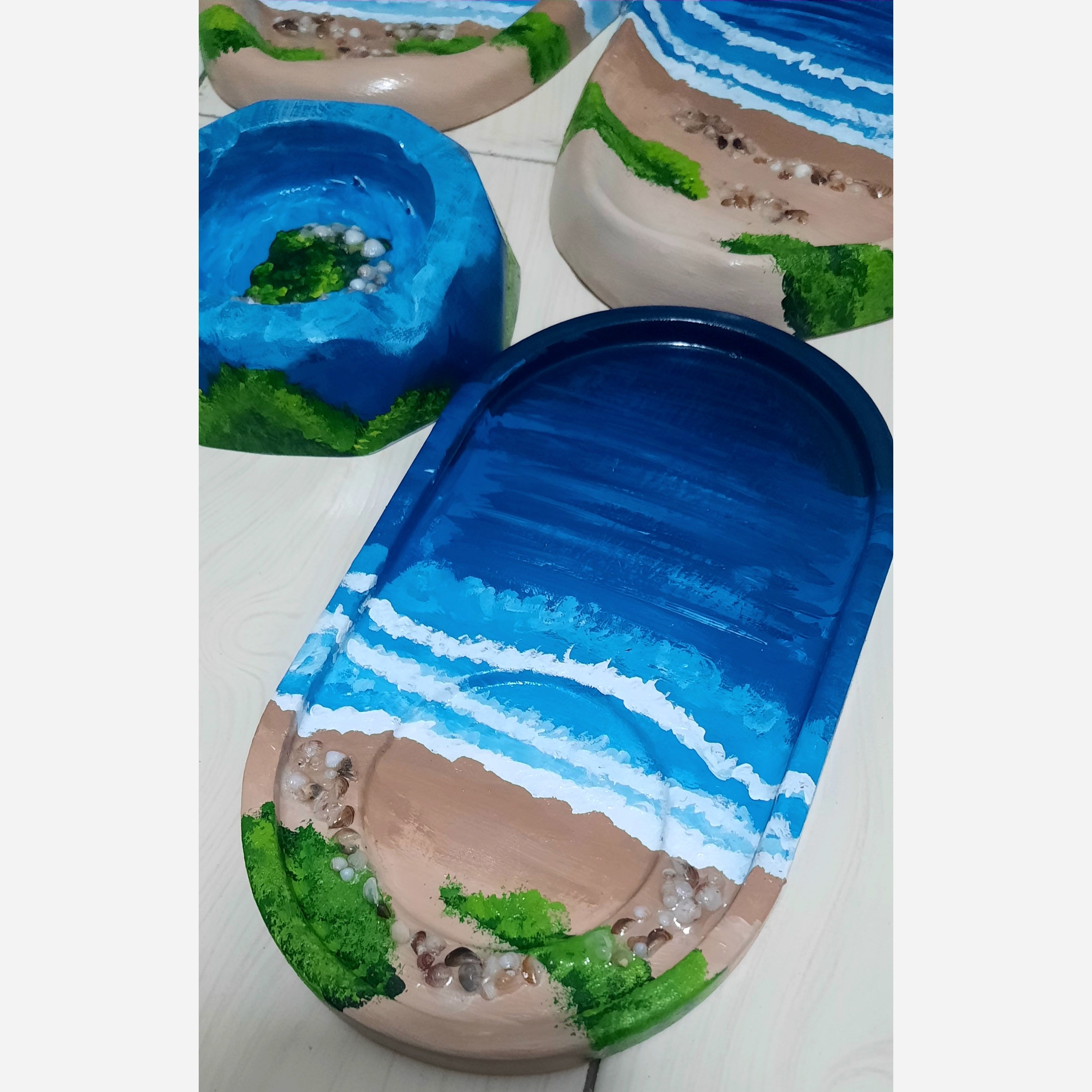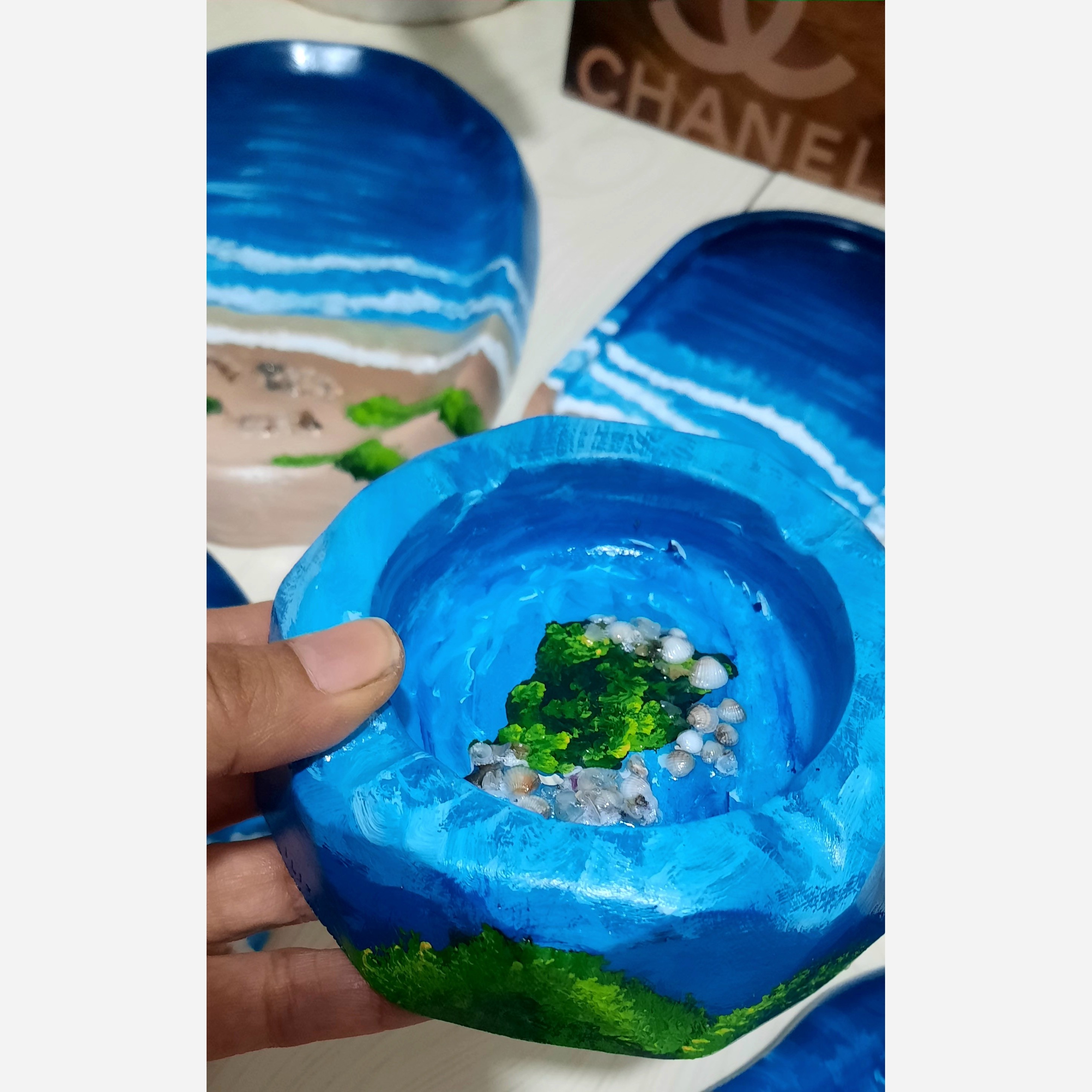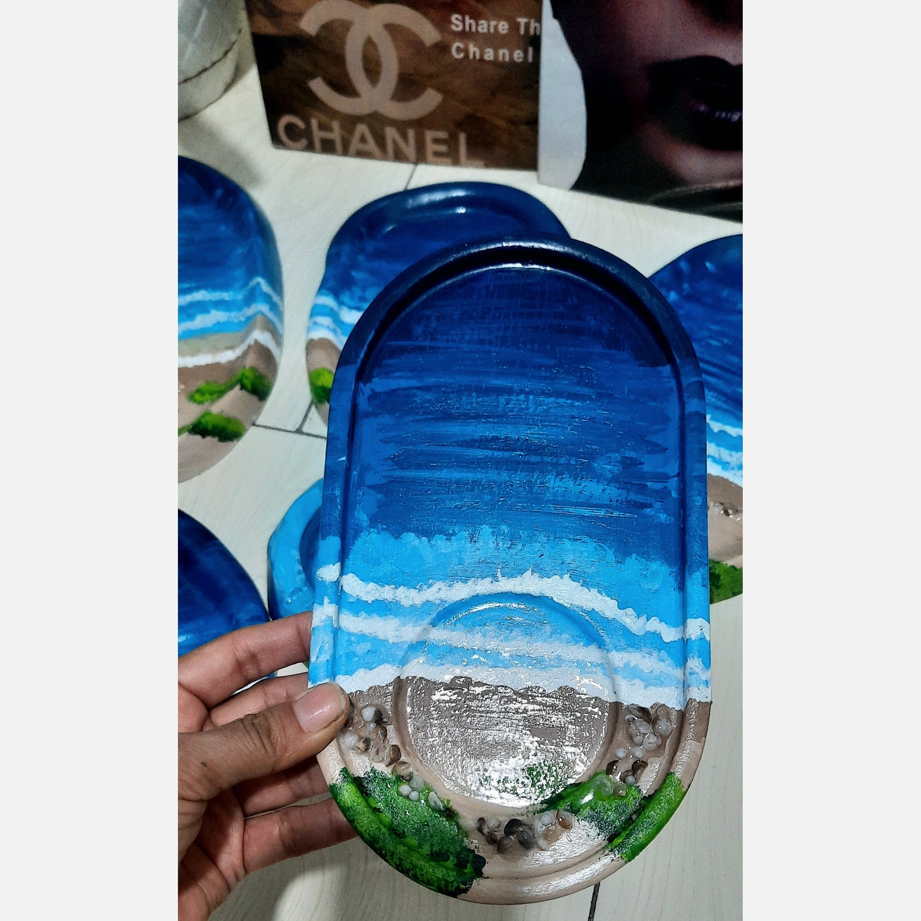 زیر لیوانی ،سینی،بشقاب دفرمه،جاسیگاری طرح دریا کارشده با صدف هاو گوش ماهی مینیاتوری طبیعی کاری خاص و بینظیر مناسب هدیه دادن طراحی هنر دست رنگ ضدآب و قابل شستشو صدفها با رزین محکم شده ومقاوم قابل سفارش در رنگ وطرح مورد نظر مشتری تولیدکننده محصولات سنگ مصنوعی هستم بی واسطه خرید کن جهت سفارش تعداد بیشتر چت باسلام درخدمتم قیمت ها بشقاب دفرمه هرعدد 85000 سینی دفرمه هر عدد 130000 زیرلیوانی بیضی 85000 جاسیگاری 65000 لطفا قبل واریز موجودی بگیرید