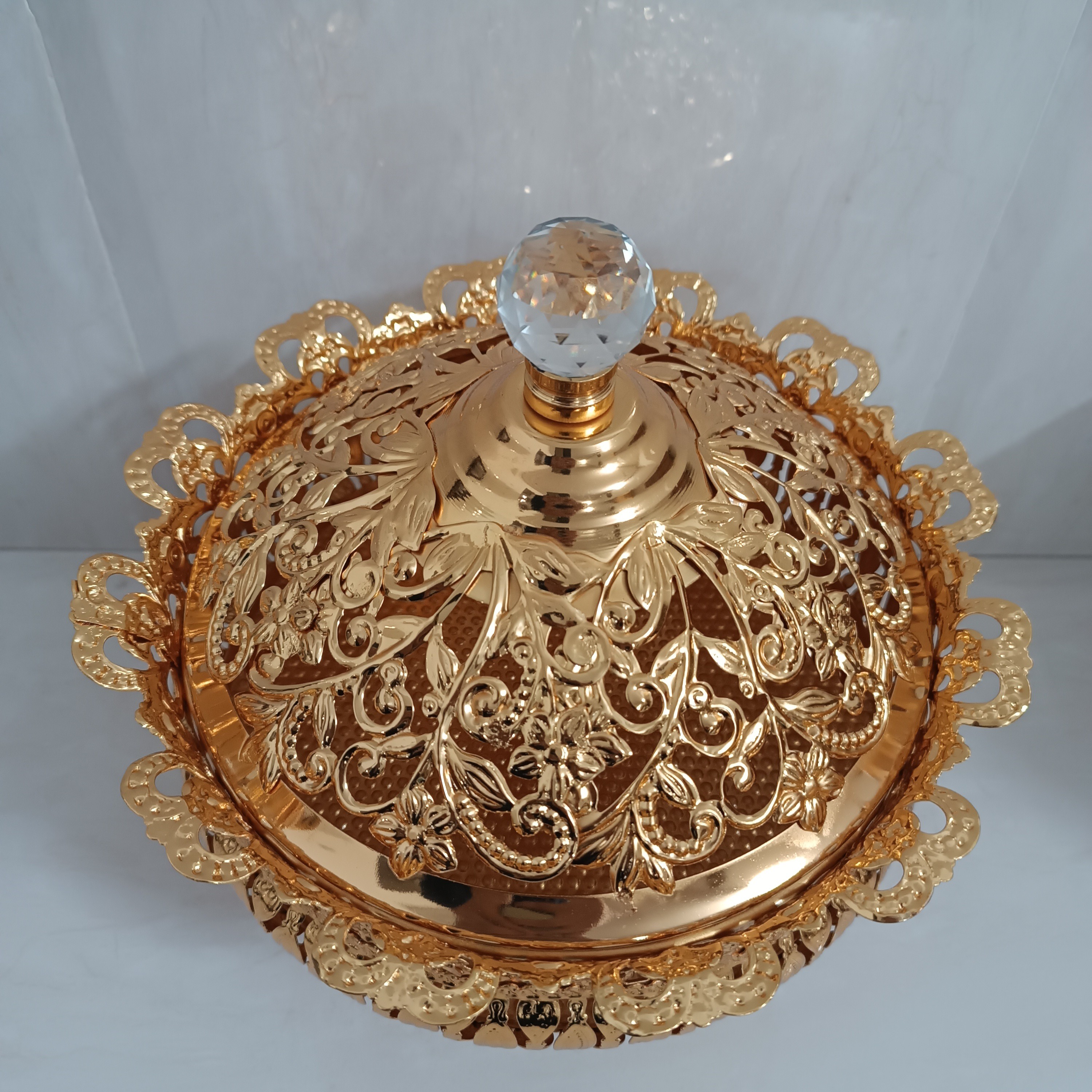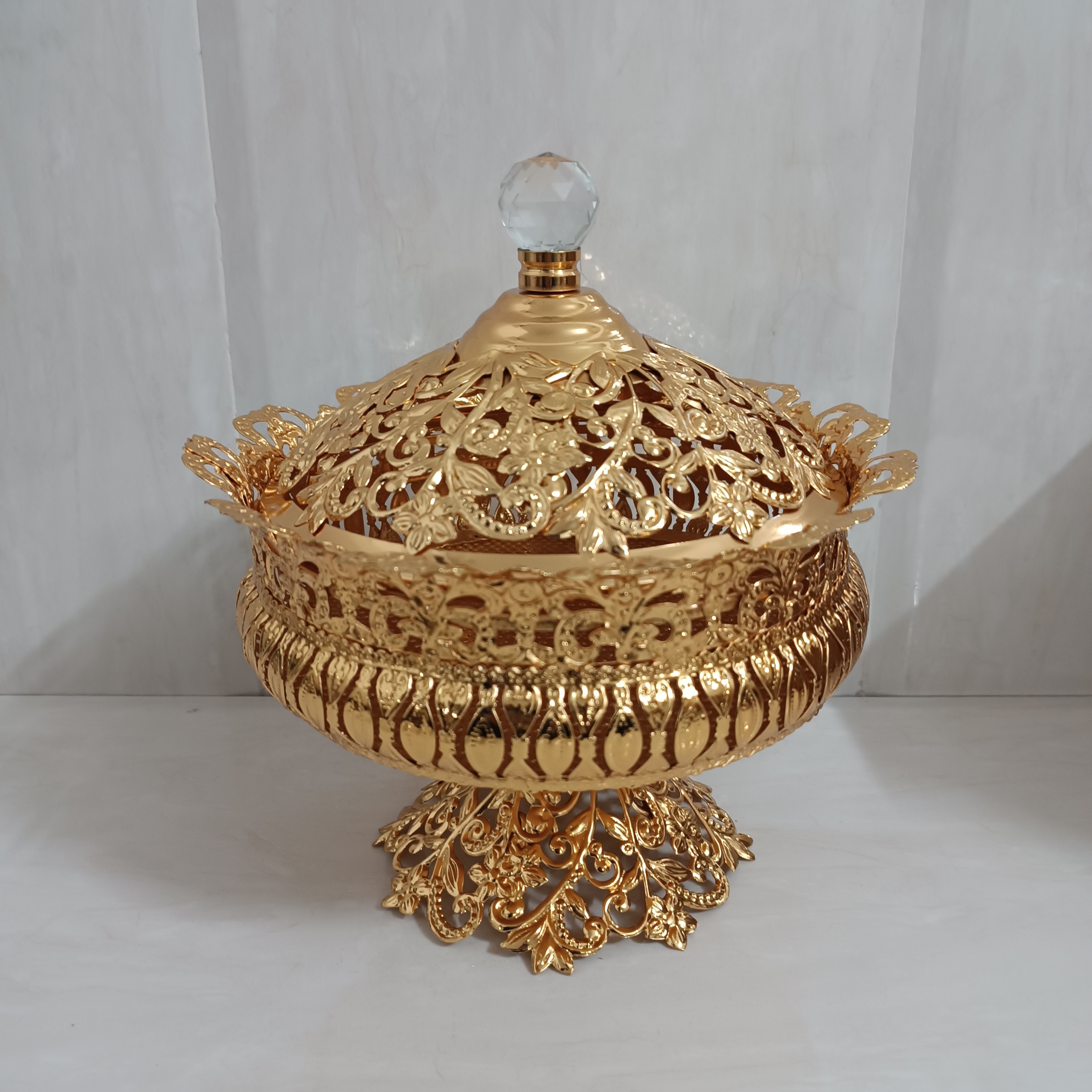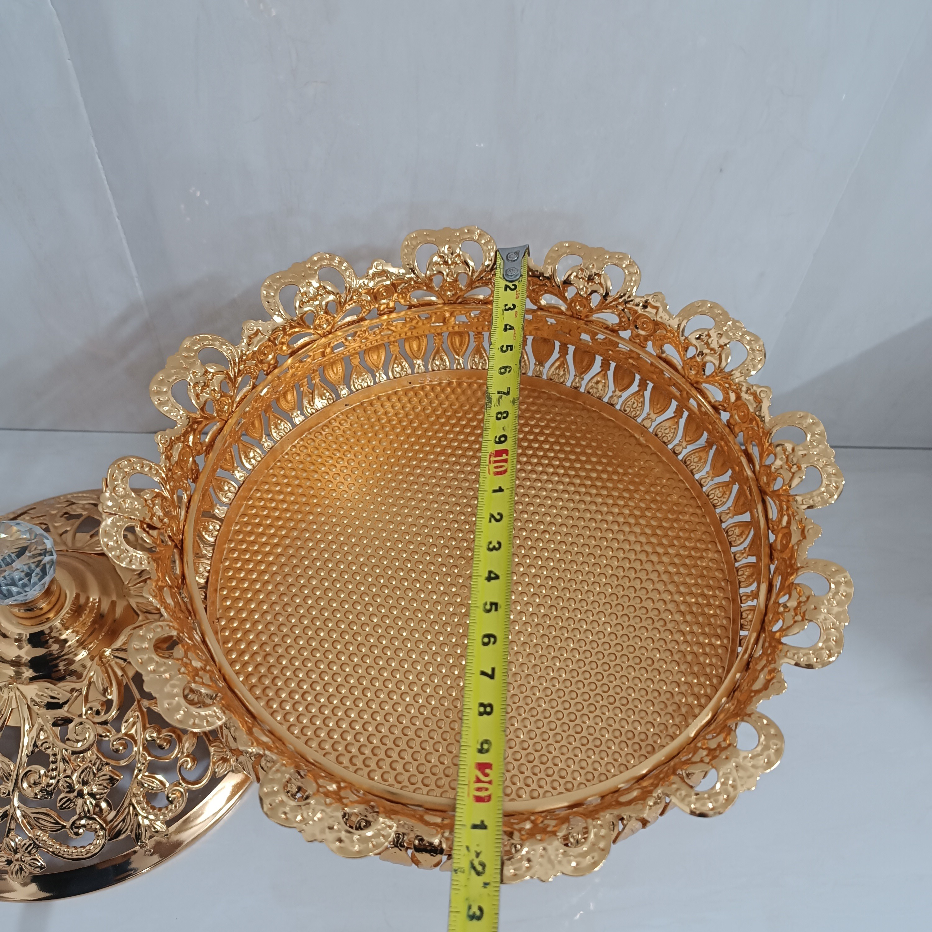 آجیل خوری سیلور پایه دار ماهان طلایی کیفیت عالی مناسب برای شکلات و آجیل و شیرینی و بیسکوییت و ... کاربردی و زیبا ... مناسب برای جهیزیه عروس و دکوری کادویی فوق العاده زیبا ابعاد قطر 23 _ ارتفاع 16 سانت
