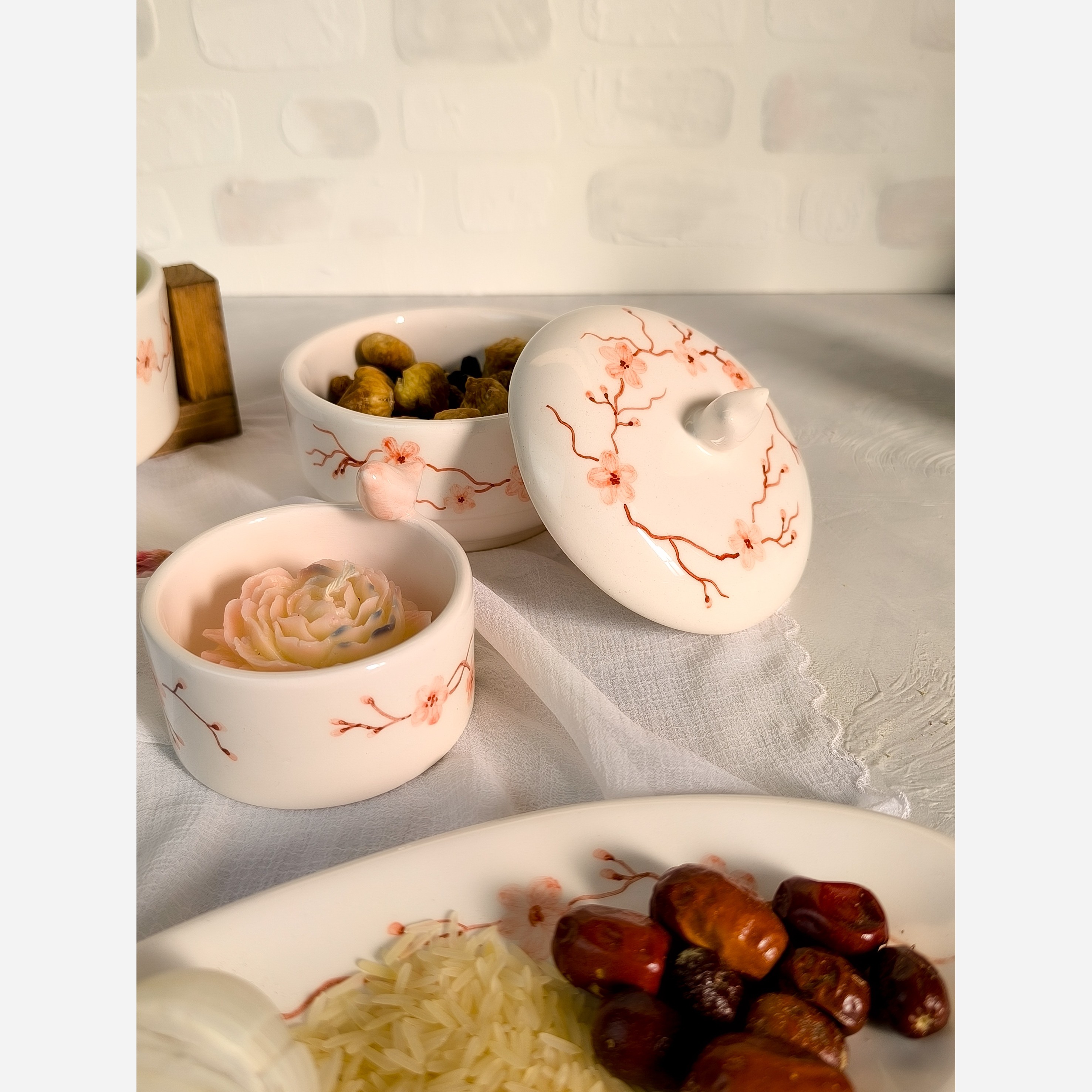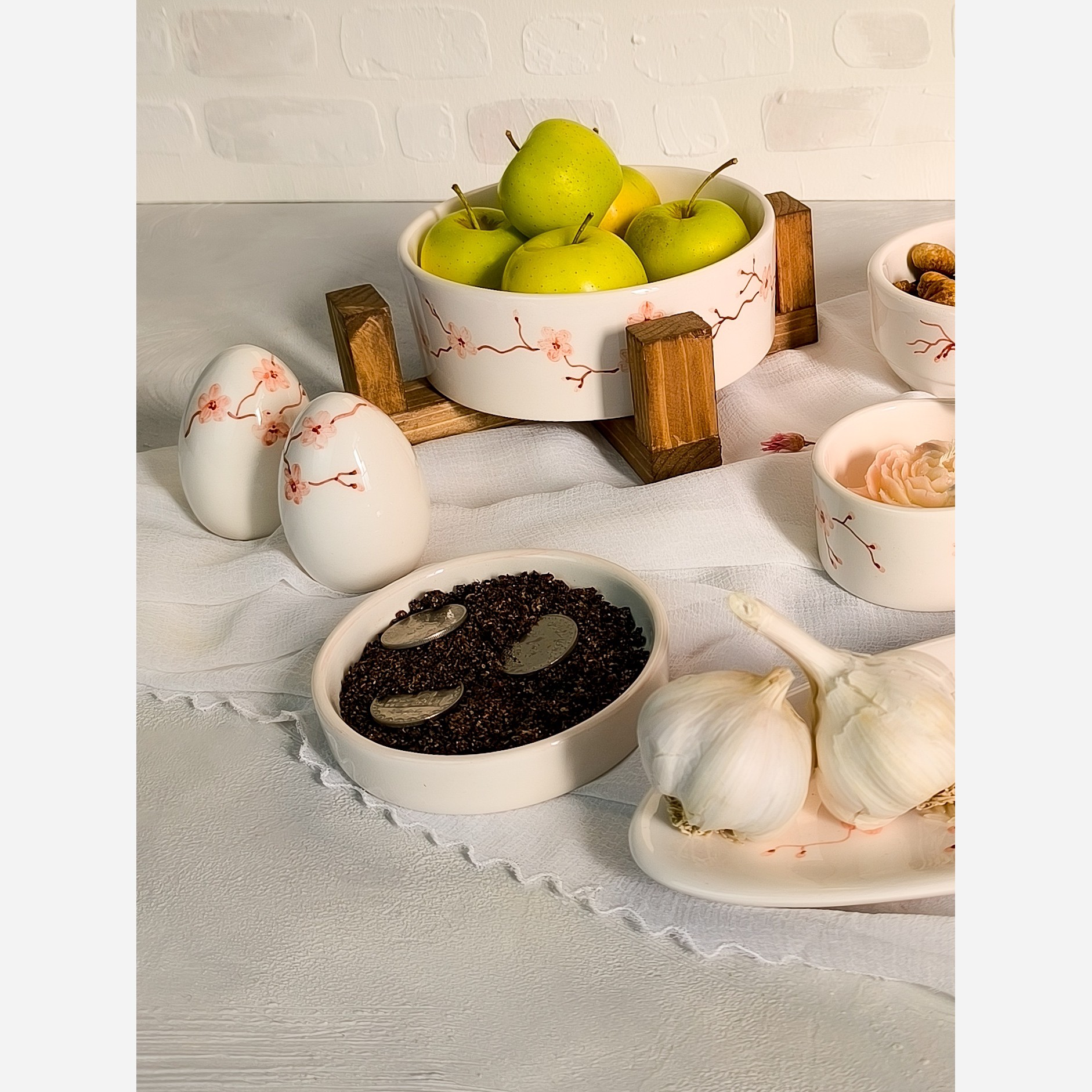 هفت سین زیبا و کاربردی که شامل ظرف های زیر است : یک دیس بیضی ، یک قندان یا شکلات خوری گرد ، یک کاسه 9 سانتی برای سمنو و ...شمعی ،دو عدد تخم مرغ ، یک کاسه 17 سانت و یکپایه چوبی، یک بشقاب 11 سانتی به عنوان یک ست جمع و جور برای میرهای کم جا بهترین گزینه است ظرف های این ست کاربرد مختلف دارند و میتونید ظرف ها رو برای همیشه استفاده کنید طرح بهاری ظرف ها آرامش بهار رو هدیه میده طراحی ست با چوب زیبایی سرامیک رو دوبرابر کرده