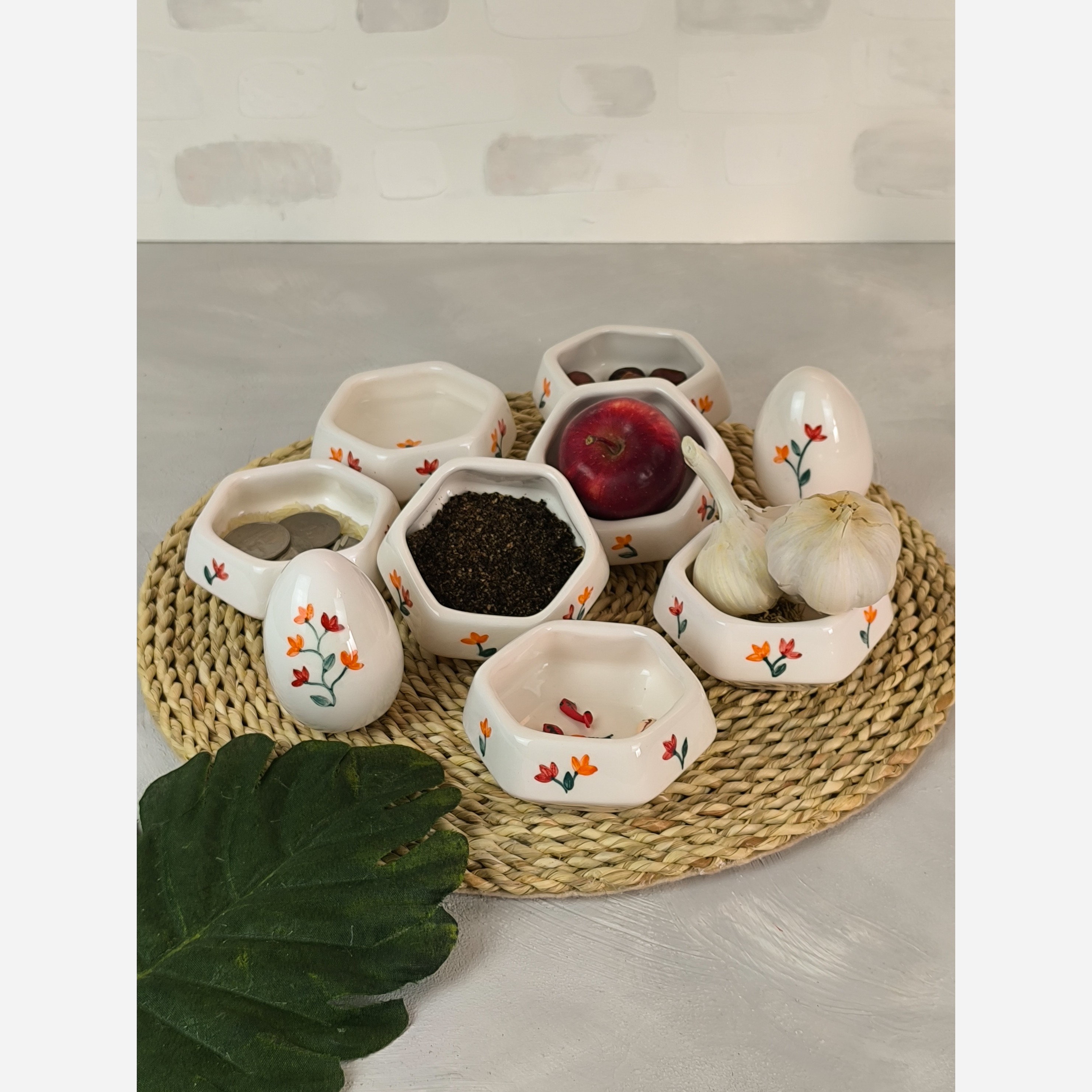 6 ضلعی بودن ظرف ها باعث میشه به راحی کنار هم قرار بگیرند و این زیبایی خاصی به میز شما بده ظرف ها کاملا قابل شست و شو و مناسب استفاده روزمره هم هست طرح مینیمال ظرف ها از زیباترین طرح گل های طبیعت الهام گرفته و محیط خونه و میز پذیرایی شما رو با طروات میکنه