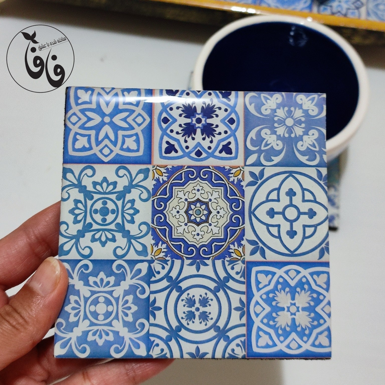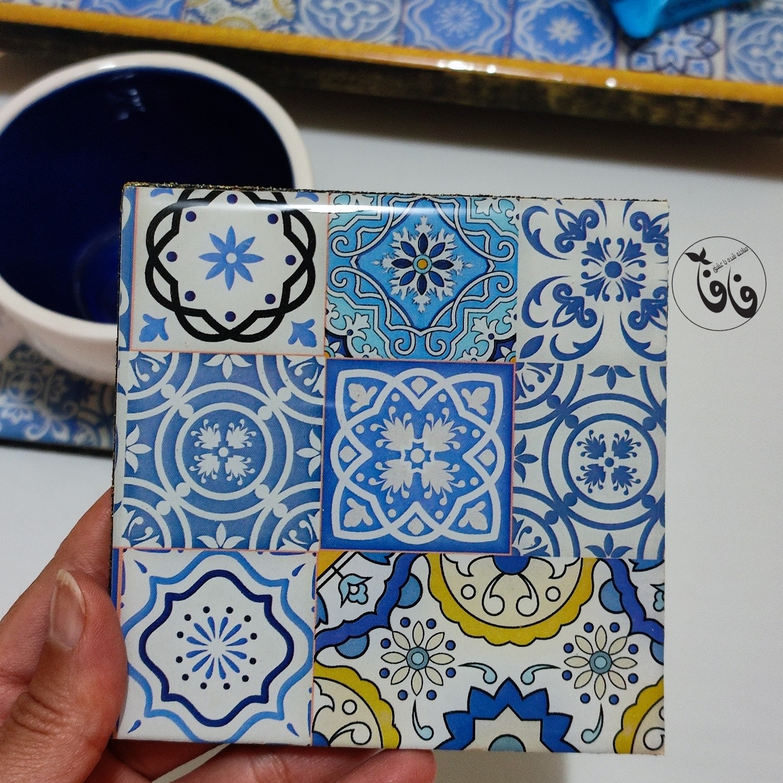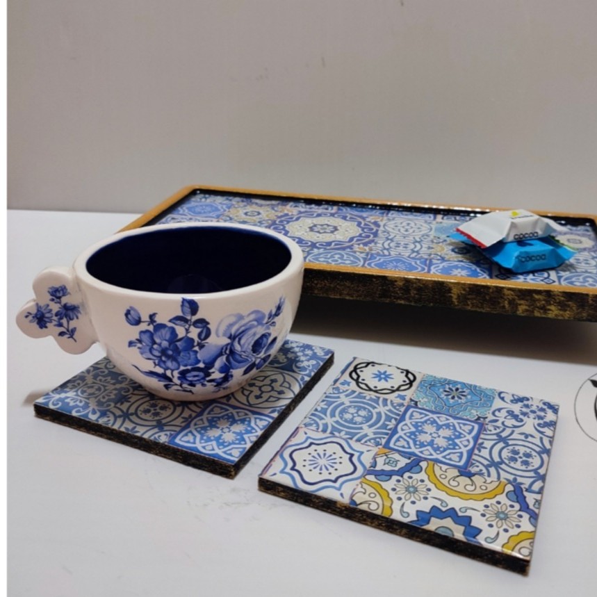 این ست سینی و زیرلیوانی با طرح سنتی آبی رنگ تزیین شده است و با یک لایه رزین پوشیده شده است که سطح کار را براق کرده است. پایه های رنگ ثابت طلایی رنگ برای سینی استفاده شده است که سینی رو شیککرده است. لبه سنی که طلایی رنگ است با رزین پوشیده شده است
