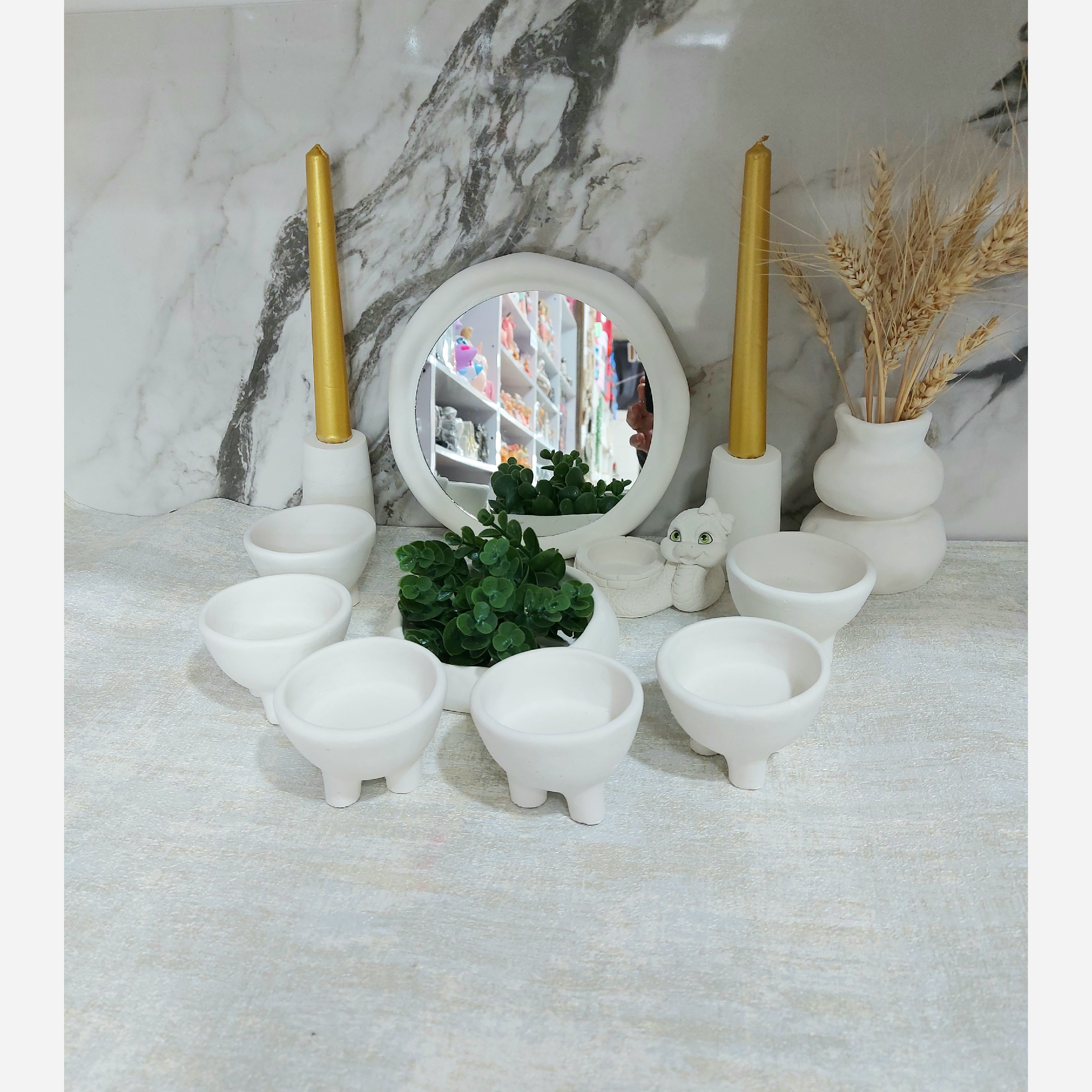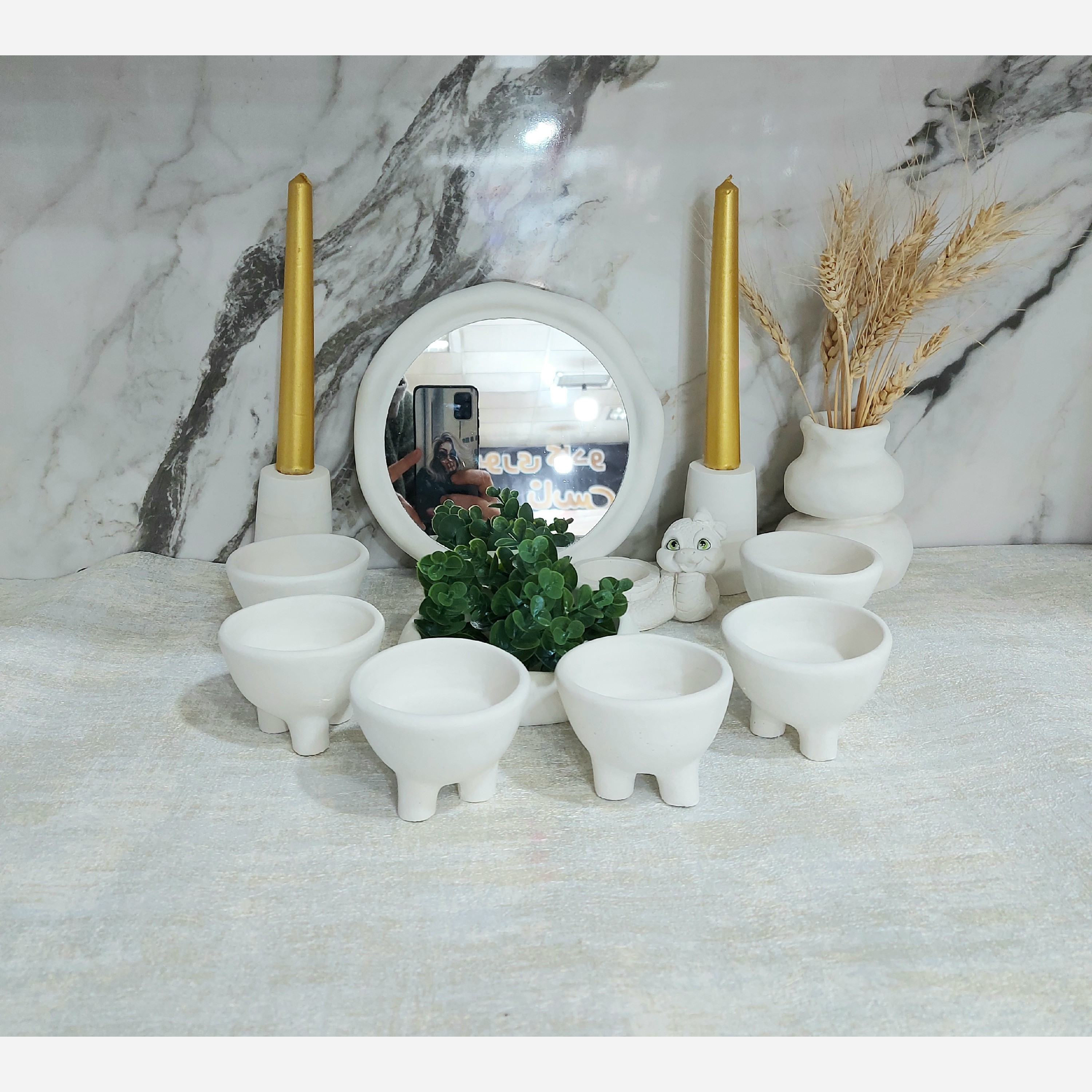 هفت سین گرد 3 پایه : همراه با آینه دفرمه 6تا ظرف و1عدد ظرف سبزه و 2تا جاشمعی