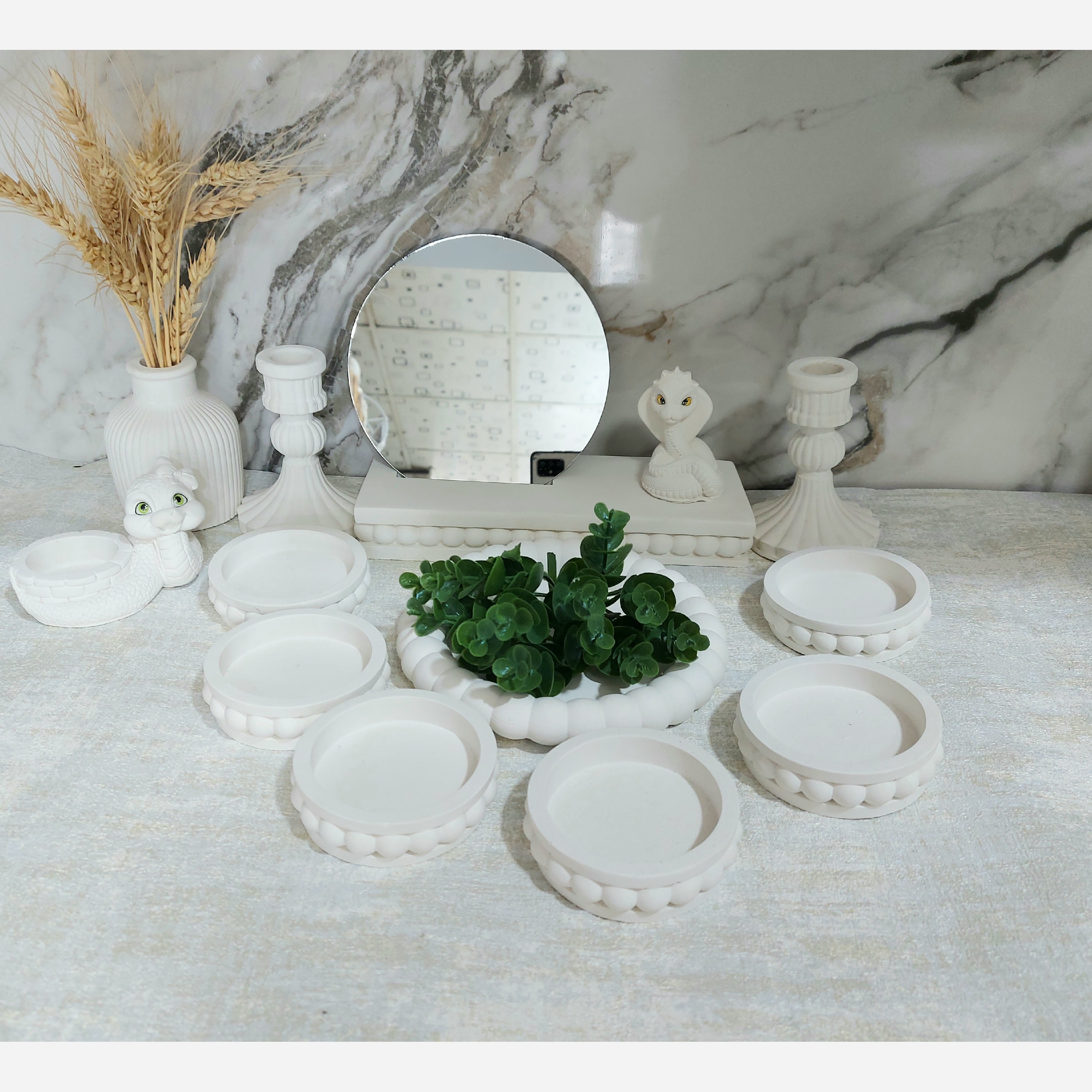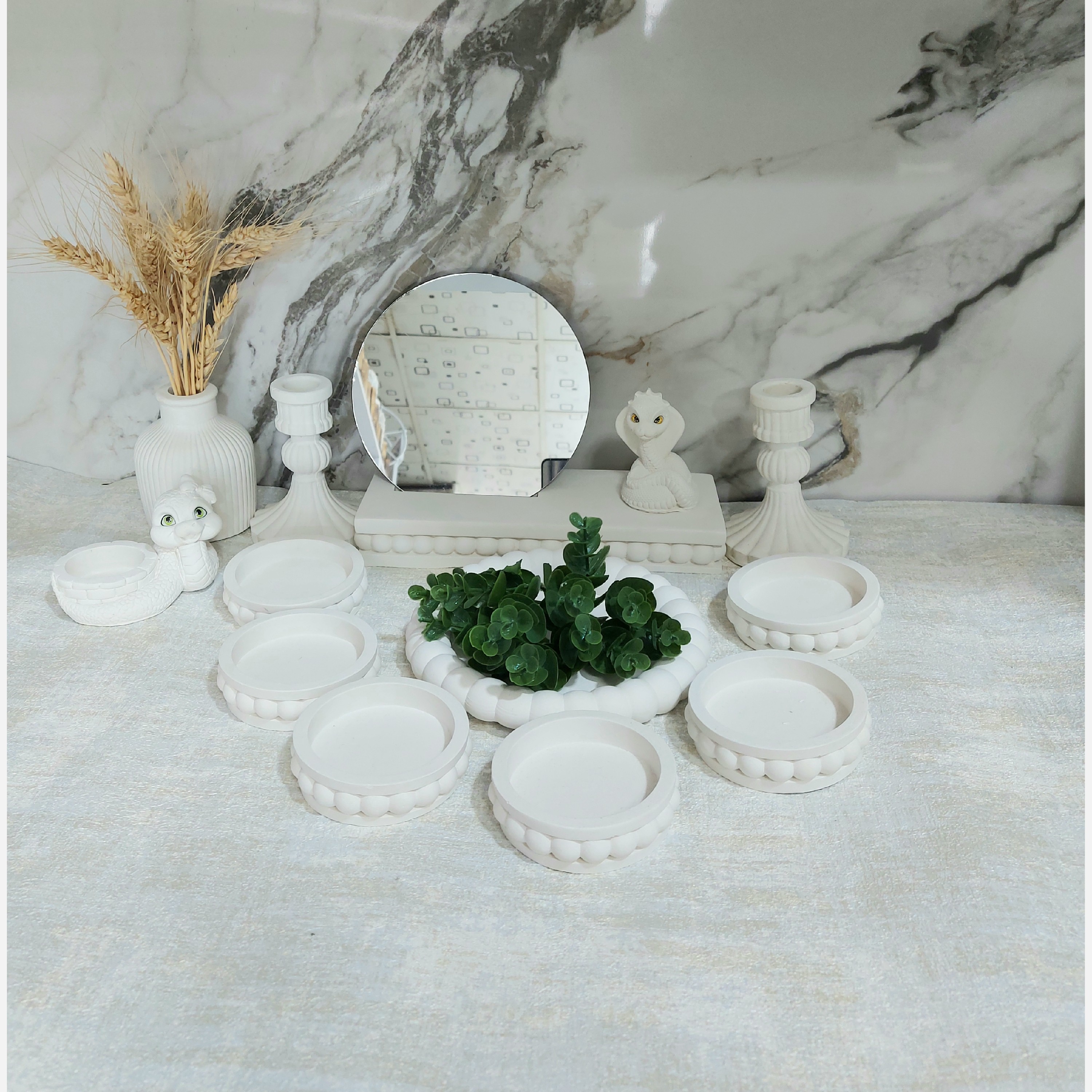 هفت سین گرد مروارید با پایه آینه و آینه و6تا ظرف گرد مروارید و2عدد شمعدان و1عددظرف سبزه