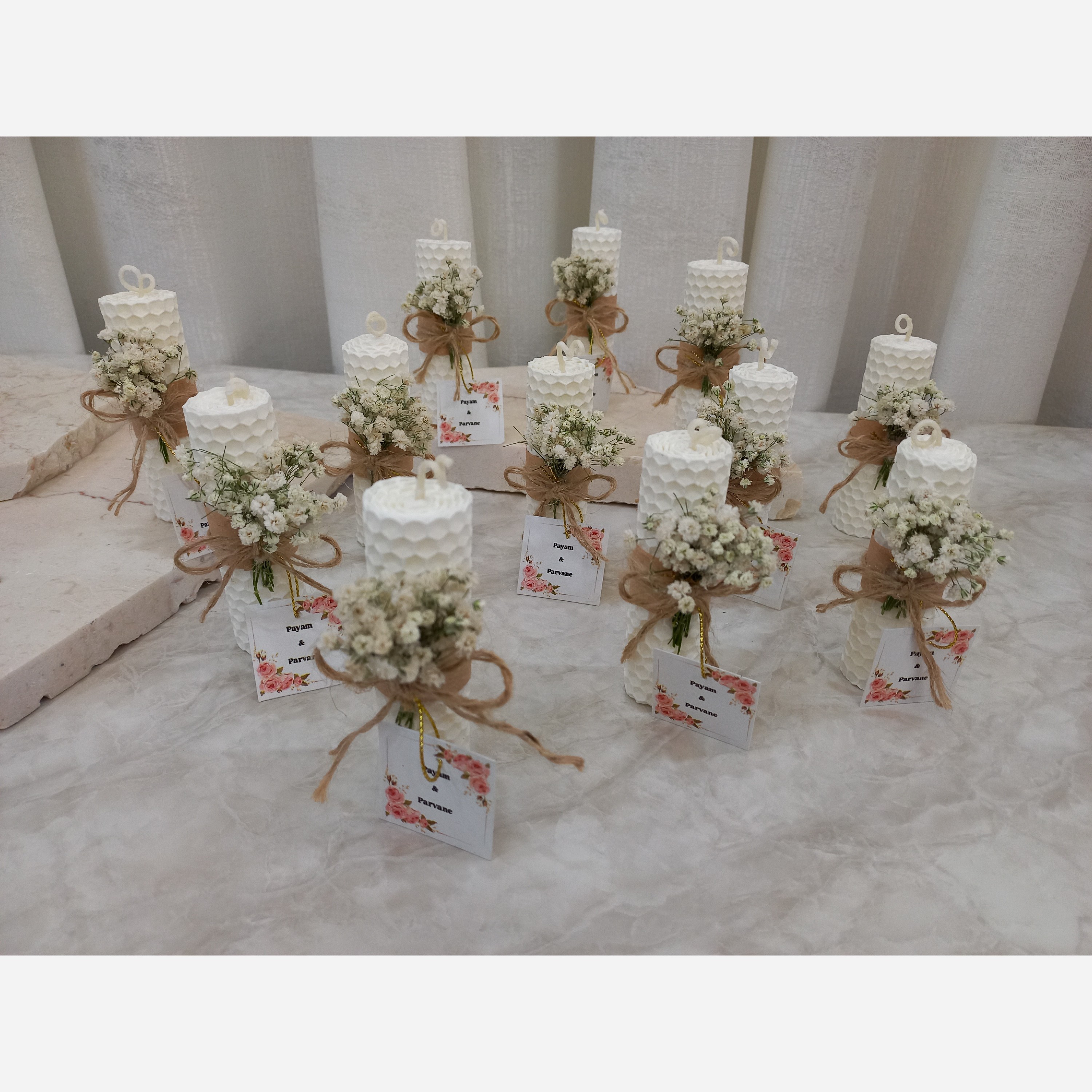 ارتفاع شمع 9 سانت دیزاین شده با گل خشک عروس و کنف.. میتونید گل مصنوعی هم سفارش بدید و رنگ شمع و گل قابل تغییر همراه با لیبل اختصاصی