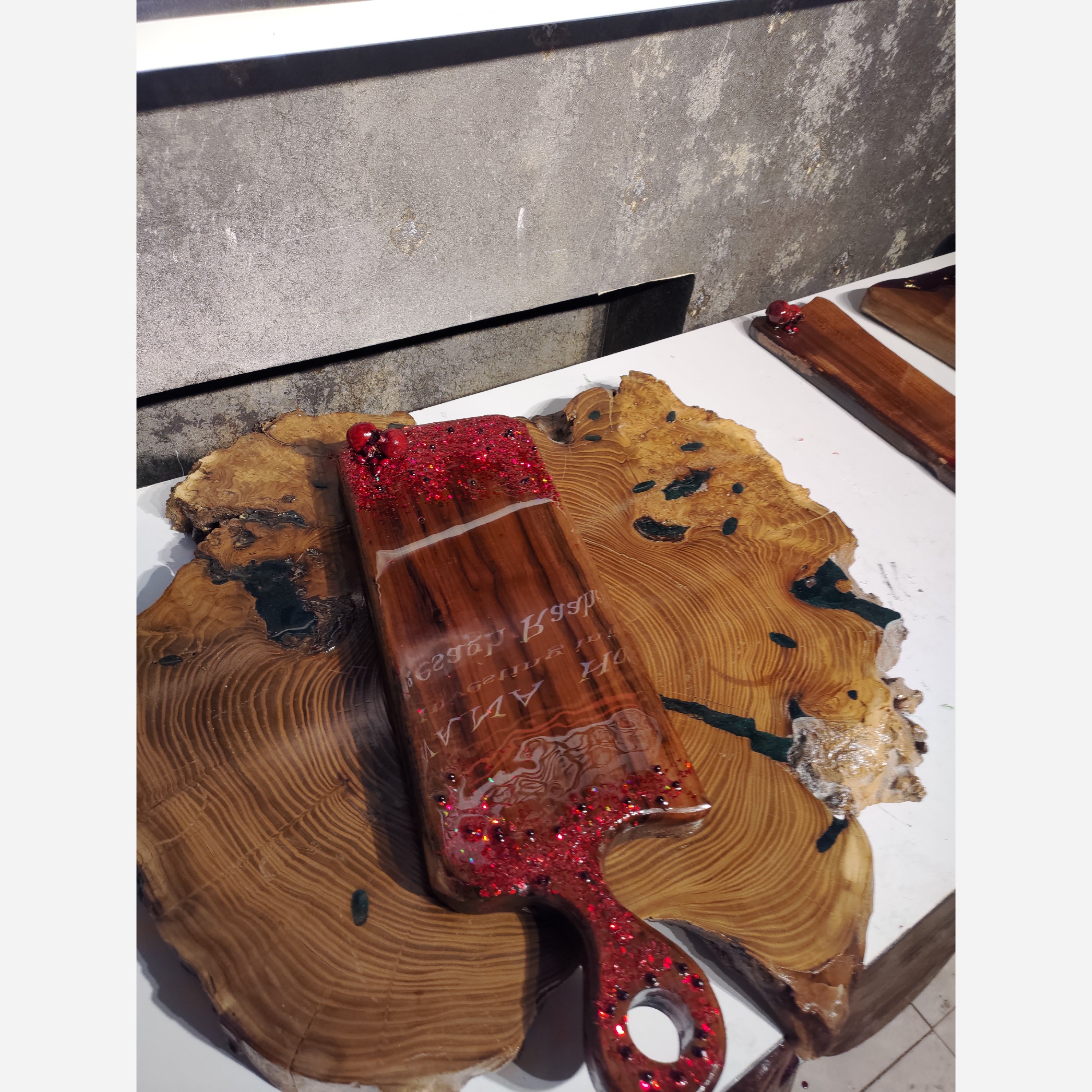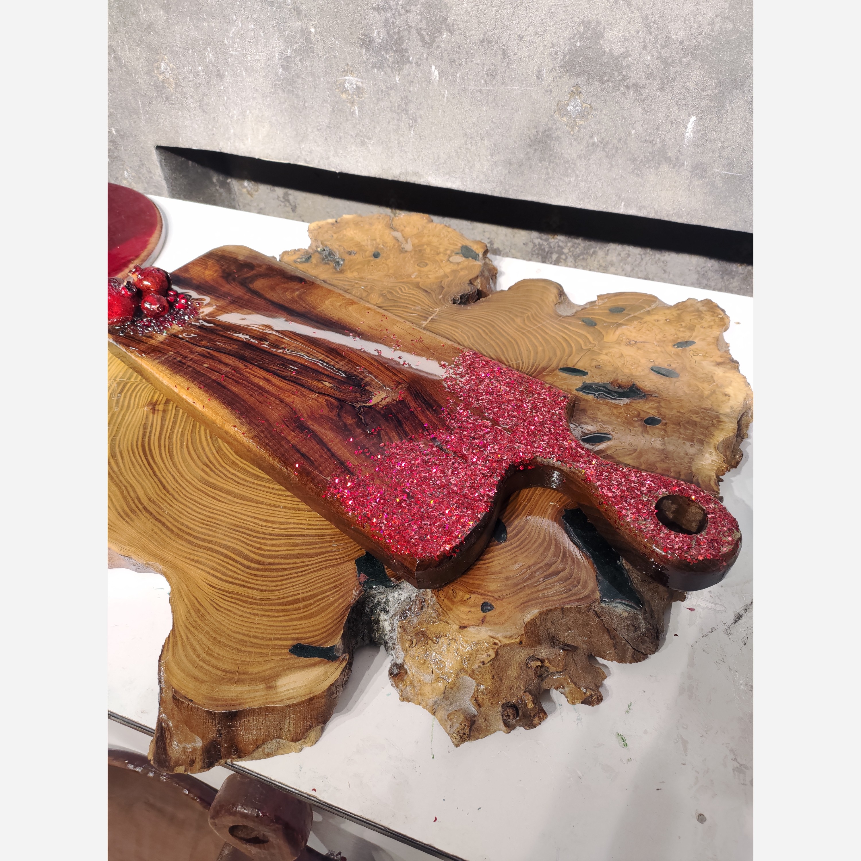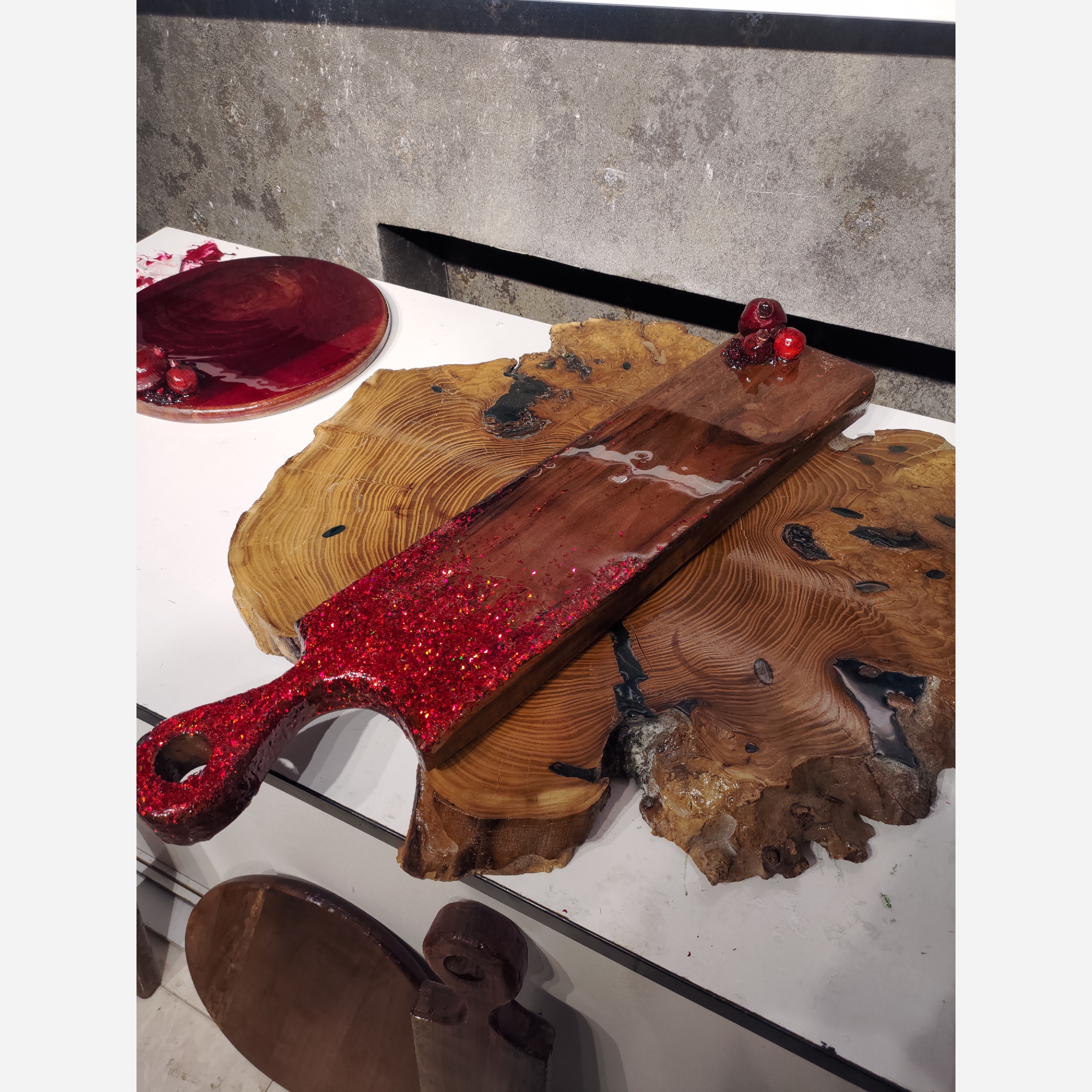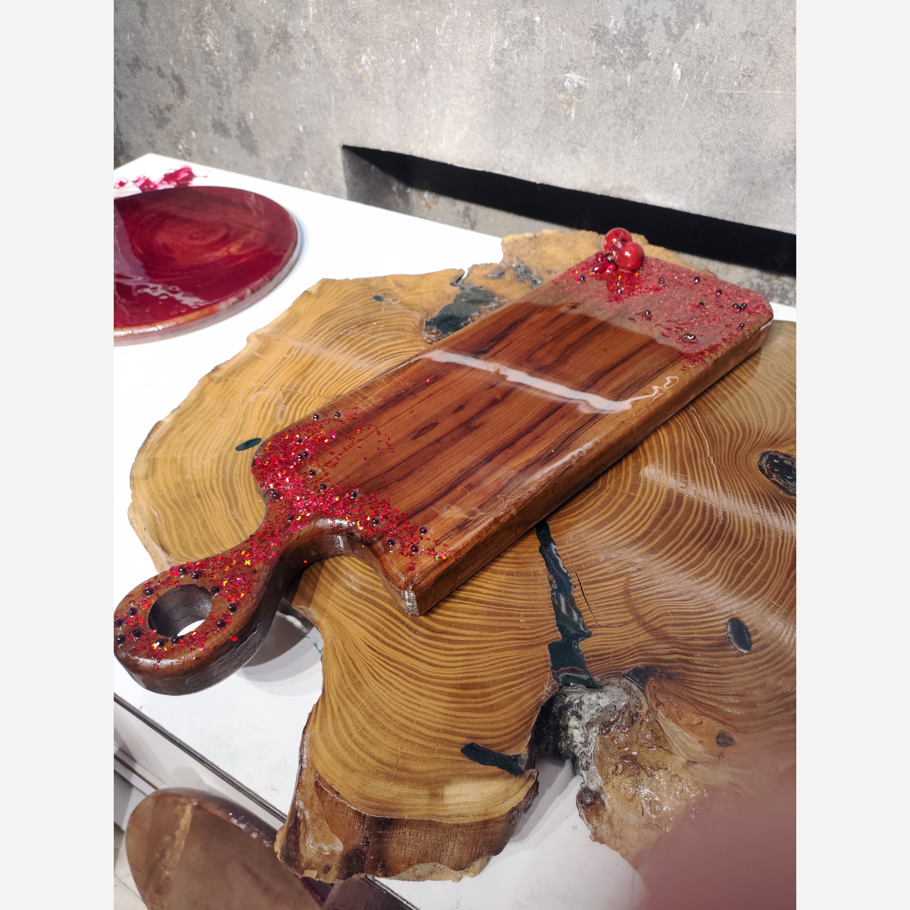 این تخته سرو های چوبی مستطیلی، با رزین یاقوتی رنگ، کریستال، اکلیل های قرمز دونه درشت، دونه های کریستالی، دونه های انار واقعی ساخته شده این تخته ها برای سرو فینگرفود،میوه های دکور شده، شیرینی و... مورد استفاده قرار میگیره