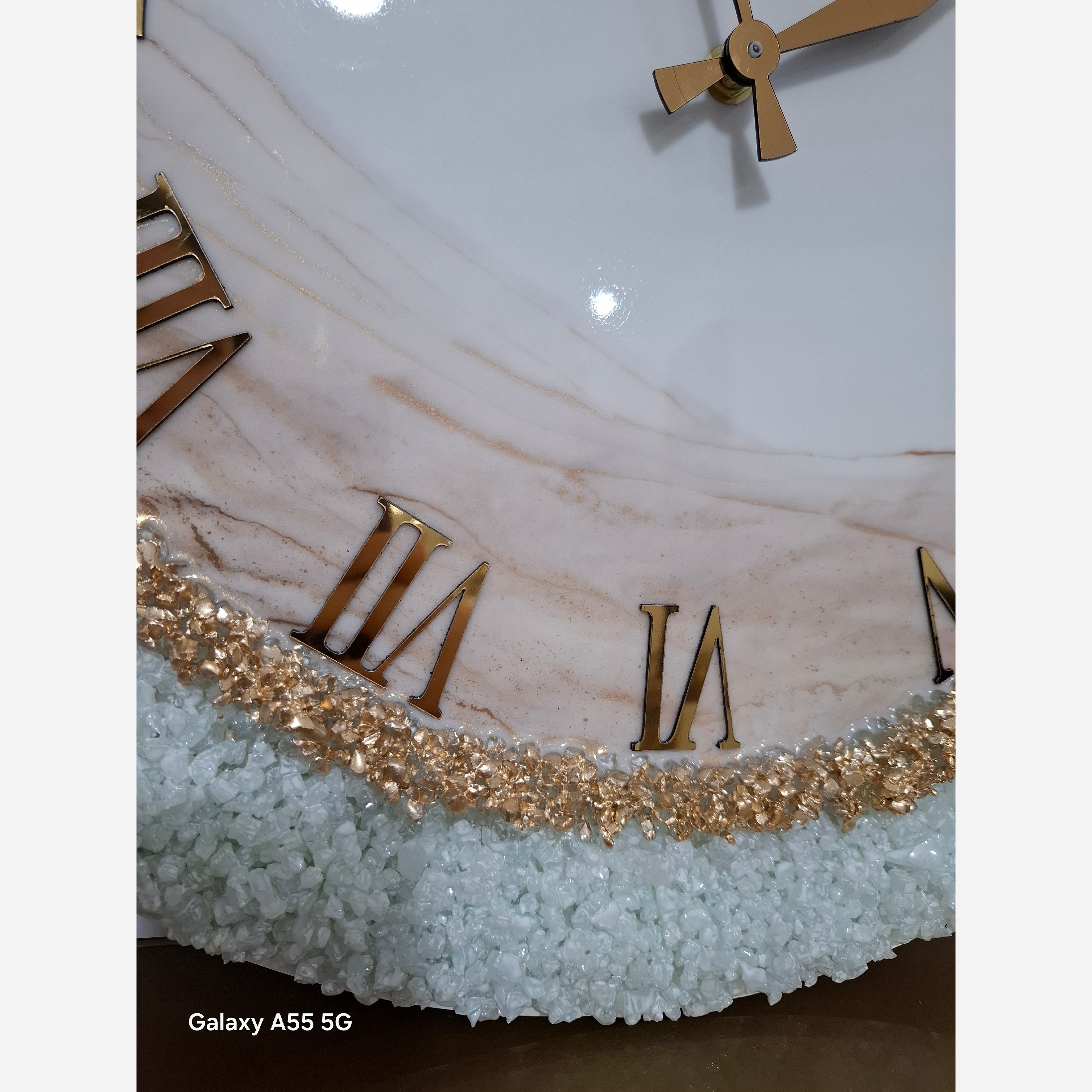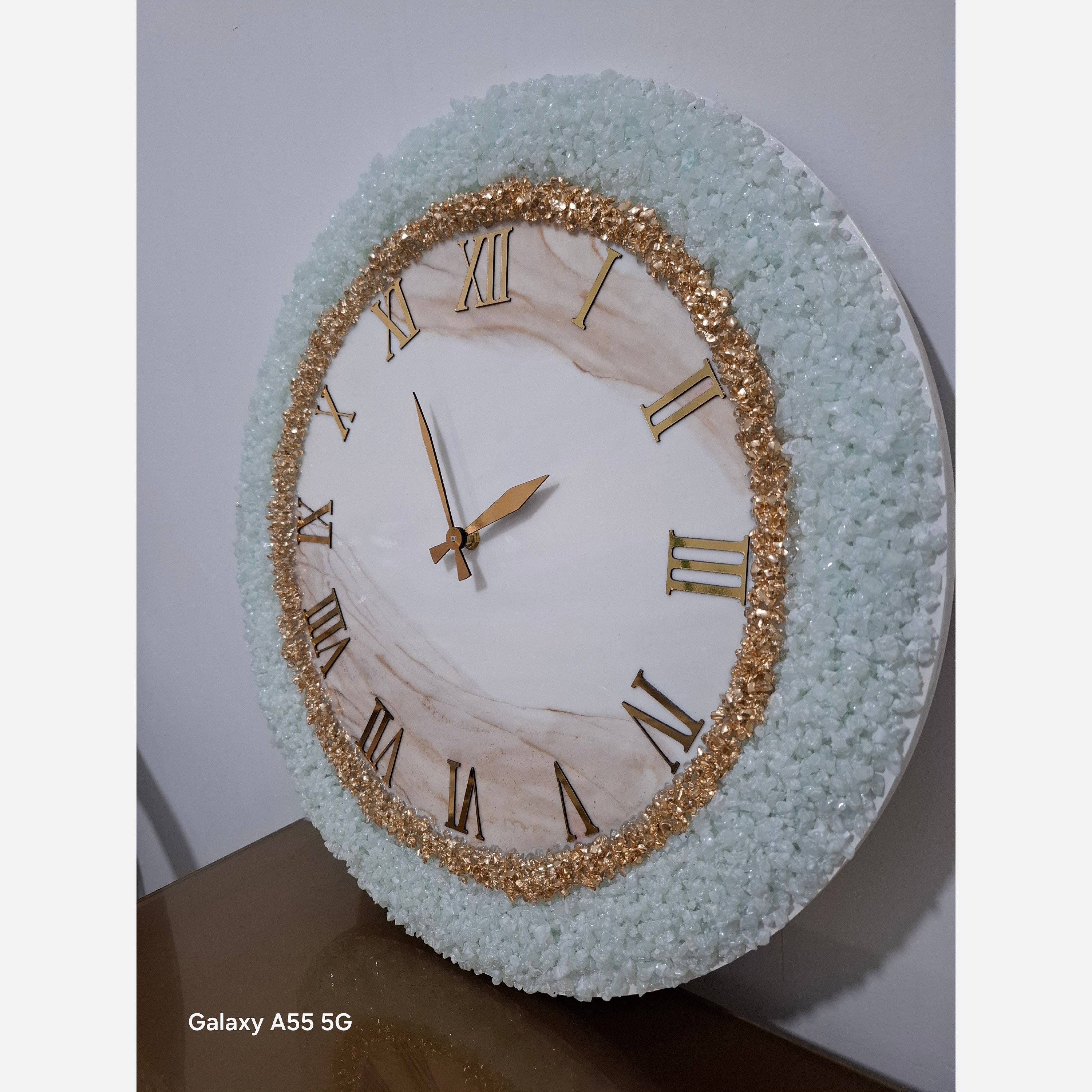 ساعت دیواری رزینی بسیاز زیبا مدل عروس سفید دور کارتمام کریستال کار شده اعدادوعقربه مولتی استایل موتور آرام گرد ام دی اف16میل عکس داخل تصویر قطر 50سانته