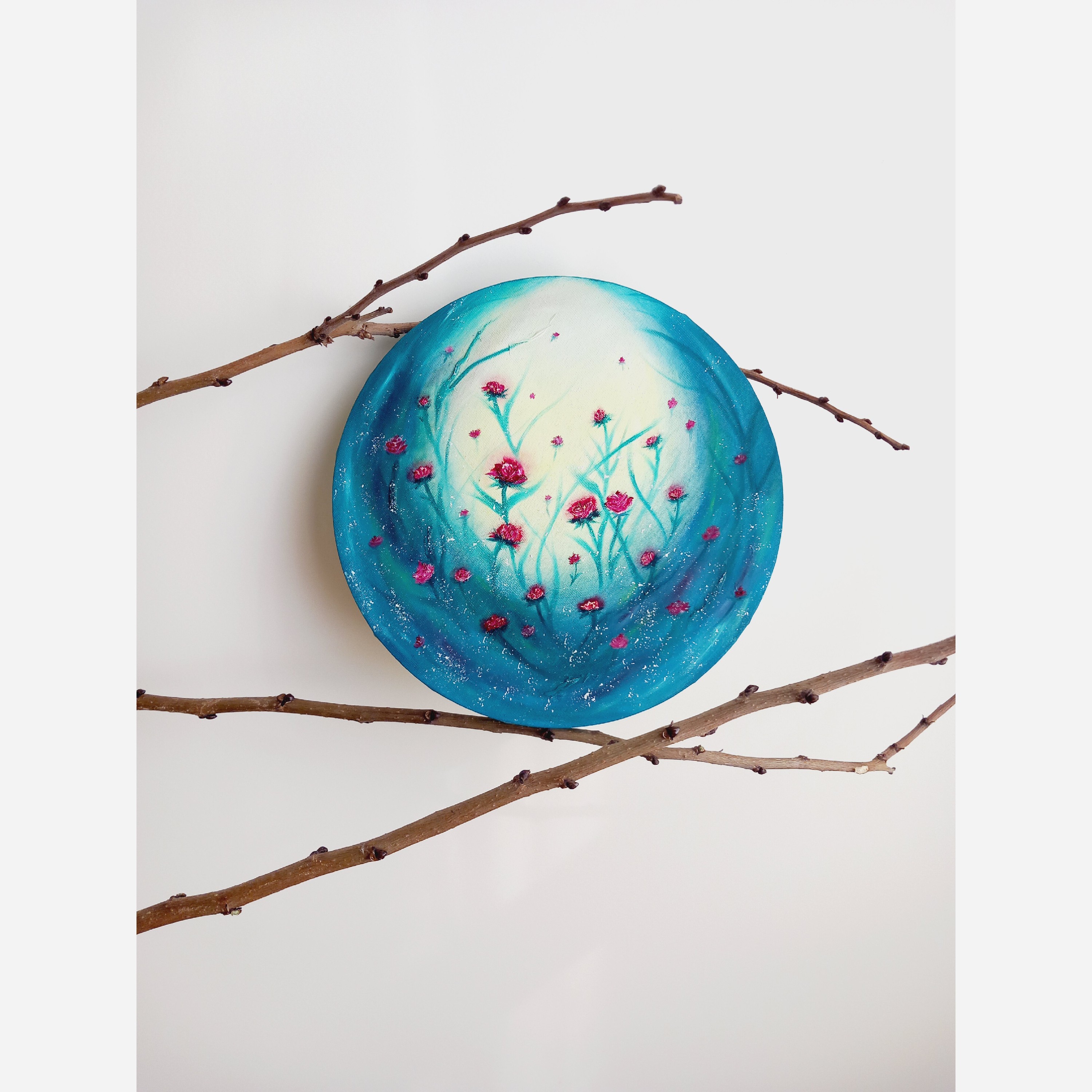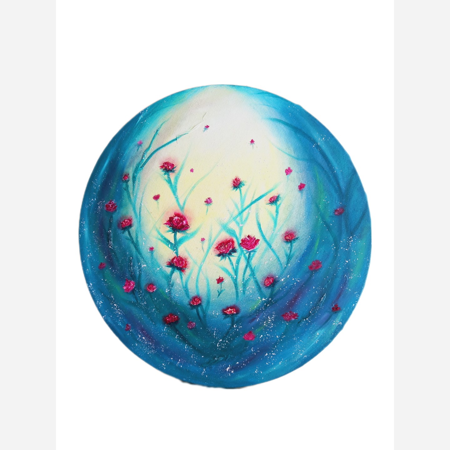 تابلو نقاشی رنگ روغن گل برجسته کار دست طرح پینترستی تابش نور به جنگل گل رز قطر 30 مبلمونسرا مدل 267390