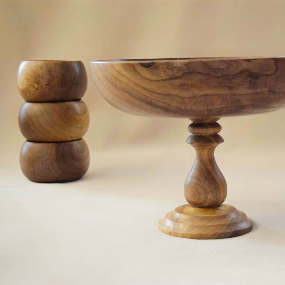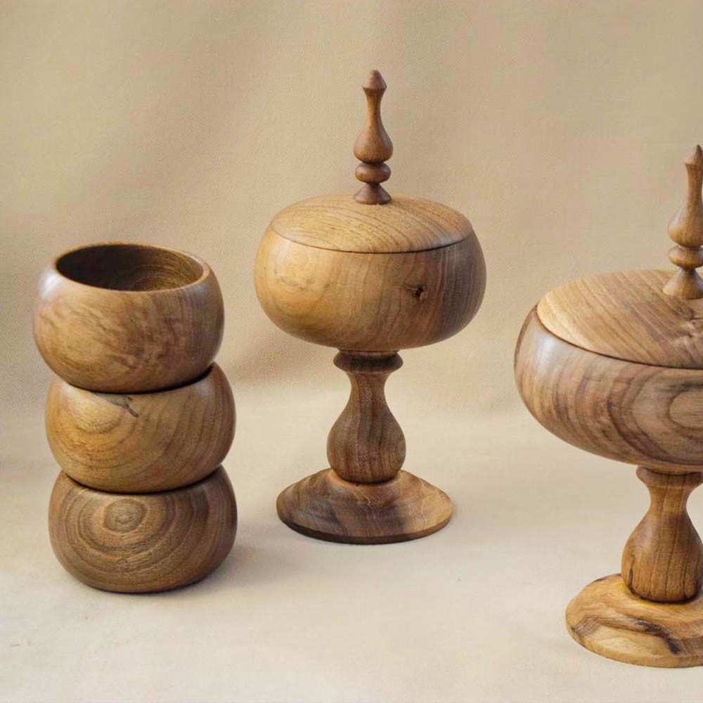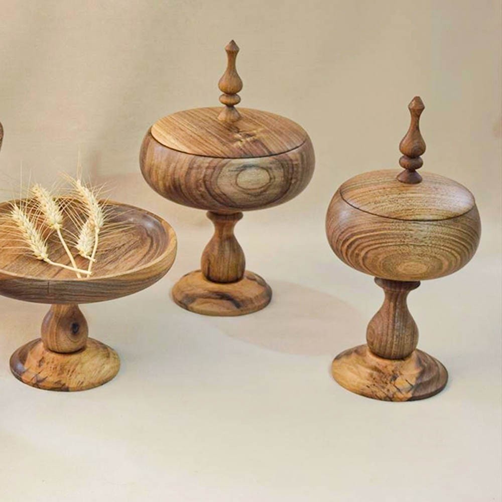 سرویس پذیرایی ساخته شده با چوب درخت گردو و روغنکاری شده با روغن مخصوص. این سرویس پذیرایی زیبا شامل شیرینی خوری، شکلات خوری، آجیل خوری، میوه خوری پایهدار و سه عدد کاسه خمرهای بوده و به علت استفاده از رنگ خوراکی برای پوشش سطح آن، هیج آسیبی از نظر استعمال مواد خوراکی در آن ندارد. سایز هر یک از محصولات موجود در این سرویس به شرح زیر می باشد : قطر شیرینی خوری : 24 سانتیمتر 1/450/000 تومان قطر شکلات خوری : 16 سانتیمتر 1/100/000تومان قطر آجیل خوری : 20 سانتیمتر 1/200/000تومان قطر میوه خوری : 28 سانتیمتر 1/850/000 قطر کاسه خمرهای : 12 سانتیمتر 190/000تومان