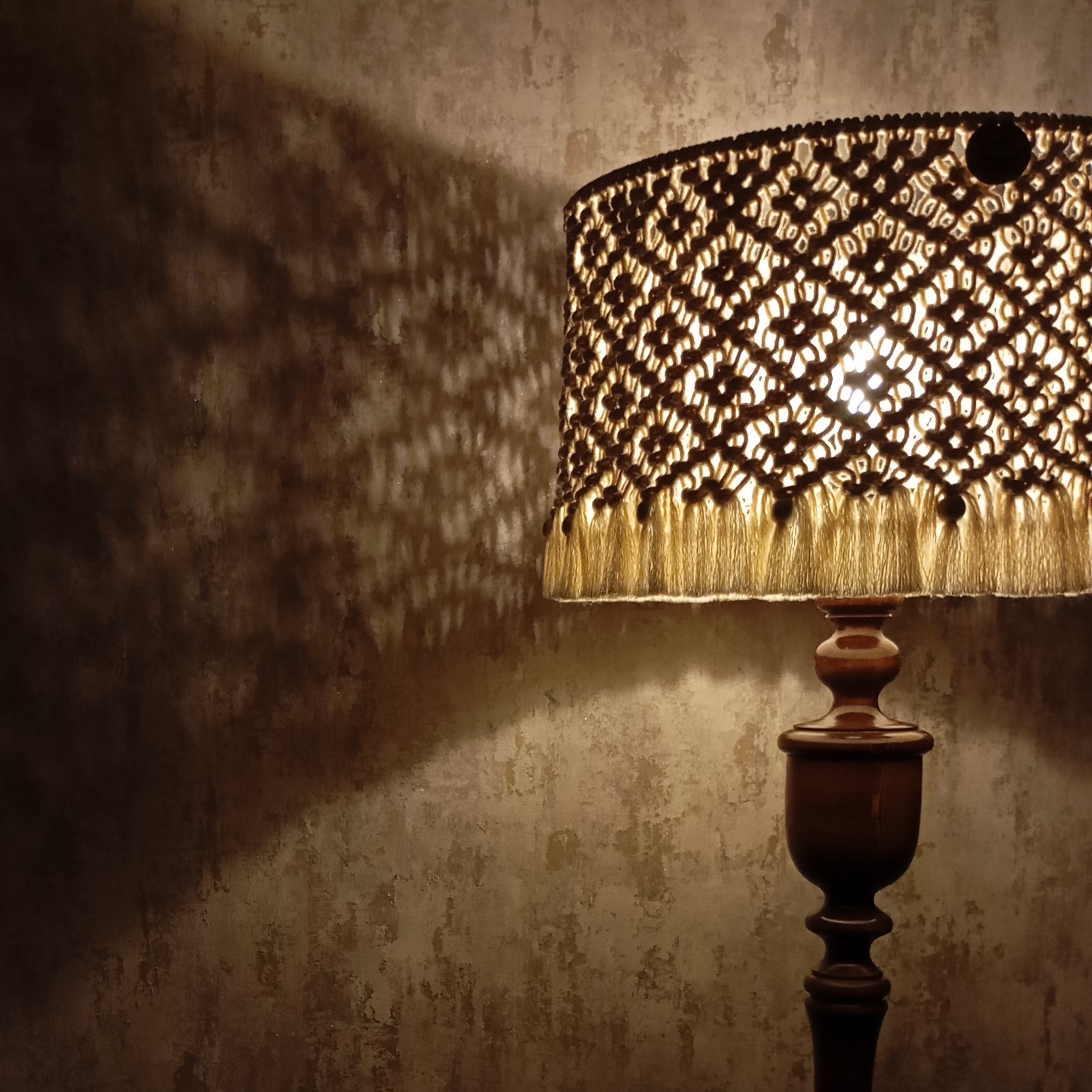 مکرومه بافت شده به همراه مهره های چوبی بافت مطابق تصویر قابل استفاده به صورت شید آباژور و لوستر قطر شید 45 سانتیمتر