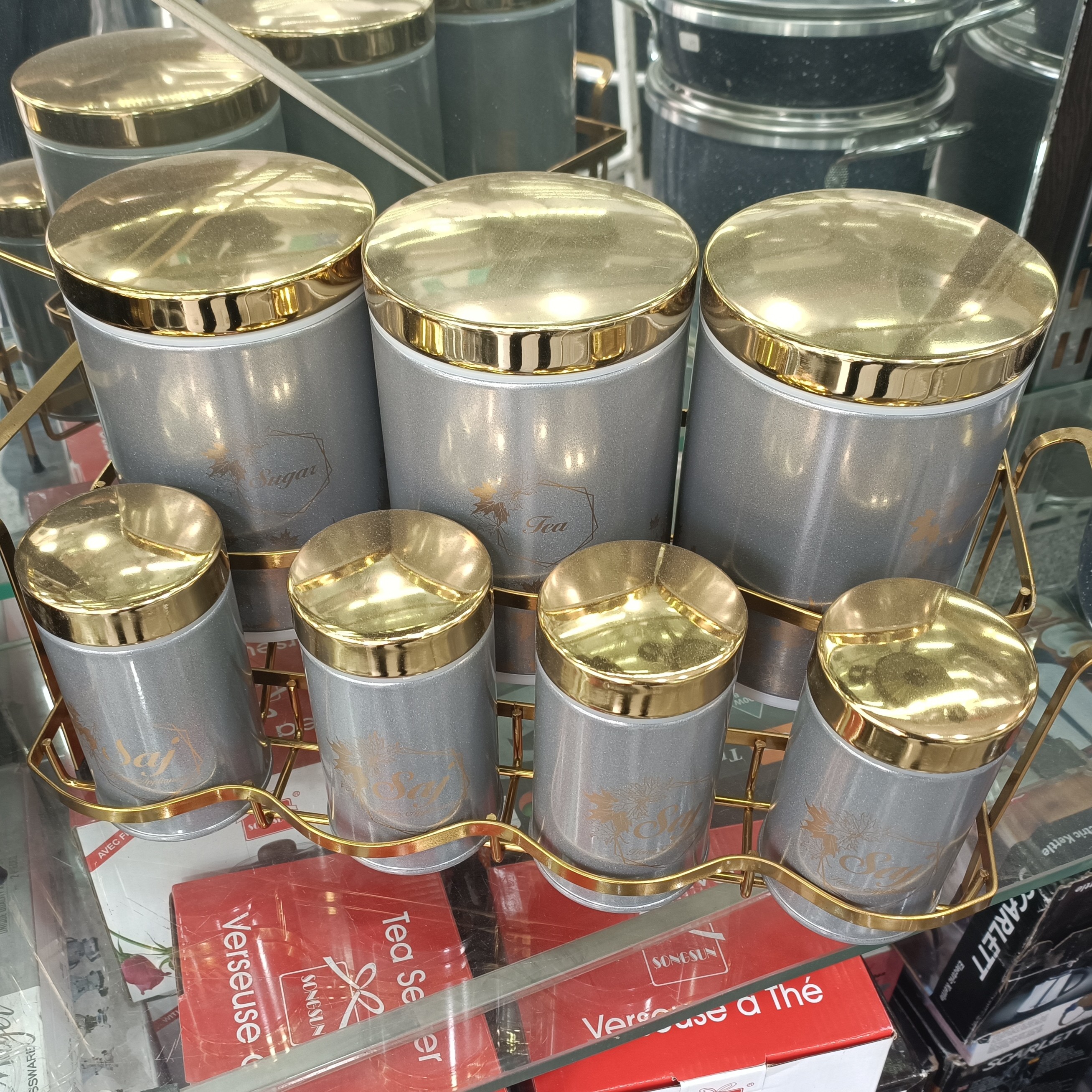 جادویه ای ساج 7 پارچه.شامل 4 عدد جا ادویه و سه عدد جای حبوبات جنس بدنه استیل ضد زنگ دارای سر طلایی رنگ و پایه طلایی رنگ قیمت باور نکردنی ارسال درب منزل رایگان