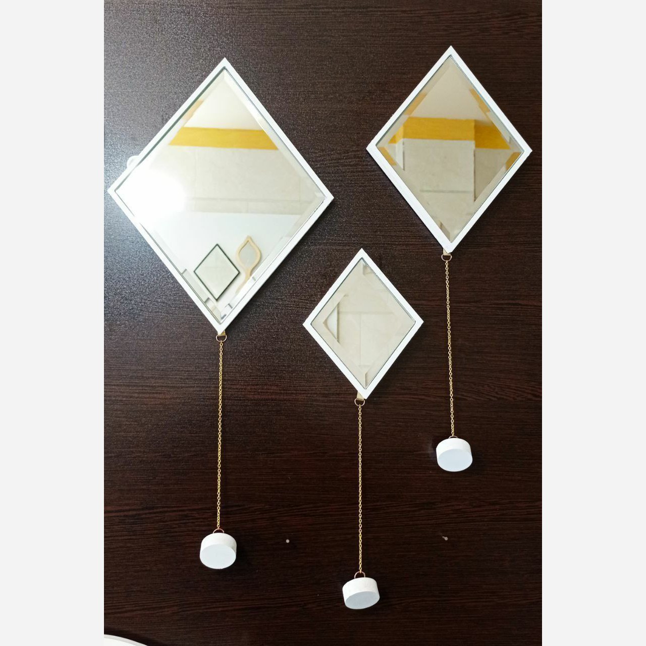 آینه دکوراتیو لوزی آویز دار آینه دیوارکوب لوزی 3عددی آینه دیواری دکوری 3تایی لوزی مبلمونسرا مدل 260950
