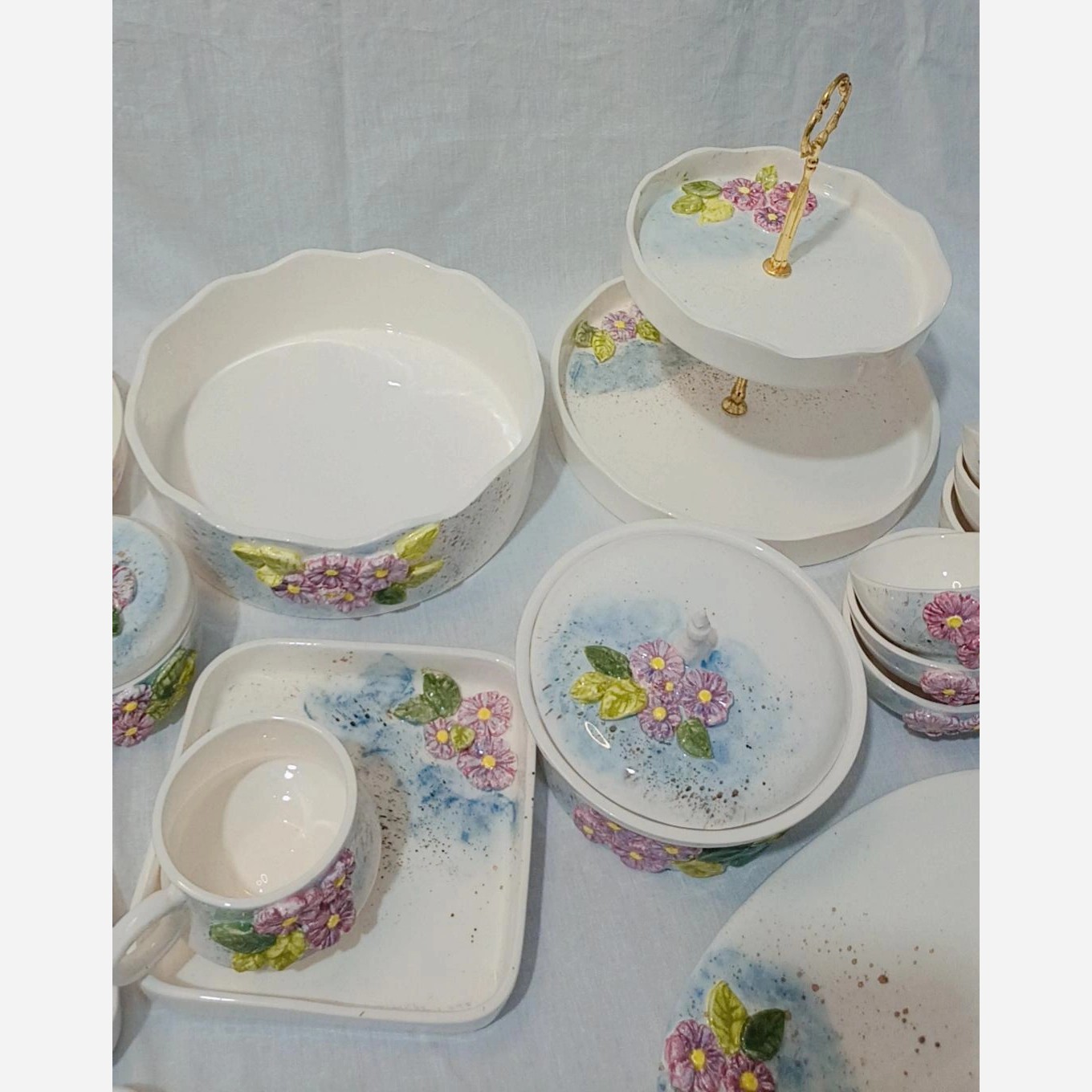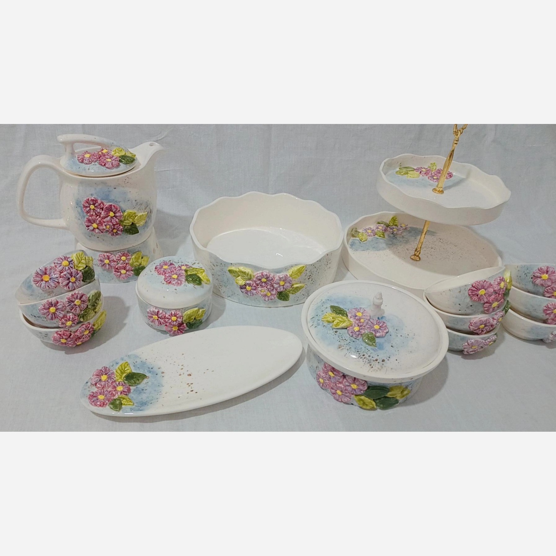 سرویس پذیرایی سرامیکی برند رایکا دستساز گل بهاری نقش برجسته زمینه آبرنگی قابل استفاده در م.ظ قابل استفاده در فر قیمت برای اقلام زیر👇 ✅فنجان دوعدد ✅زیرفنجانی دوعدد ✅قندان ✅کره خوری ✅قوری ووارمر ✅سوشی خوری ✅شکرپاش مابقی اقلام جداگانه محاسبه میشود