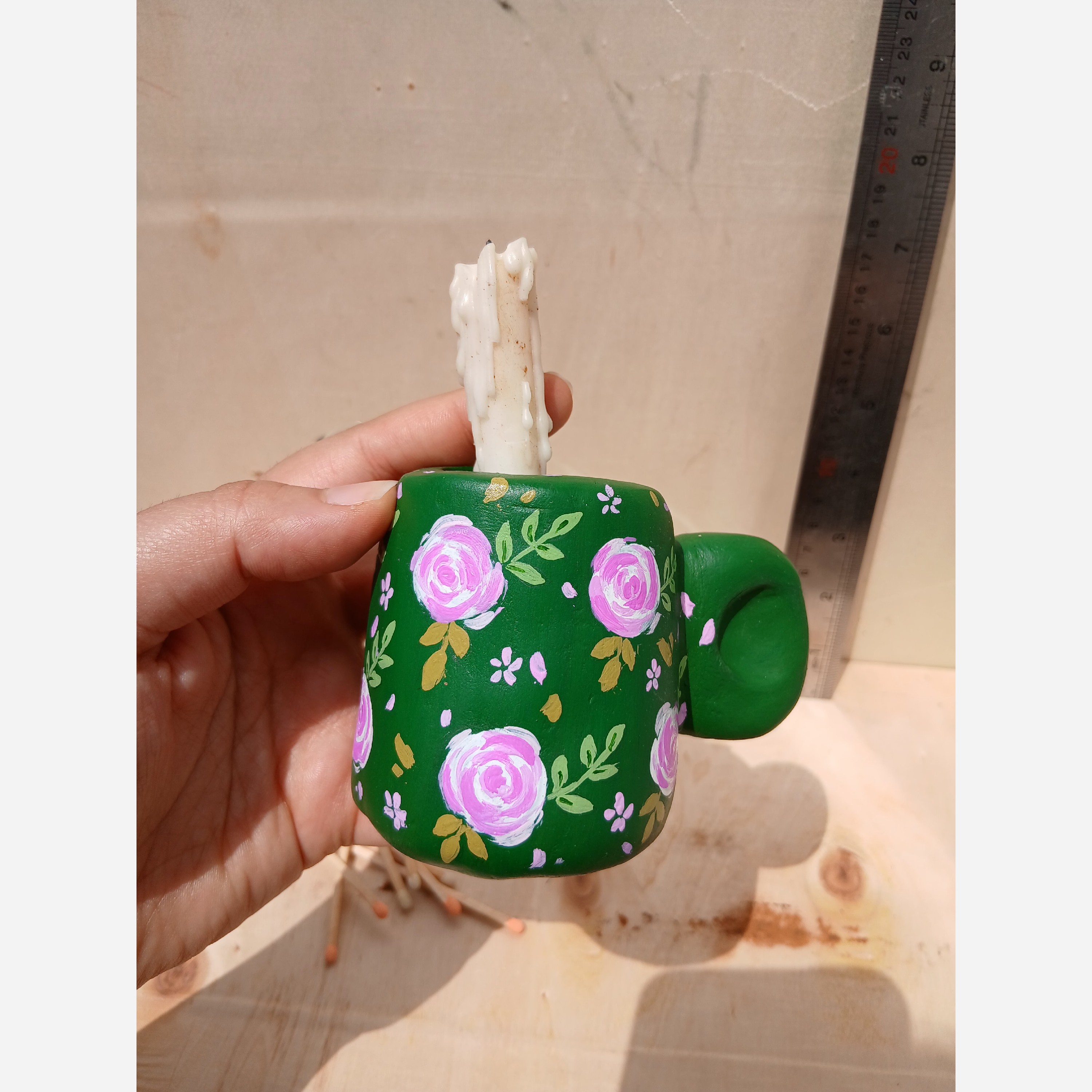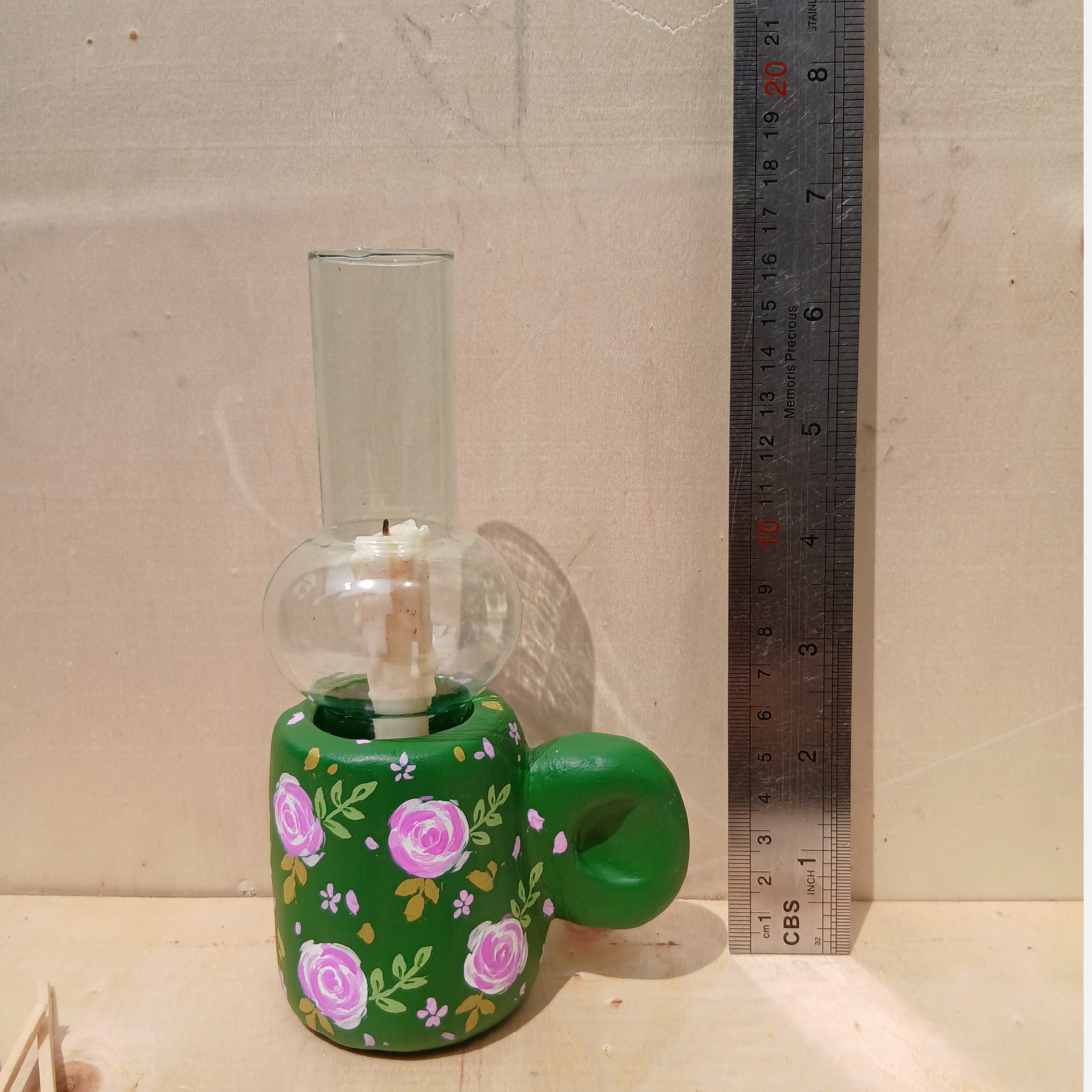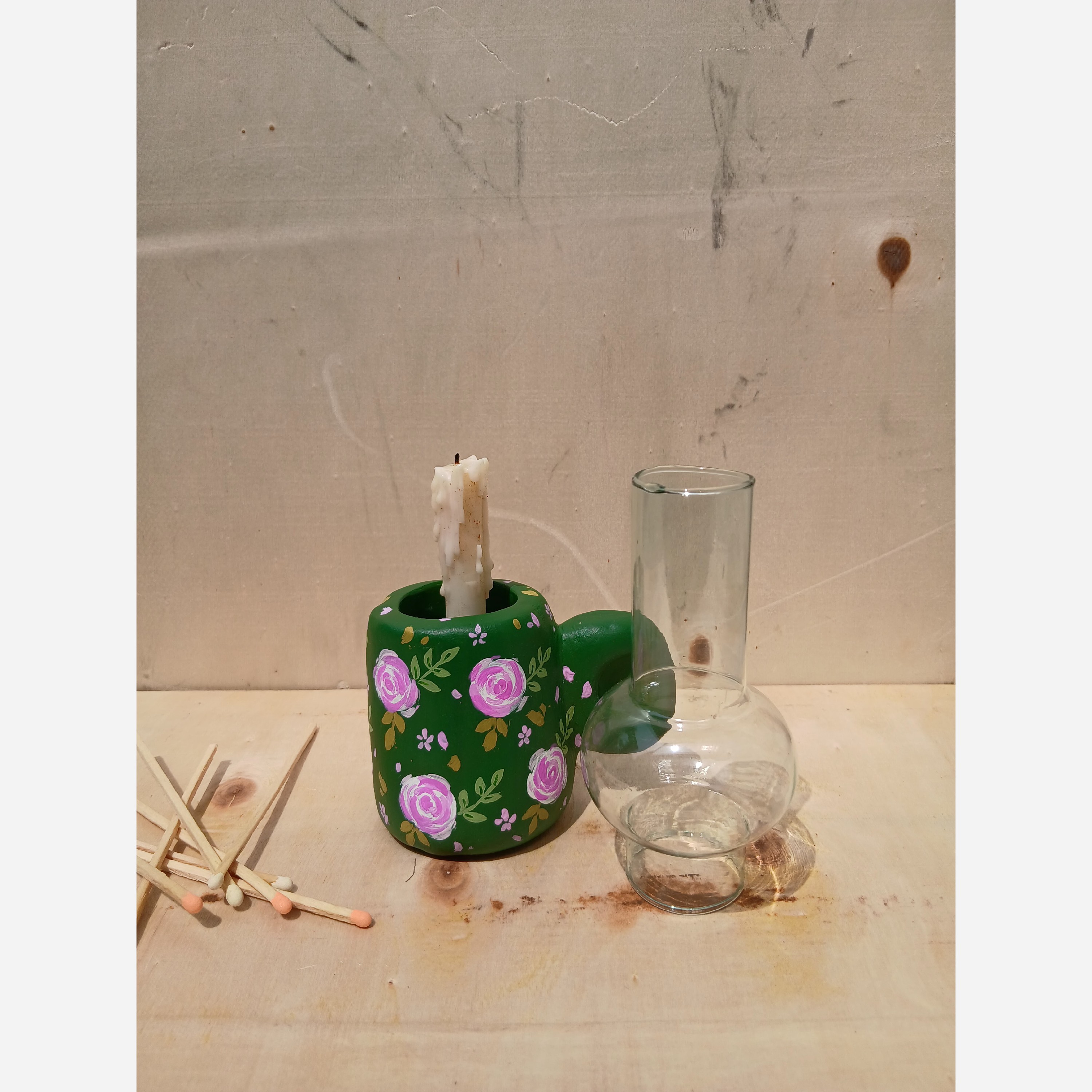 جاشمعی سفالی دستساز باگل سفالگری ساخته شده نقاشی شده مناسب برای شمع قلمی باریک مناسب برای دکور وتزیینات دارای حباب شیشه ایی ارتفاع با حباب تقریبا17سانت