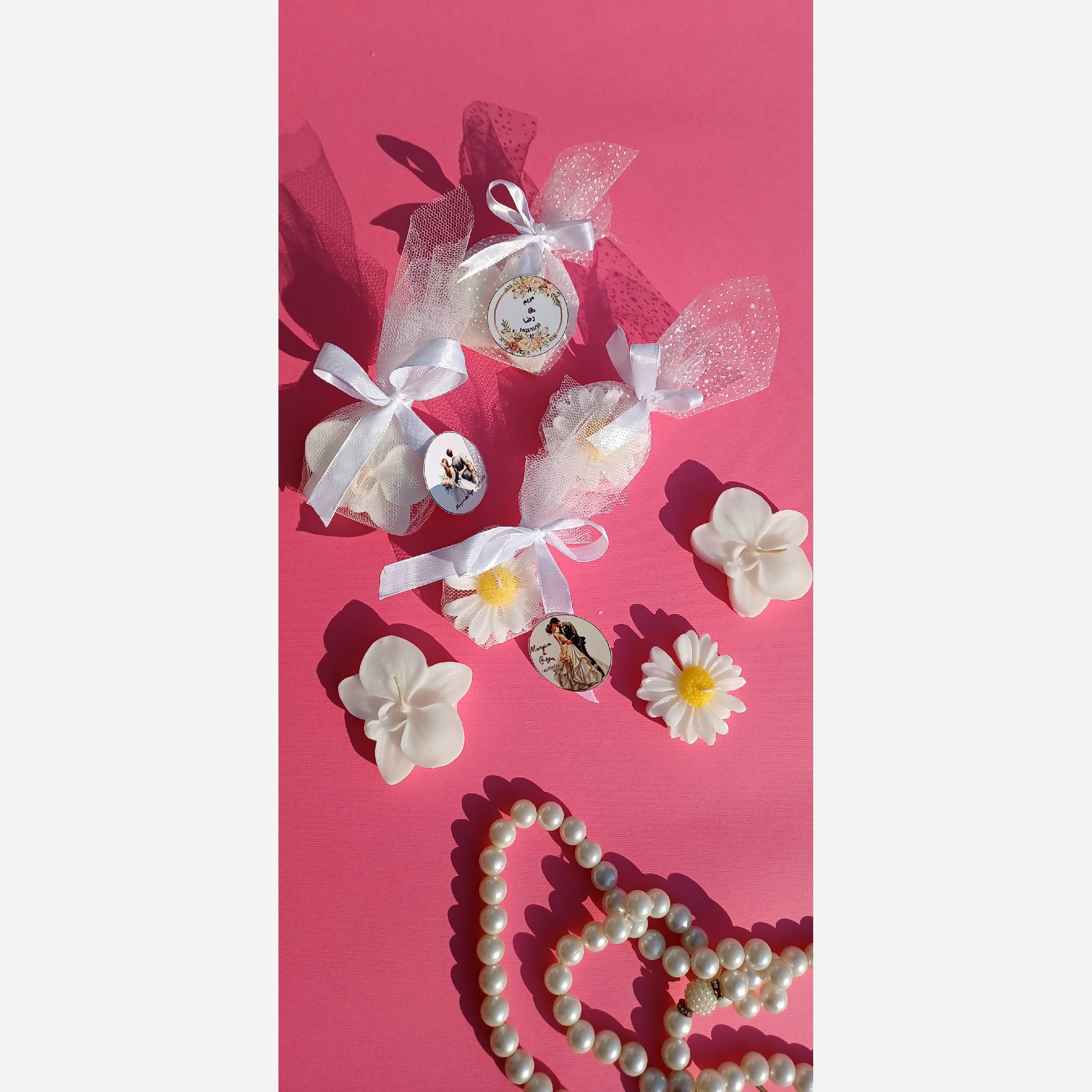 گیفت بابونه با تزیین تور دانه برفی و تور ساده و روبان و نگین همراه با لیبل و طرح اختصاصی و چاپ عکس و متن دلخواه حتی رنگ شمع ها هم مطابق سلیقه کار میشه