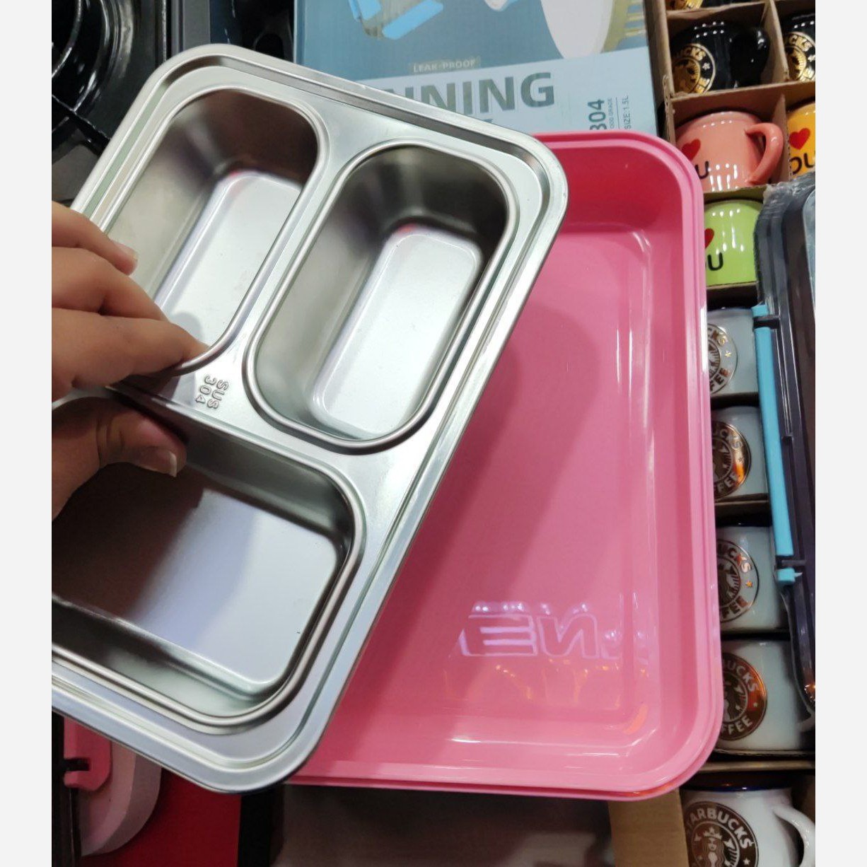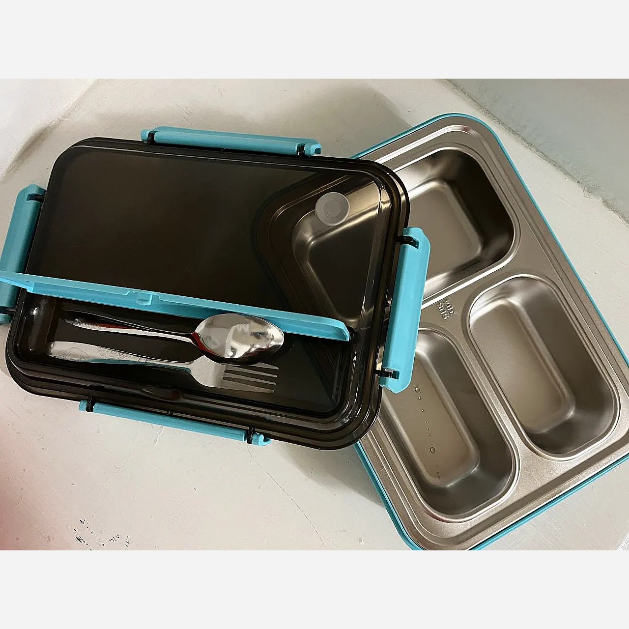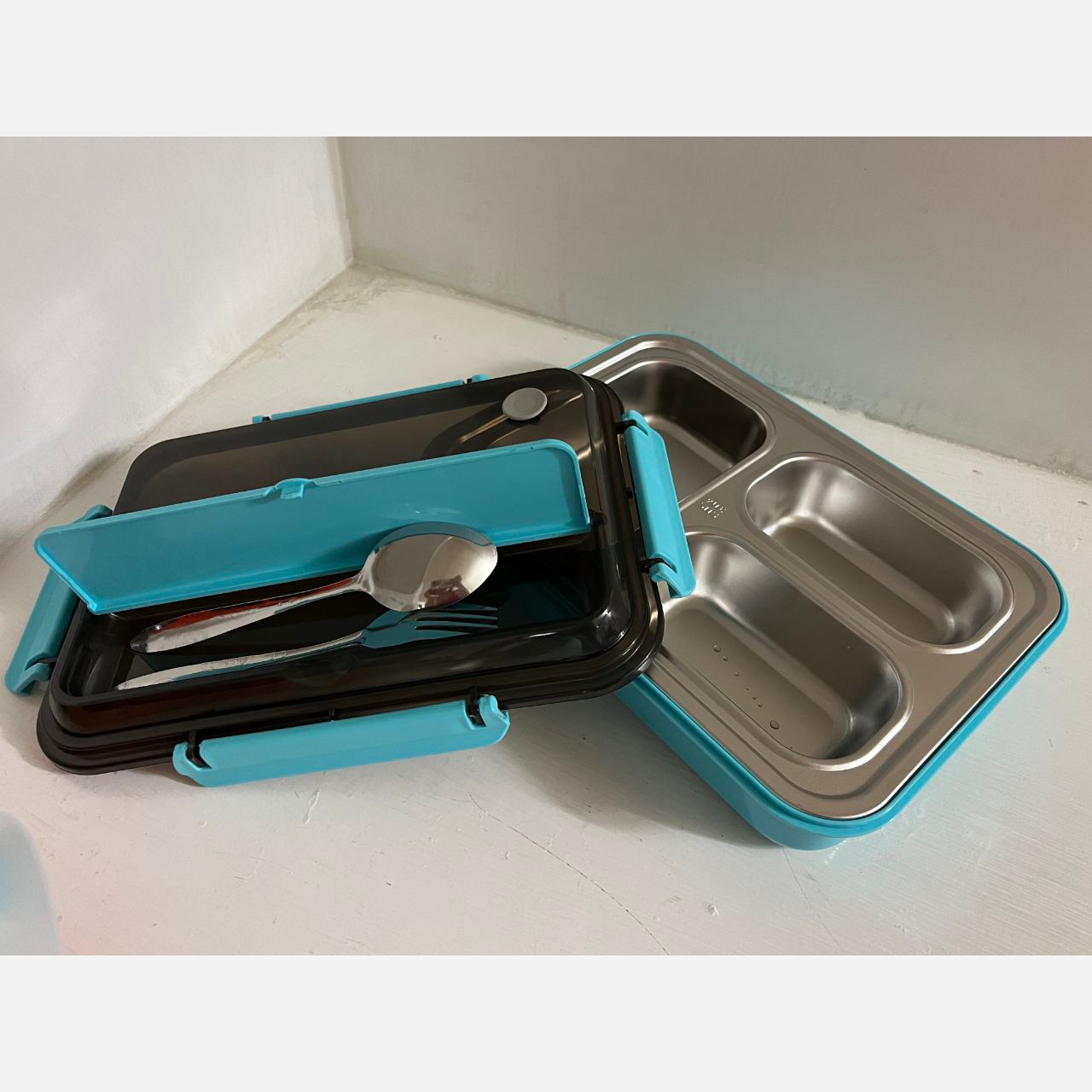 ظرف غذای استیل همراه با قاشق چنگال سه قسمت دادای محفظه ای برای قاشق و چنگال مناسب برای اداره، دانشگاه و مدرسه بخش استیل ظرف قابل استفاده در مایکروفر را دارد قسمت زیرین ظرف را میتوانید آب بریزید تا غذا در بخش استیل به شیوه بخارپز گرم شود.