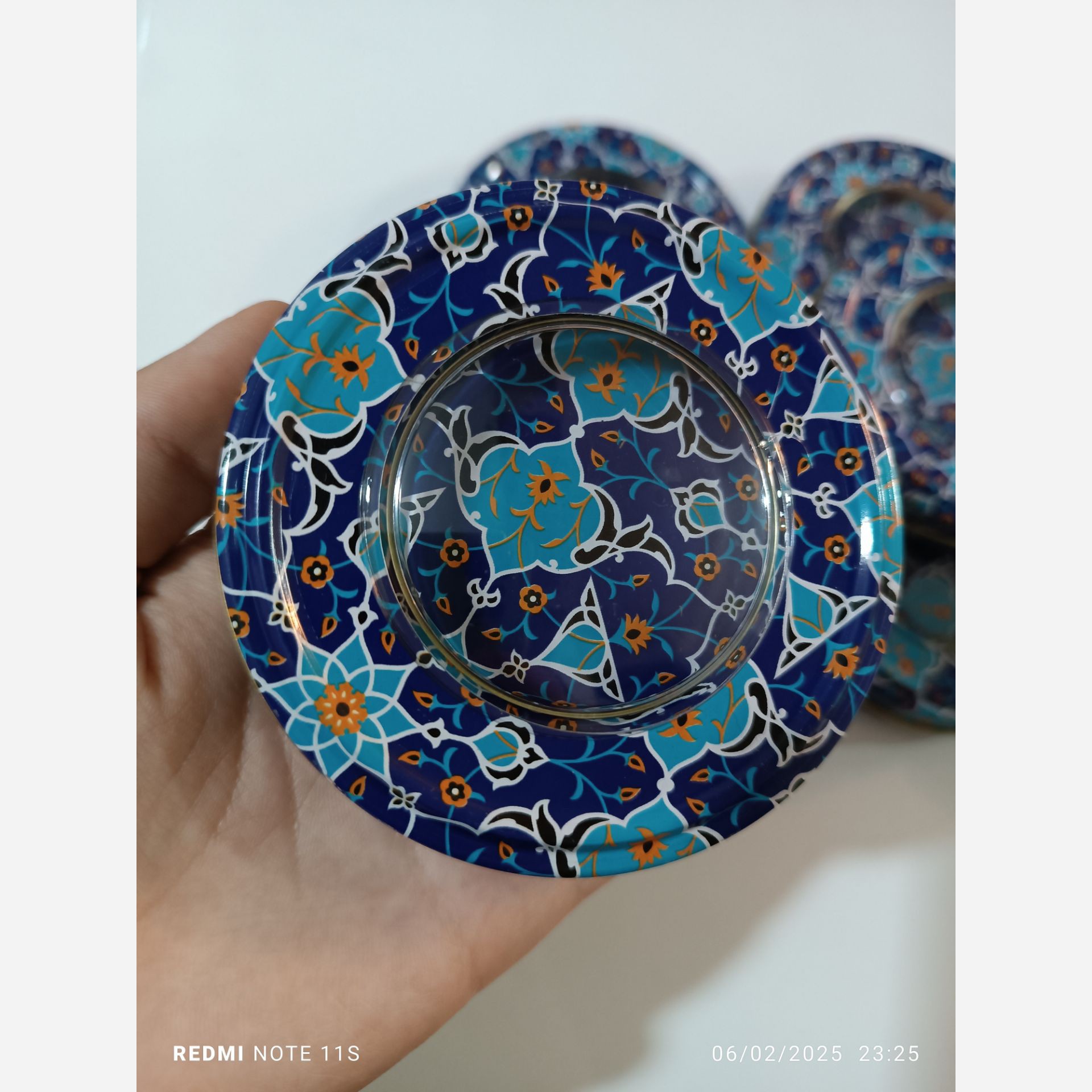 ظرف فلزی خاتم 1 مثقالی در طرحهای مختلف برای هدیه ،سوغاتی و مصارف خانگی جهت نگهداری هل و زعفران و.... قطر ظرف 9 سانتی متر ارتفاع تقریبا 2 سانتی متر