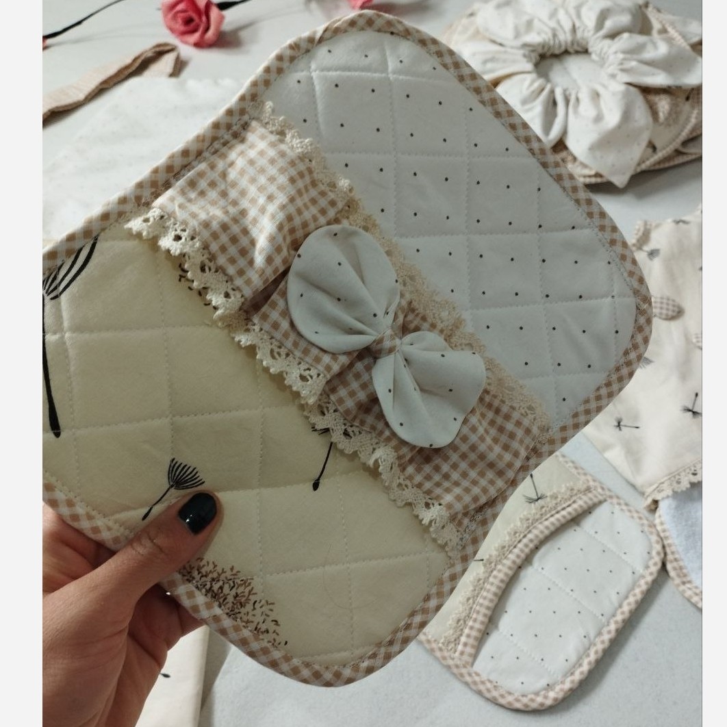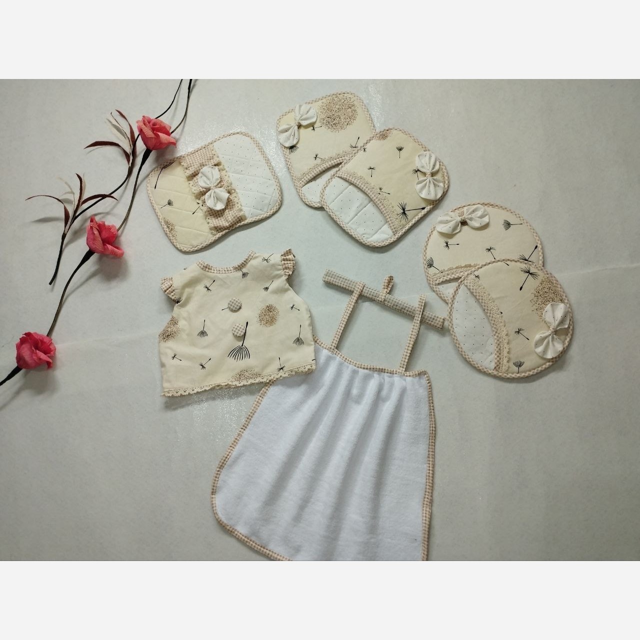 سرویس پارچه ای آشپزخانه 10تیکه شامل یک عددپیشبند ساده جیب دار یک جفت دستگیره مستطیل جیب دار یک جفت دستگیره دایره جیب دار یک عدد سفره پاک کن یک عدد حوله آشپزخانه طرح پیراهن آویزدار سه عدد دمکنی طرح گل شش پر جنس کتان نخ ترک آستر دارد جنس وکیفیت دوخت درجه یک مناسب برای بانوان آشپزخانه و سرویس عروس دوخته شده با پشم شیشه کوبیده