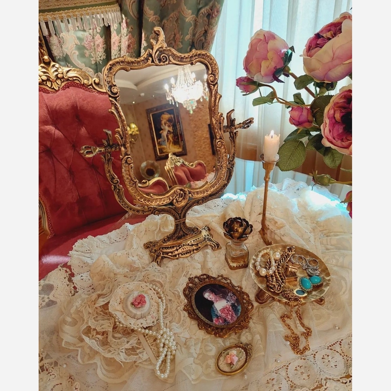 آینه هفت سین برنز آیینه آنتیک چرخشی رومیزی آرایش و خلعتی برنزی مبلمونسرا مدل 261548