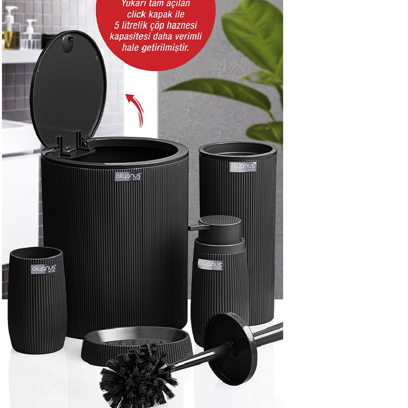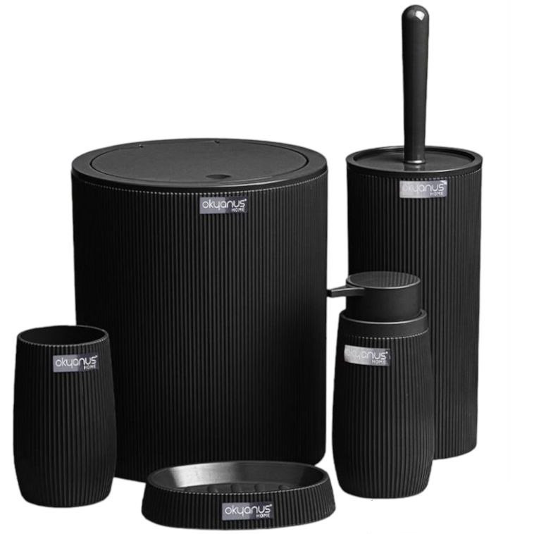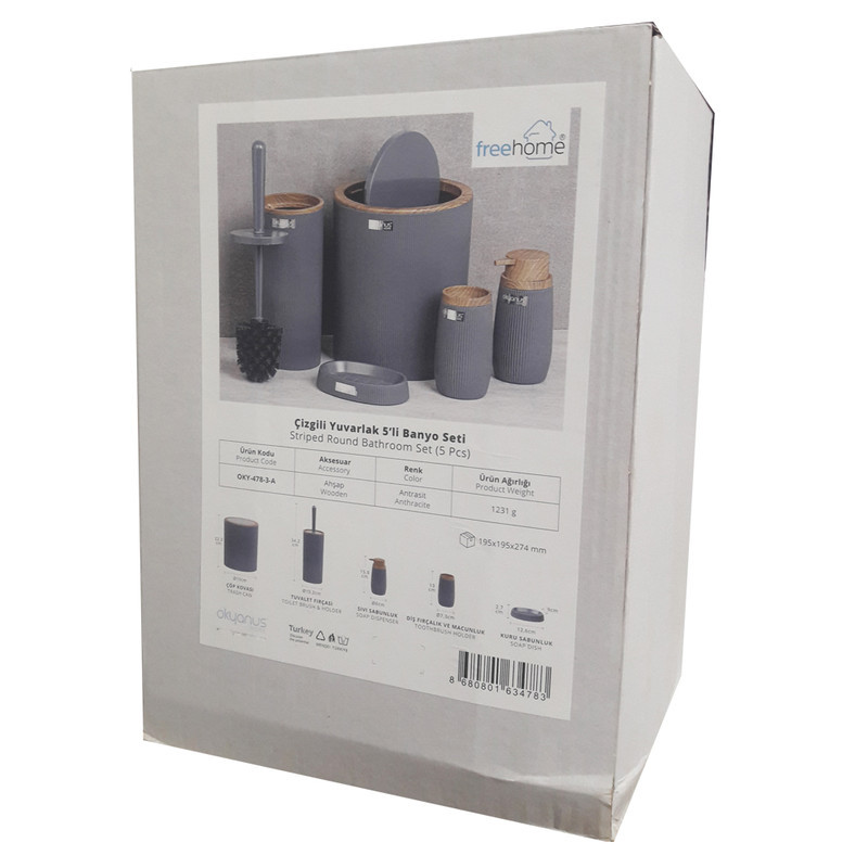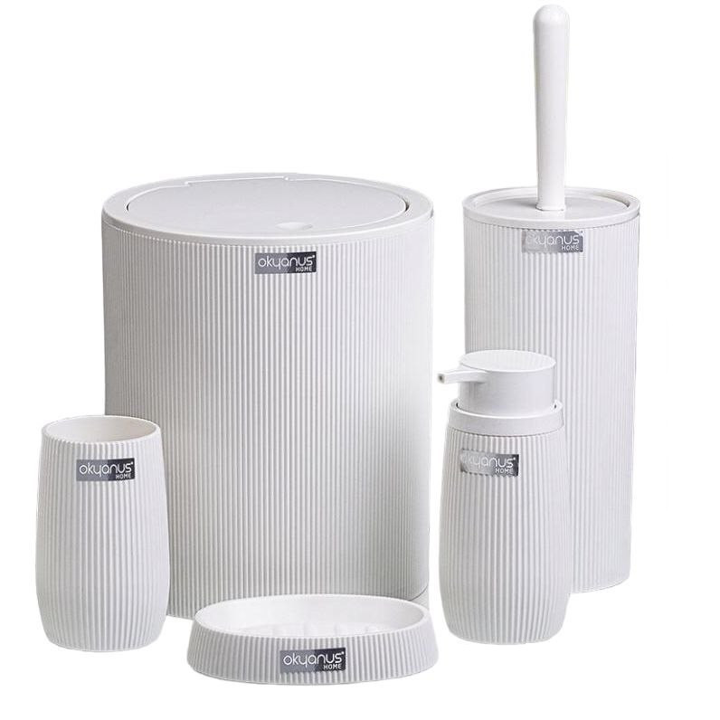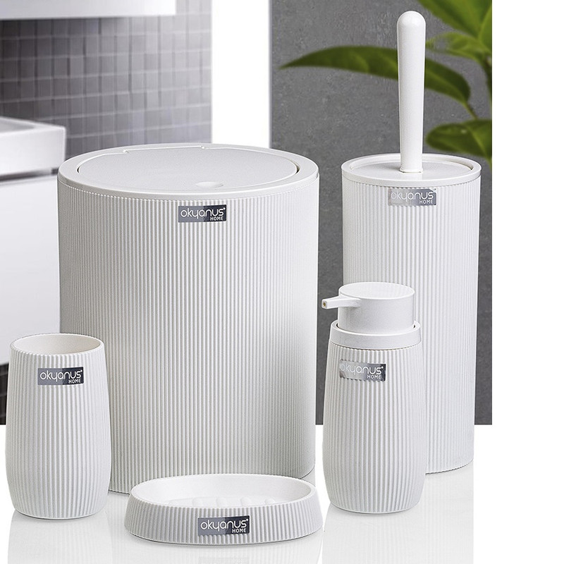 ست ۵ پارچه سرویس بهداشتی فری هوم ترکیه - FREE HOME - ساخت ترکیه - شامل : سطل آشغال ، ظرف پمپ مایع دستشویی ، برس ، جا مسواکی ، جا صابونی - محصولی صادراتی به اروپا - بسیار مقاوم و زیبا - جنس : آکریلیک - مقاوم در برابر مواد شوینده های اسیدی و شیمیایی - شستشوی راحت و آسان