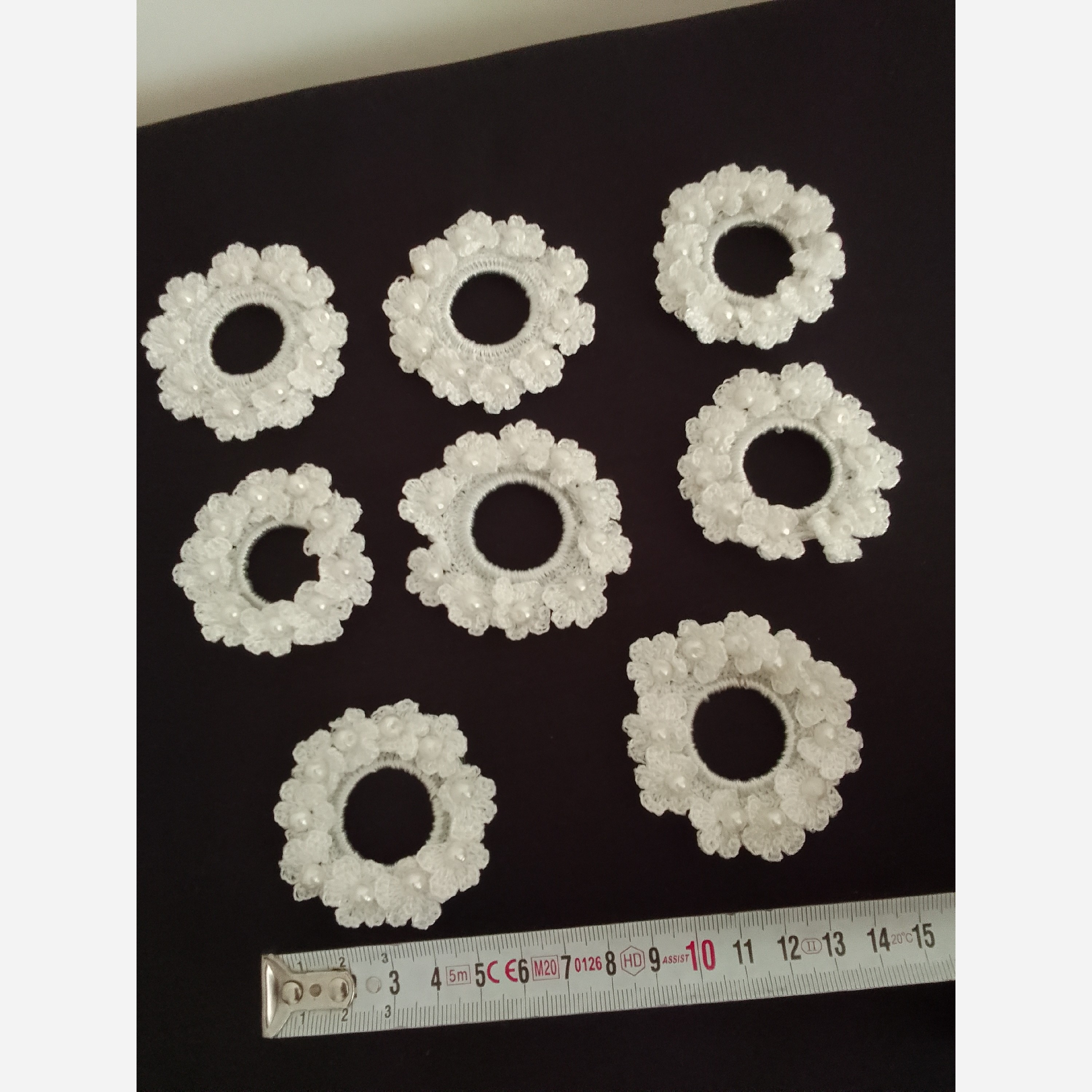 حلقه دستمال سفره سفید مرواریدی دستبافت عروس گلدار گل گلی گیپور بافت بسته 8 عددی جای دستمال سفره جا دستمال قلاب بافی مبلمونسرا مدل 299954