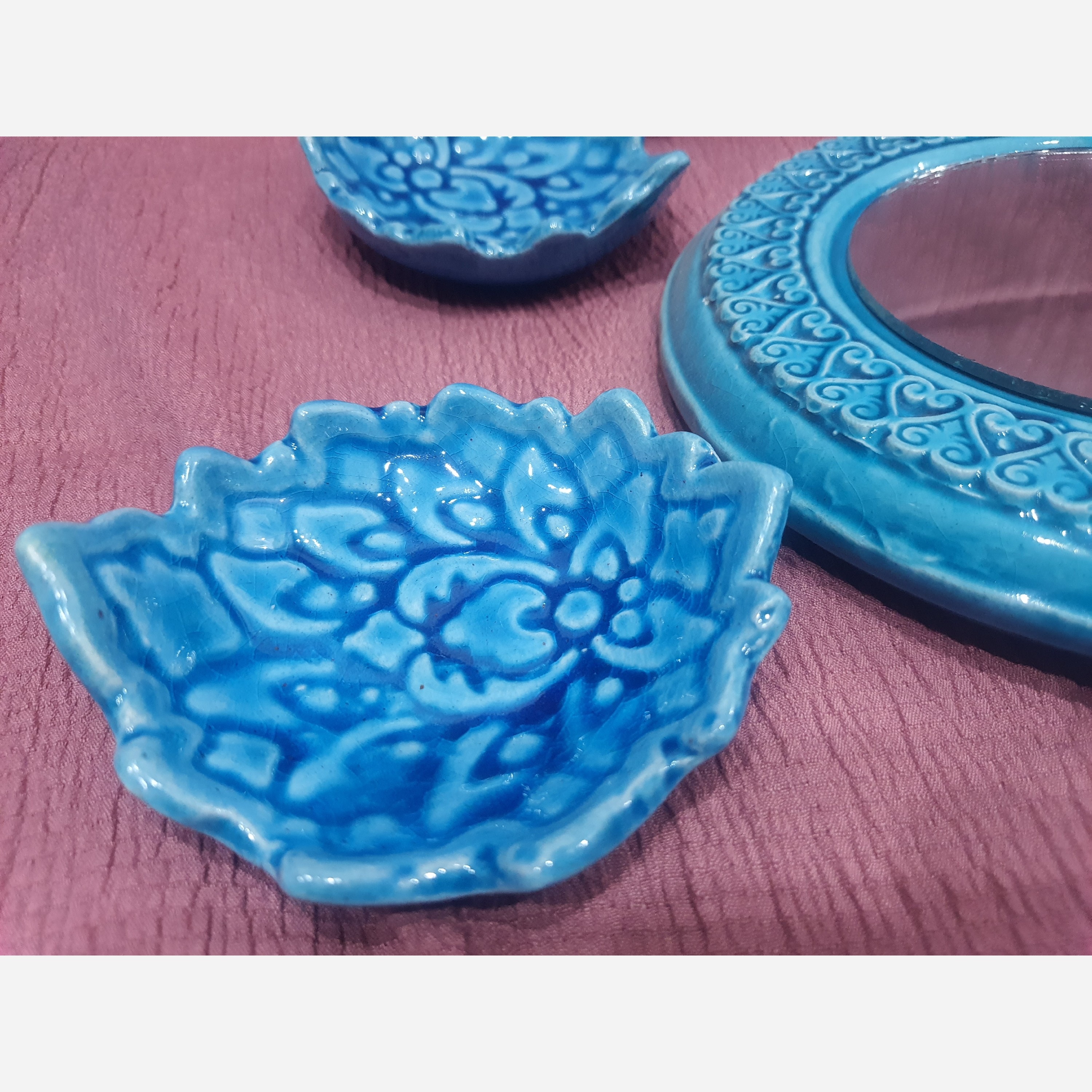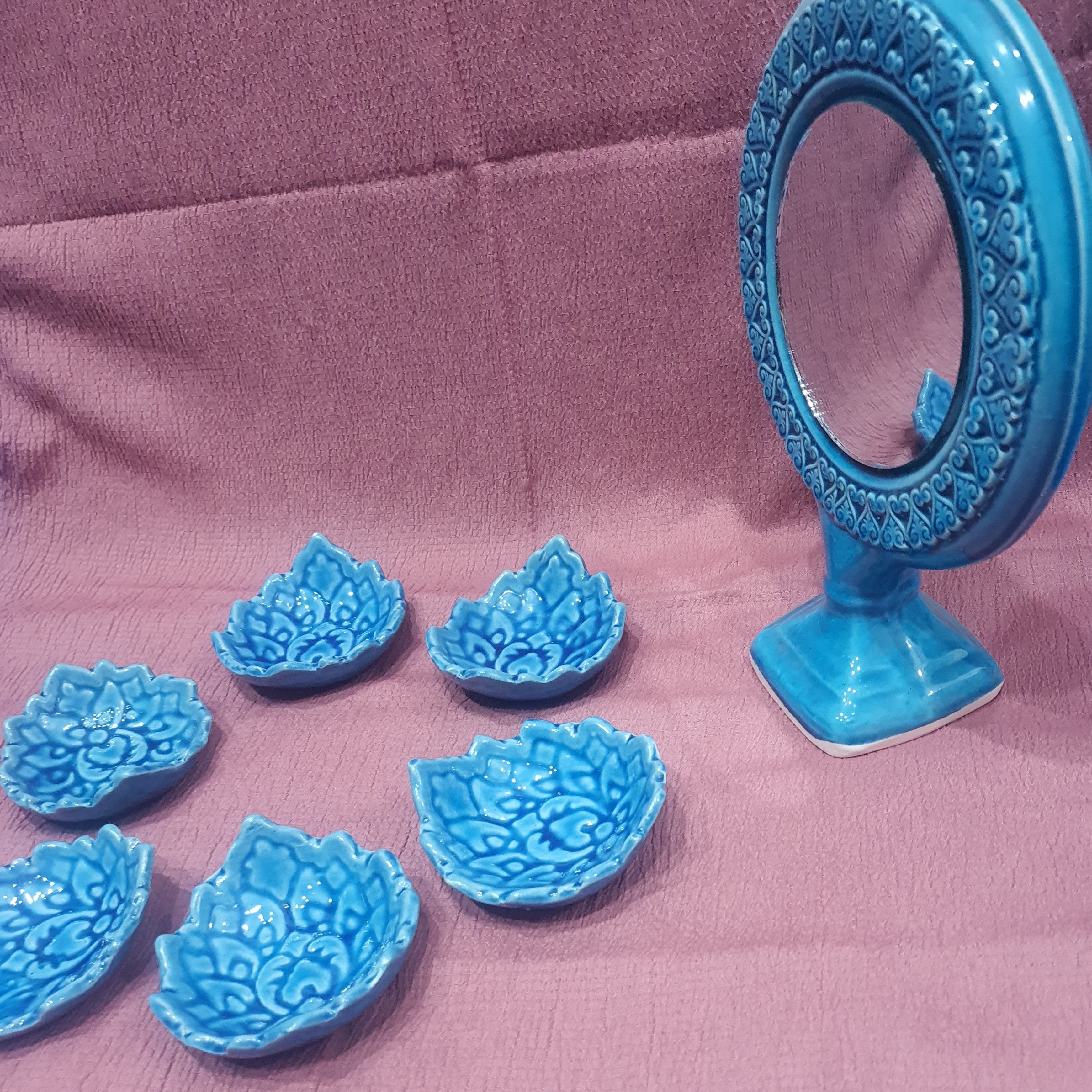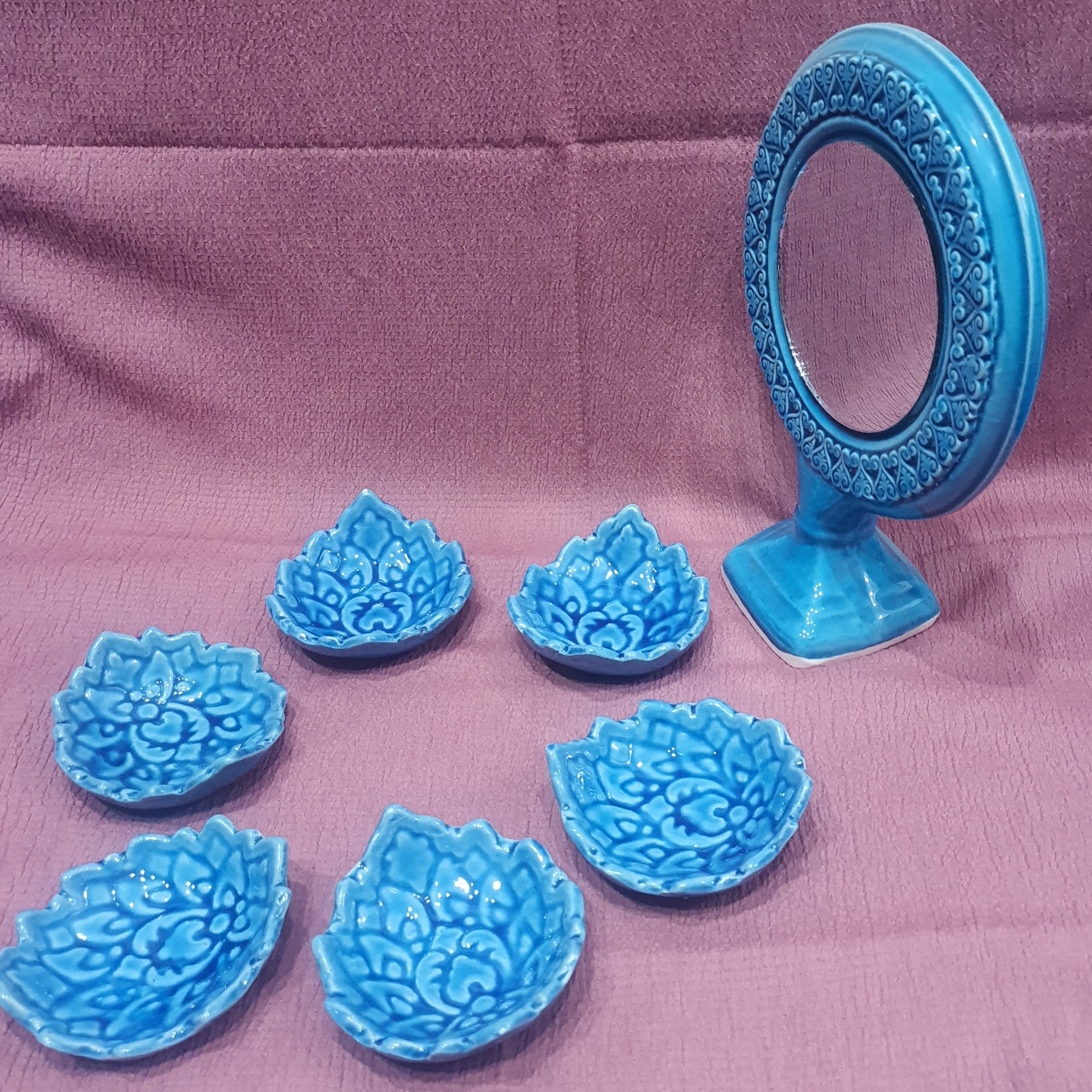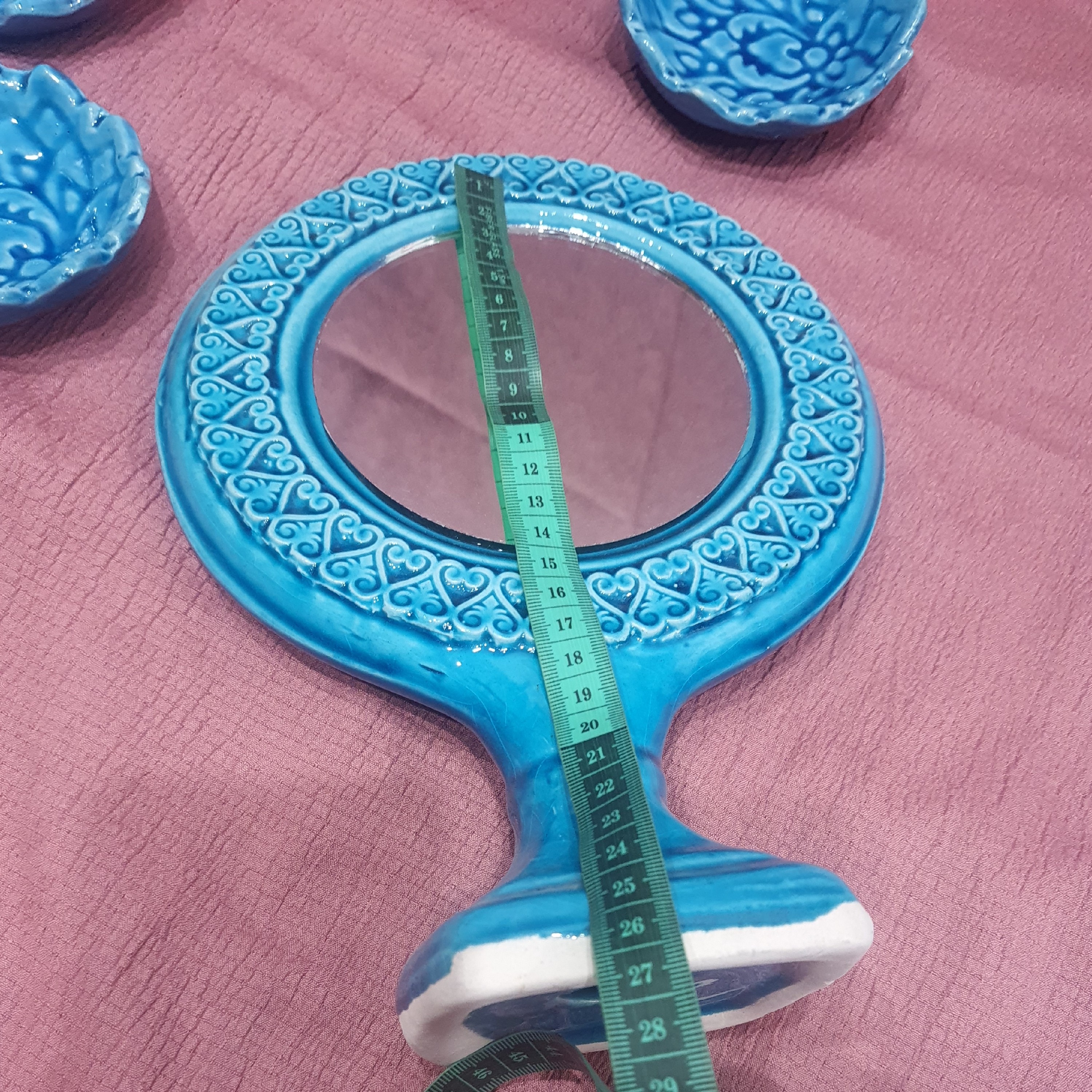 سفالی رنگ ابی 7 تیکه اندازه ظرف برگ 10 سانت اندازه قد اینه 27 سانت
