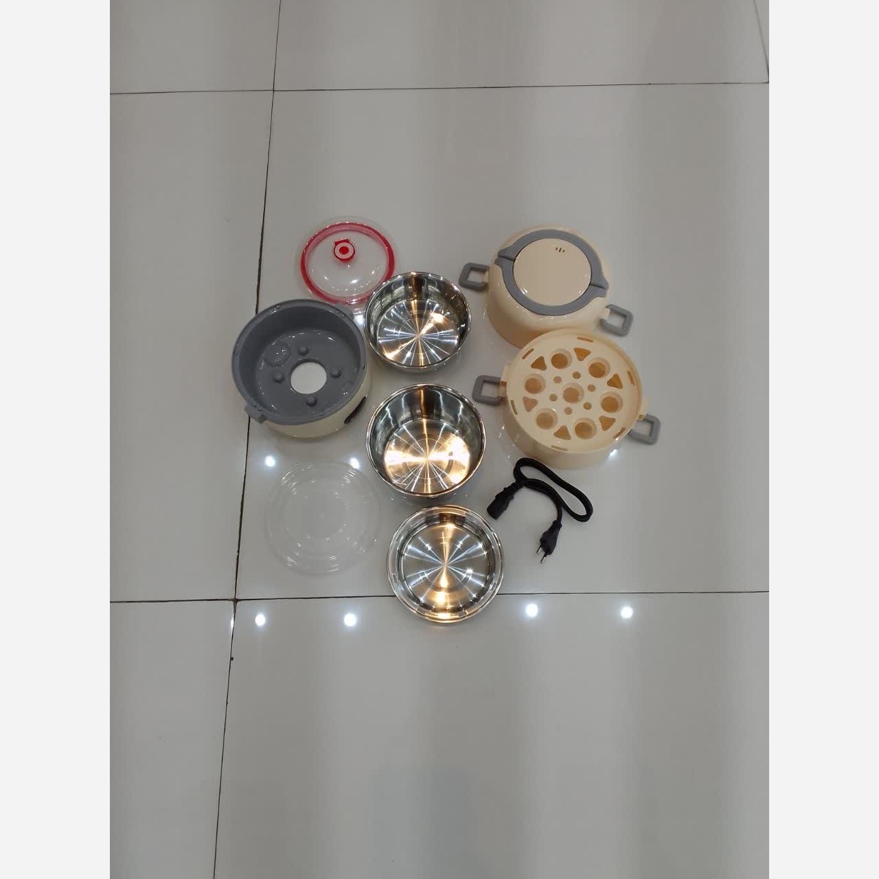 ظرف غذای برقی3طبقه الگانت. مخصوص گرم کردن غذاوهمچنین پختن تخم مرغ مناسب کارمندان وذانش آموزان وکسانیکه وقت کمی برای گرم کردن ومیل کردن غذادارند. دارای3طبقه استیل مجزا بادرب وکیومی. دارای کابل پاورجهت اتصال به برق شهری. دارای یک طبقه مخصوص آبپزکردن تخم مرغ بااین ظرف دیگه نیازنیست غذاروبریزیدداخل ظرف دیگه که داغ کنیدکافیه ظرف بزنیدبه برق تاغذاییکه داخلش هست روبراتون داغ کنه