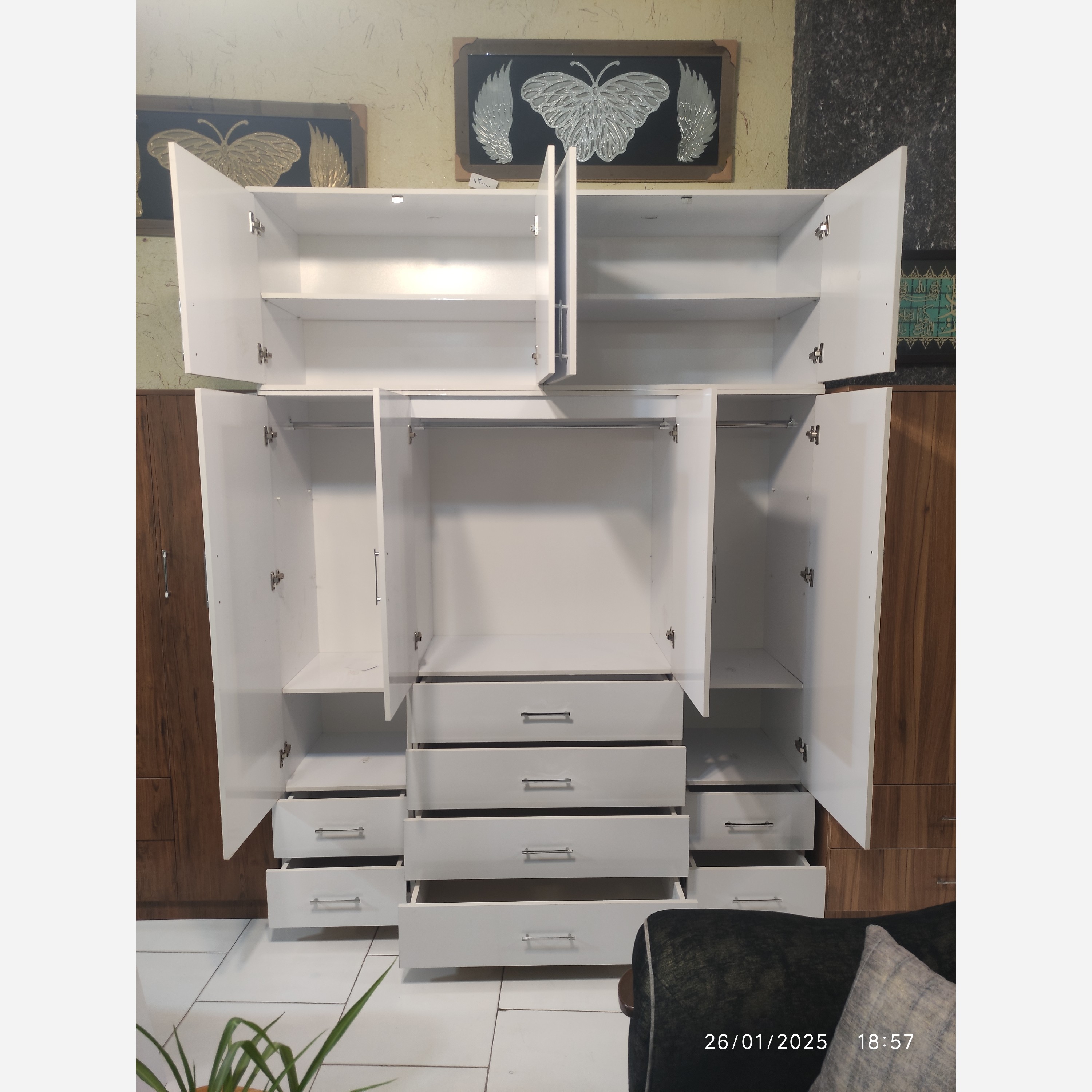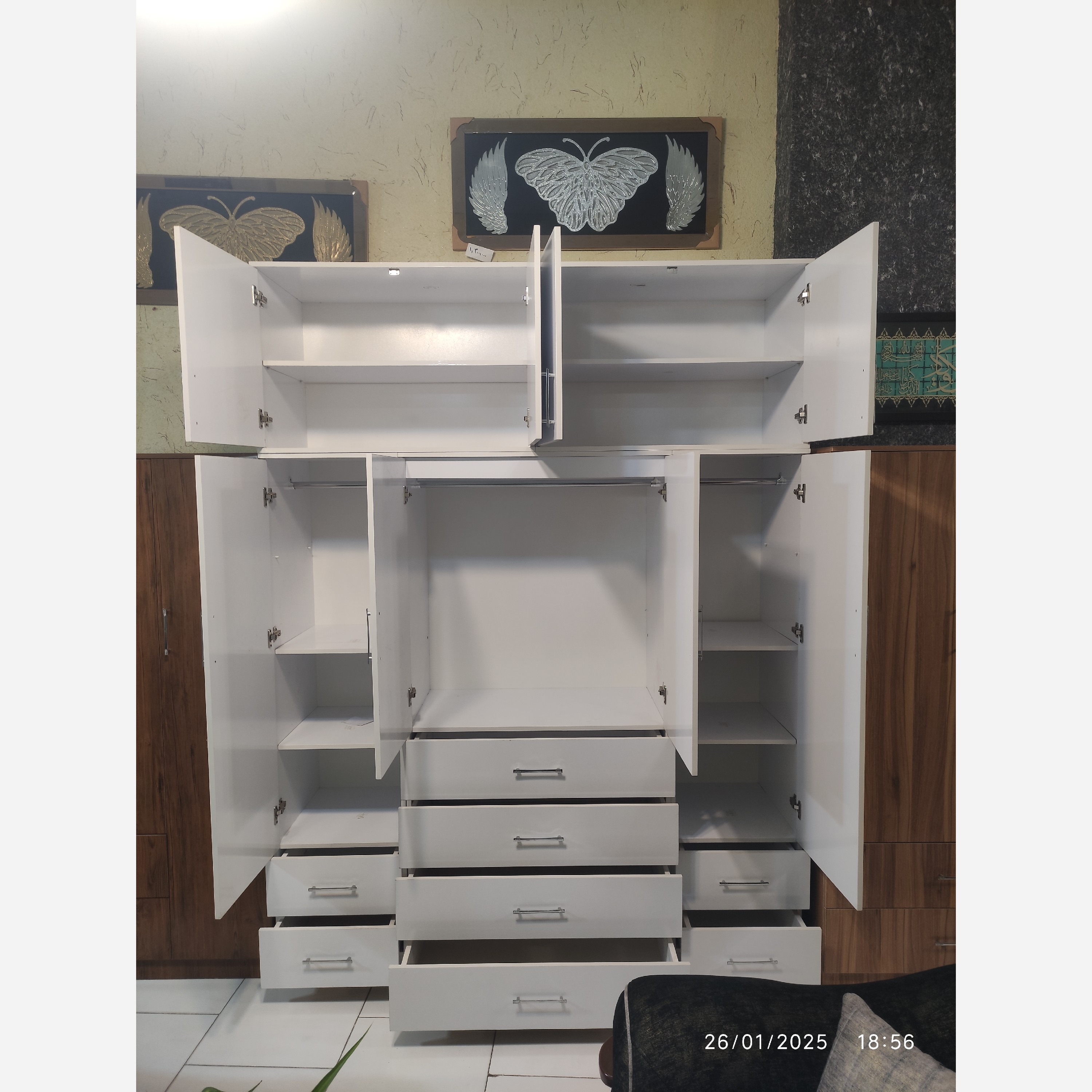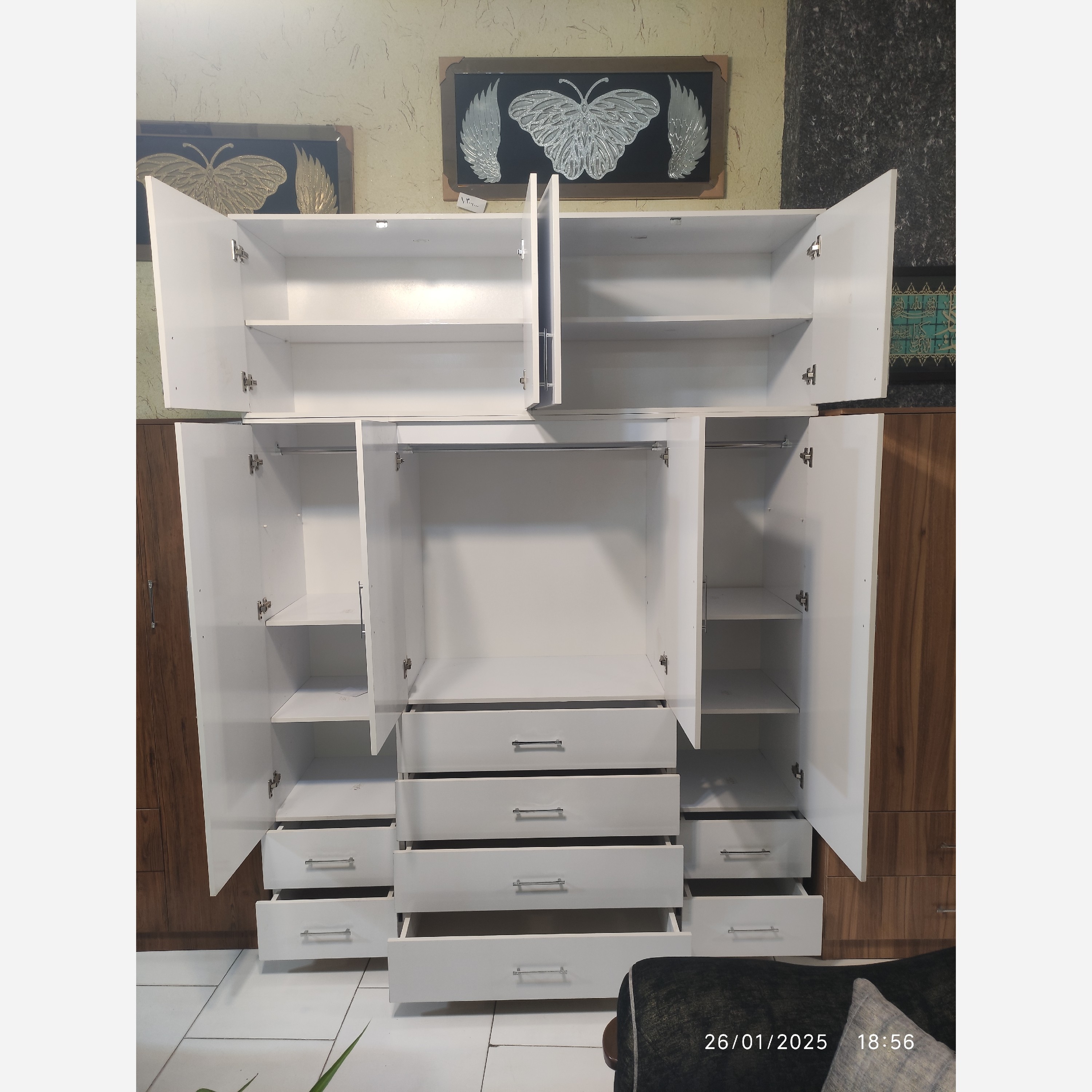 با سلام کمد 5 تکه بزرگ و جادار حمل و نقل ساده تر به دلیل 5 تکه بودن دارای 8 طبقه متحرک که میتونید اگر خواستید لباس بچه گانه آویزون کنید یکی از طبقه ها رو بردارید و از بقیه طبقه ها استفاده کنید یا اگر خواستید لباس مردانه آویزون کنید دوتا طبقه بردارید و یا اگر لباس زنانه و بلند داشتین سه تا طبقه رو بردارید اندازه عرض 180 ارتفاع 240 عمق مفید 50 سانت لولا آرامبند ریل ساچمه ای پهن 3 عدد کمد برای لباس 8 طبقه متحرک 8 عدد کشو عمق کشوها 41 گودی کشوها 14 کرایه حمل بر عهده مشتری میباشد