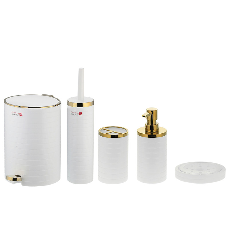خرید اکسسوری سرویس بهداشتی چند سالی است که به عنوان یک امر مهم در تزئین محیط سرویس بهداشتی در نظر گرفته میشود. ست سرویس بهداشتی 5 پارچه از برند کنتراست یک مجموعه کامل و در عین حال ساده بوده که با هر نوع دکوراسیون داخلی توالت همخوانی دارد. این ست از یک سطل، ظرف مایع دستشویی، جاصابونی، فرچه و جا مسواکی تشکیل شده است. جنس بدنه این وسایل از پلاستیک مرغوب و با کیفیت بوده که در برابر نم و رطوبت مقاومت بالایی دارد. اگر به دنبال یک سرویس با کیفیت و در عین حال با صرفه هستید این محصول میتواند گزینه مناسبی برای انتخاب و خرید شما باشد. سطل این مجموعه به صورت پدال دار بوده که با فشار پای خود برای باز و بسته کردن در آن اقدام کنید. رنگ طلایی دور سطل با رنپ پدال طیف رنگی جالبی را با بدنه شیار دار کالا ایجاد کرده است.