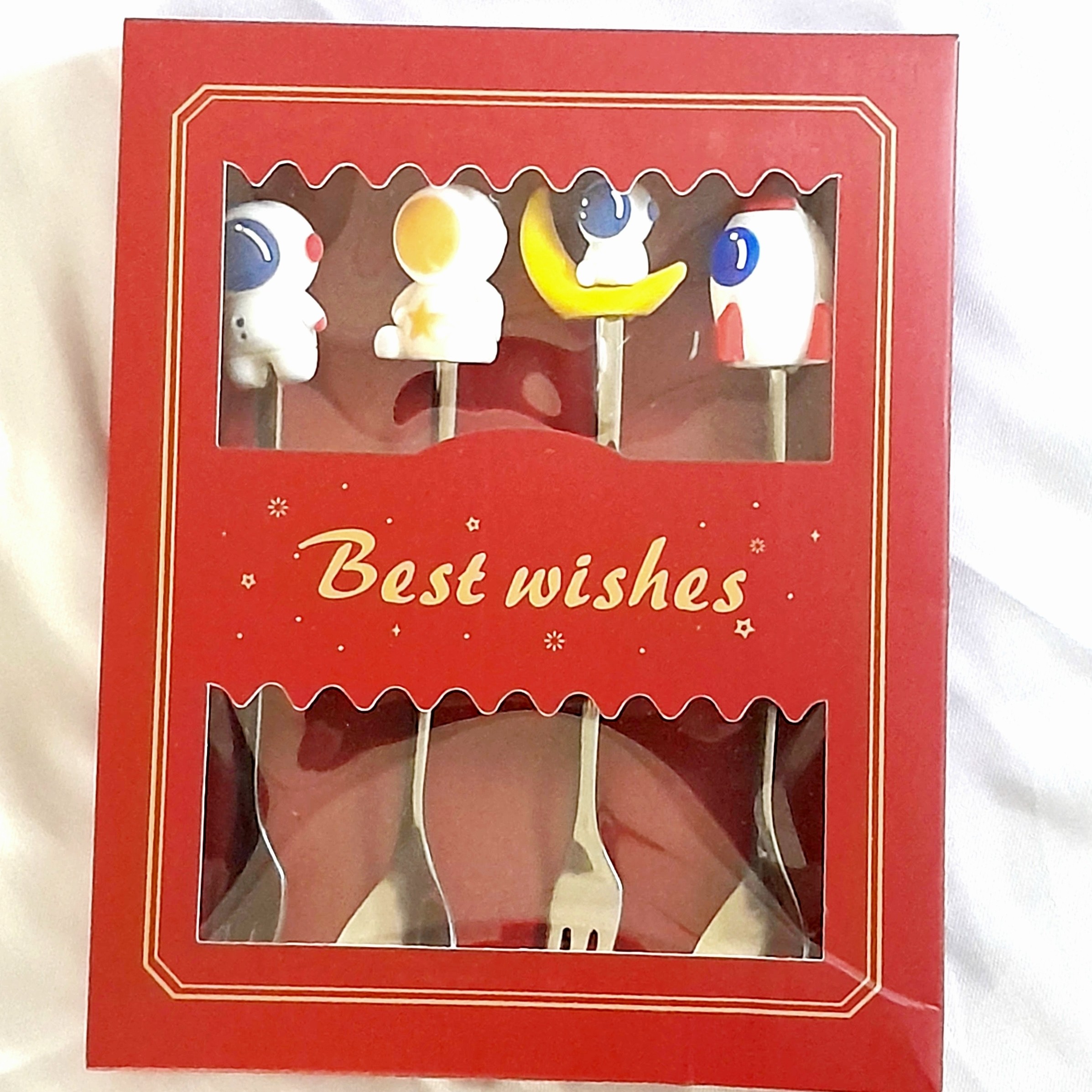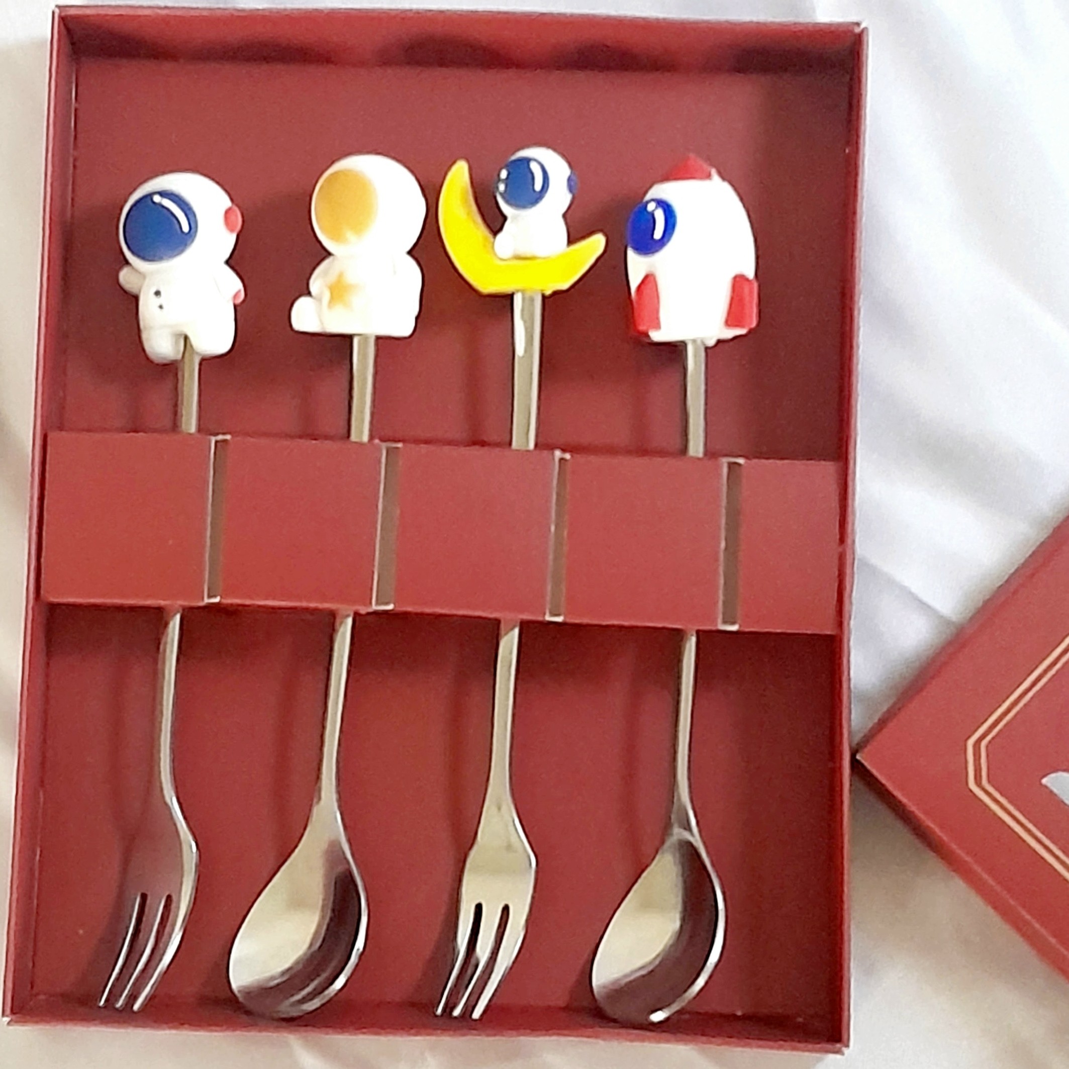 این محصول در یک پک 4 تایی قاشق چنگال استیل میباشد که بر روی دسته ان اجسام فضایی وکهکشانی نصب شده که مورد توجه کودکان قرار گرفته وموجبات تشویق انان به استفاده از ان میشود
