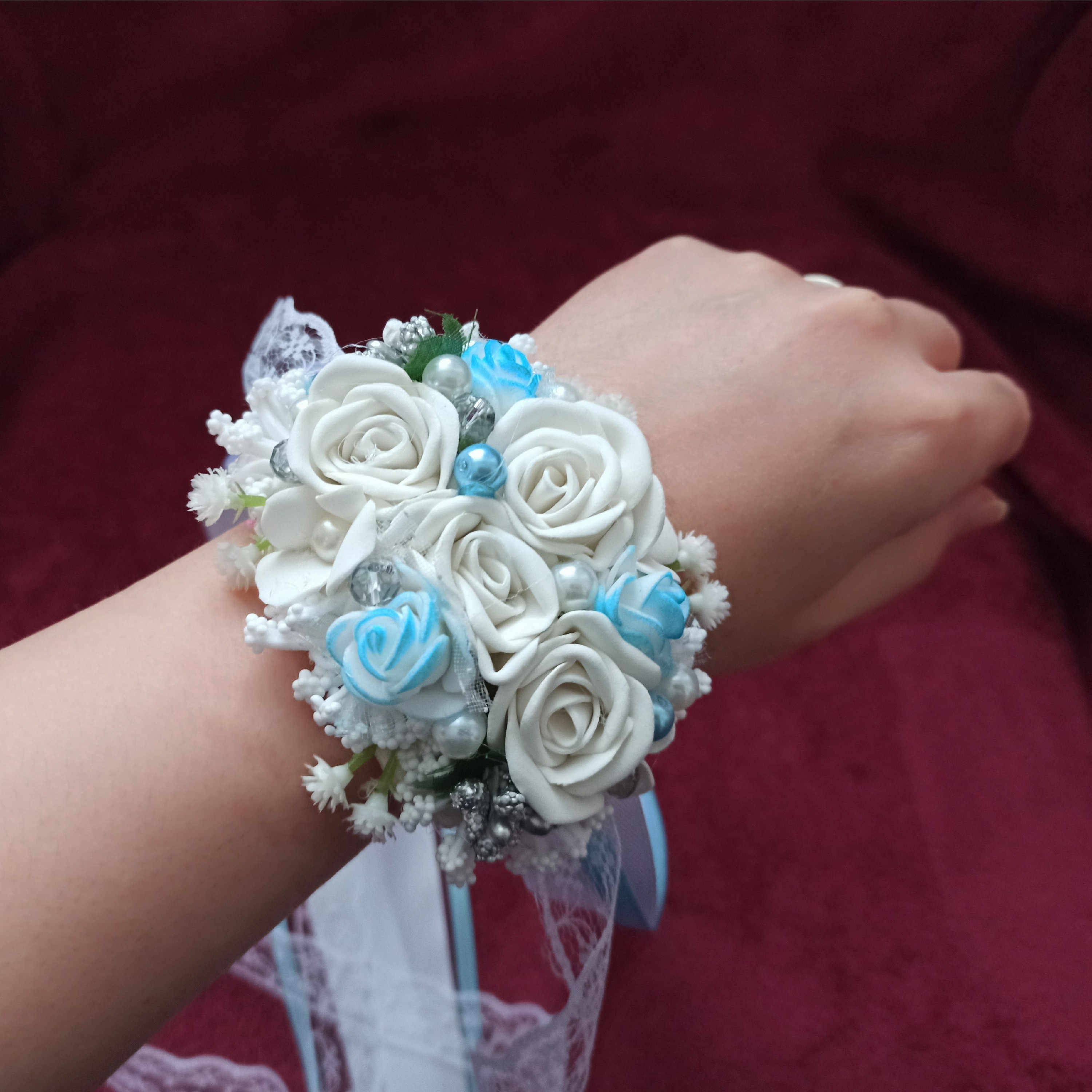دستبند مچبند گل مناسب عقد و عروسی و نامزدی ،تولد،فرمالیته، آتلیه ،... تزیین شده با گل های فومی ومروارید وروبان 🎀
