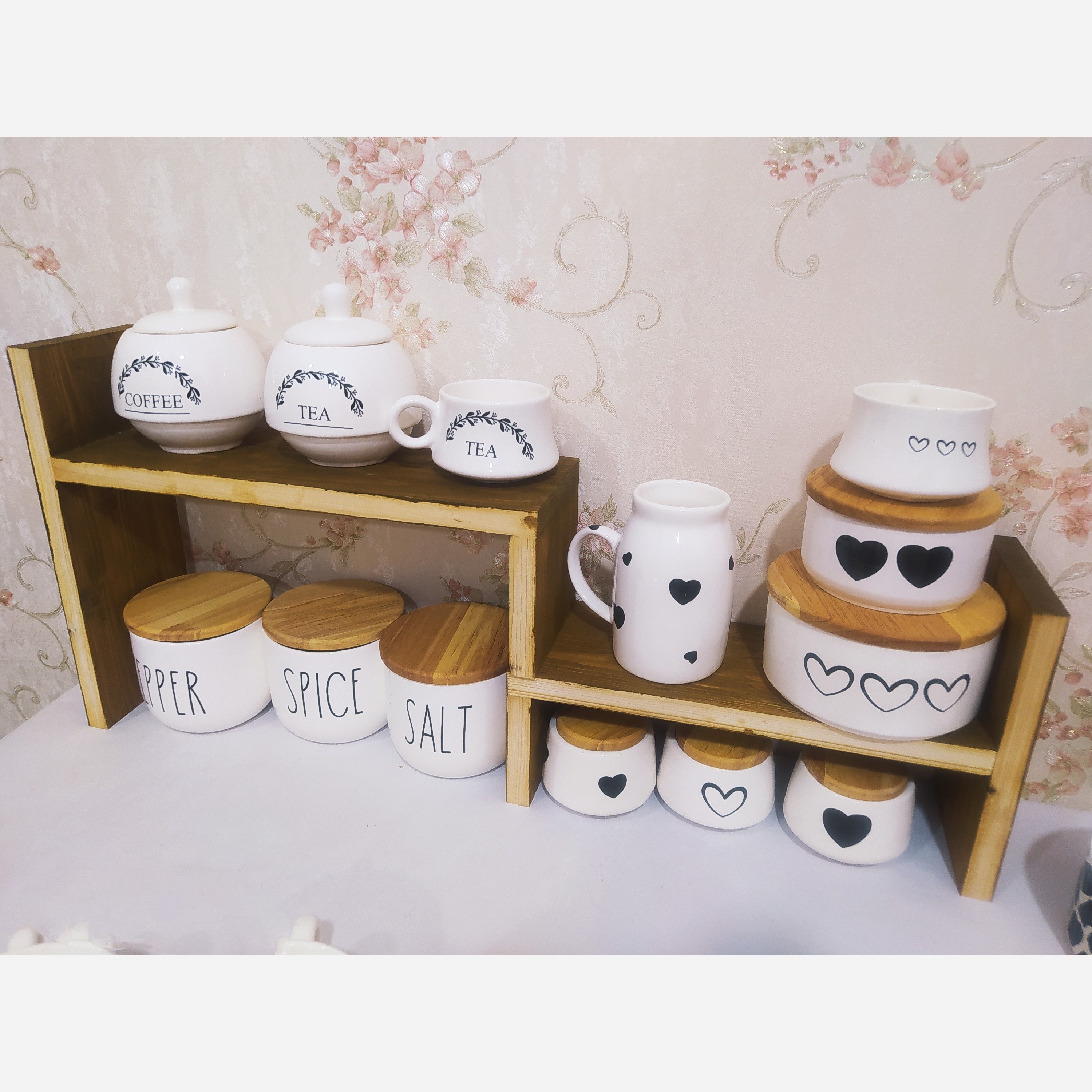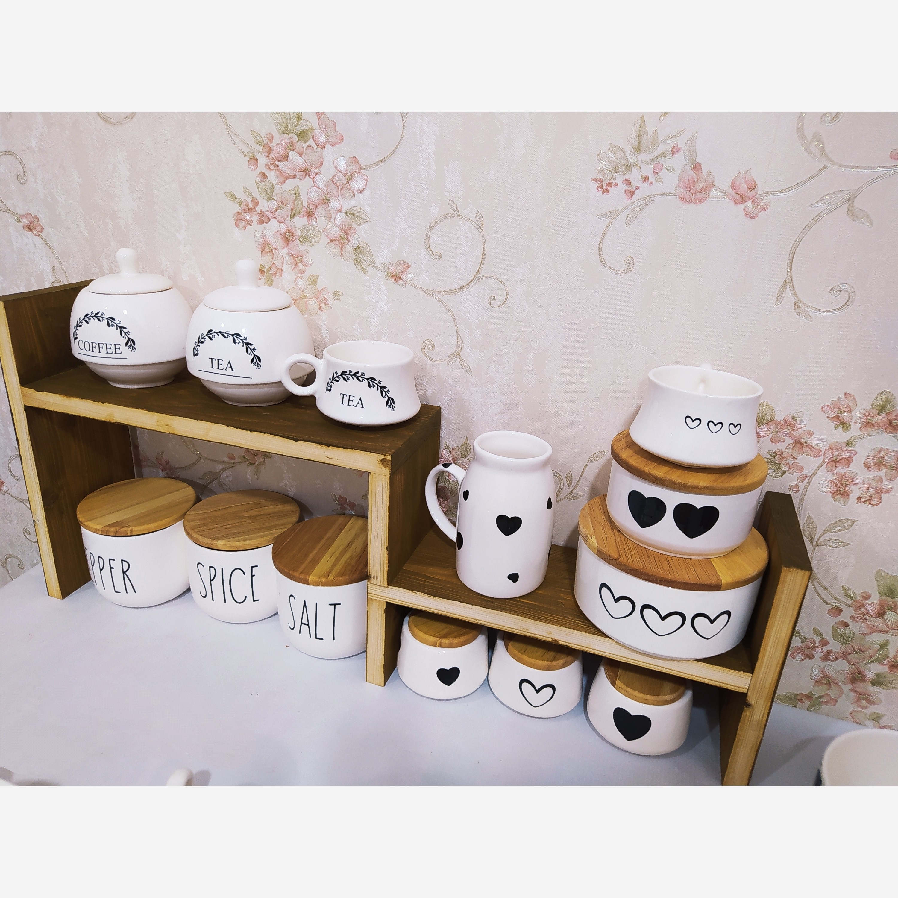 ست پاسماوری قابل حذف و اضافه شدن استنددار ساخته شده از سرامیک درجه یک سه بار پخت شده در کوره با دمای 1100درجه بانکه سایز 11سانتی 165هزار جا ادویه 120 جا ادویه کوچک 110 ماگ شیر 120 کندی سایز 12سانت 185 کندی سایز 14 سانت 215 فنجان 75هزار