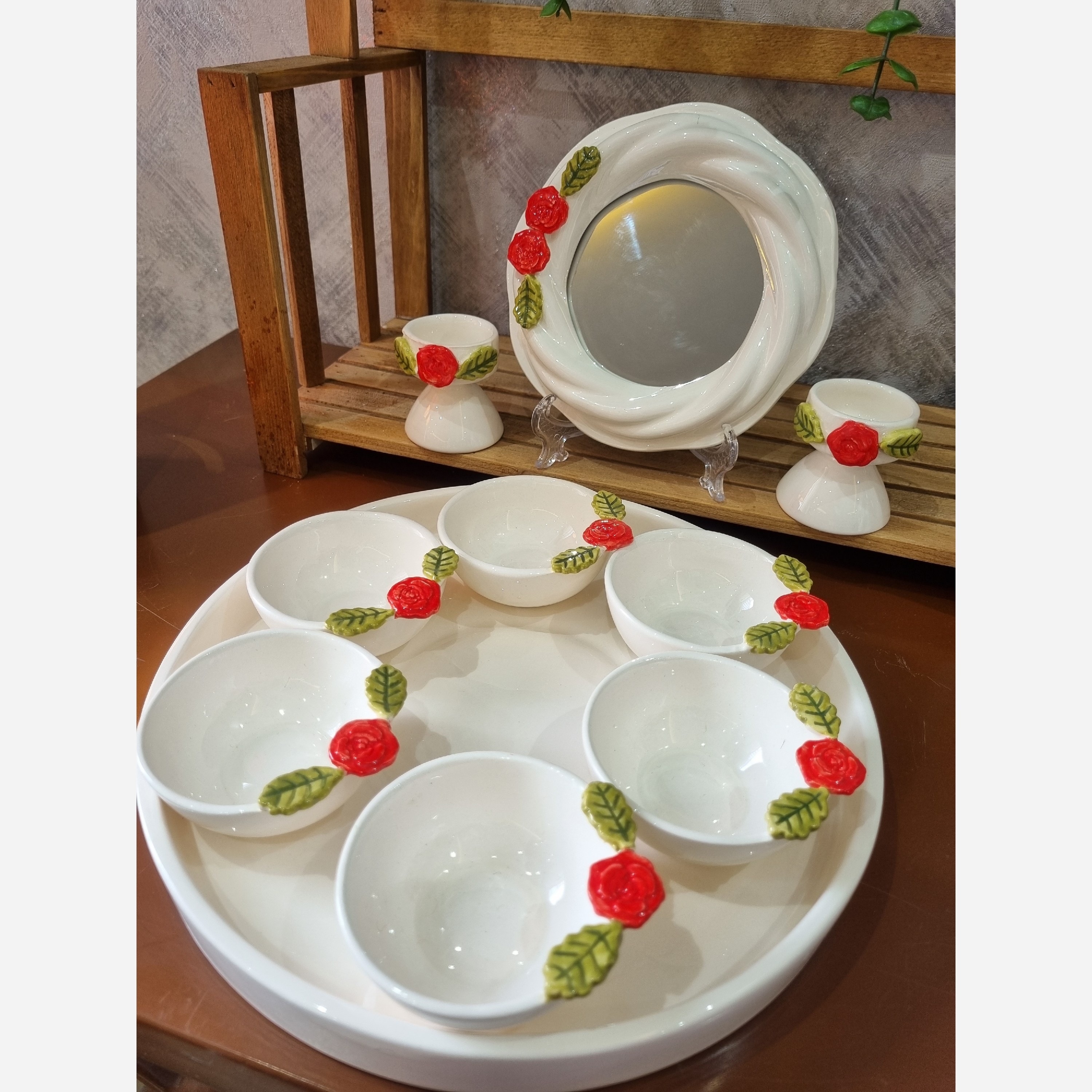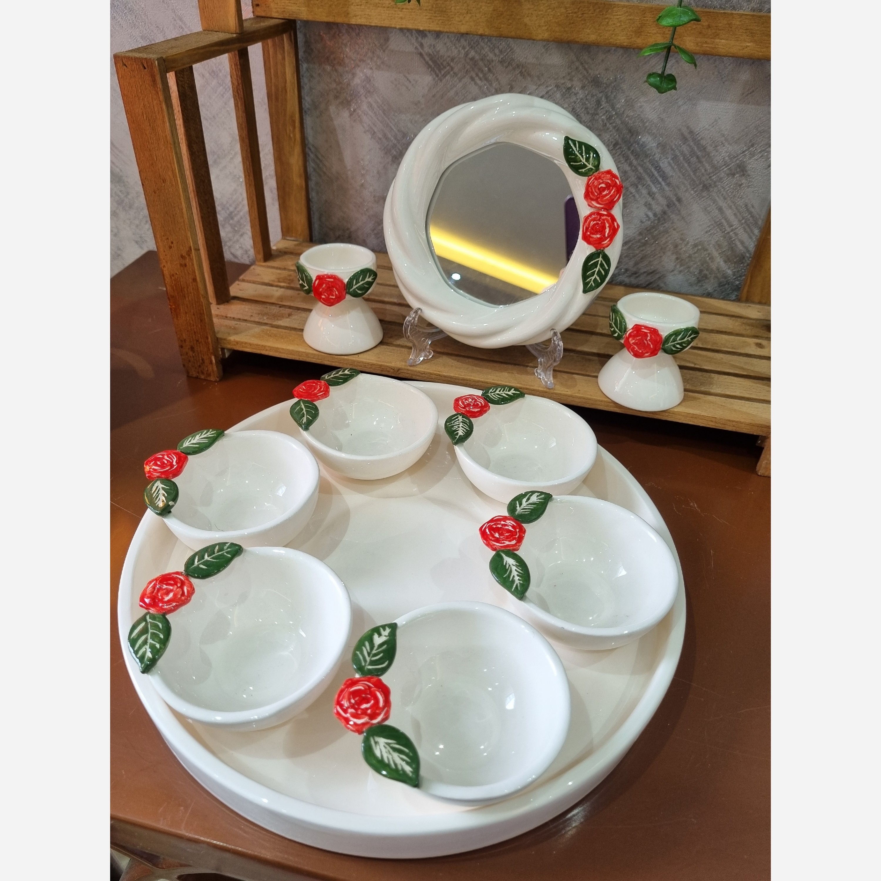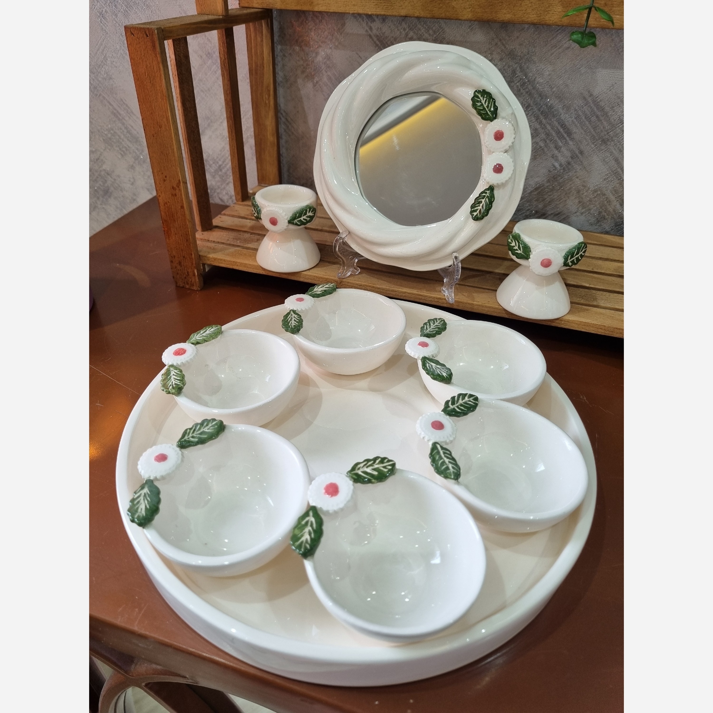 این هفت سین شامل یک سینی 26 سانت و 6 پیاله 6 سانتی آینه و دو شمعدان می باشد.