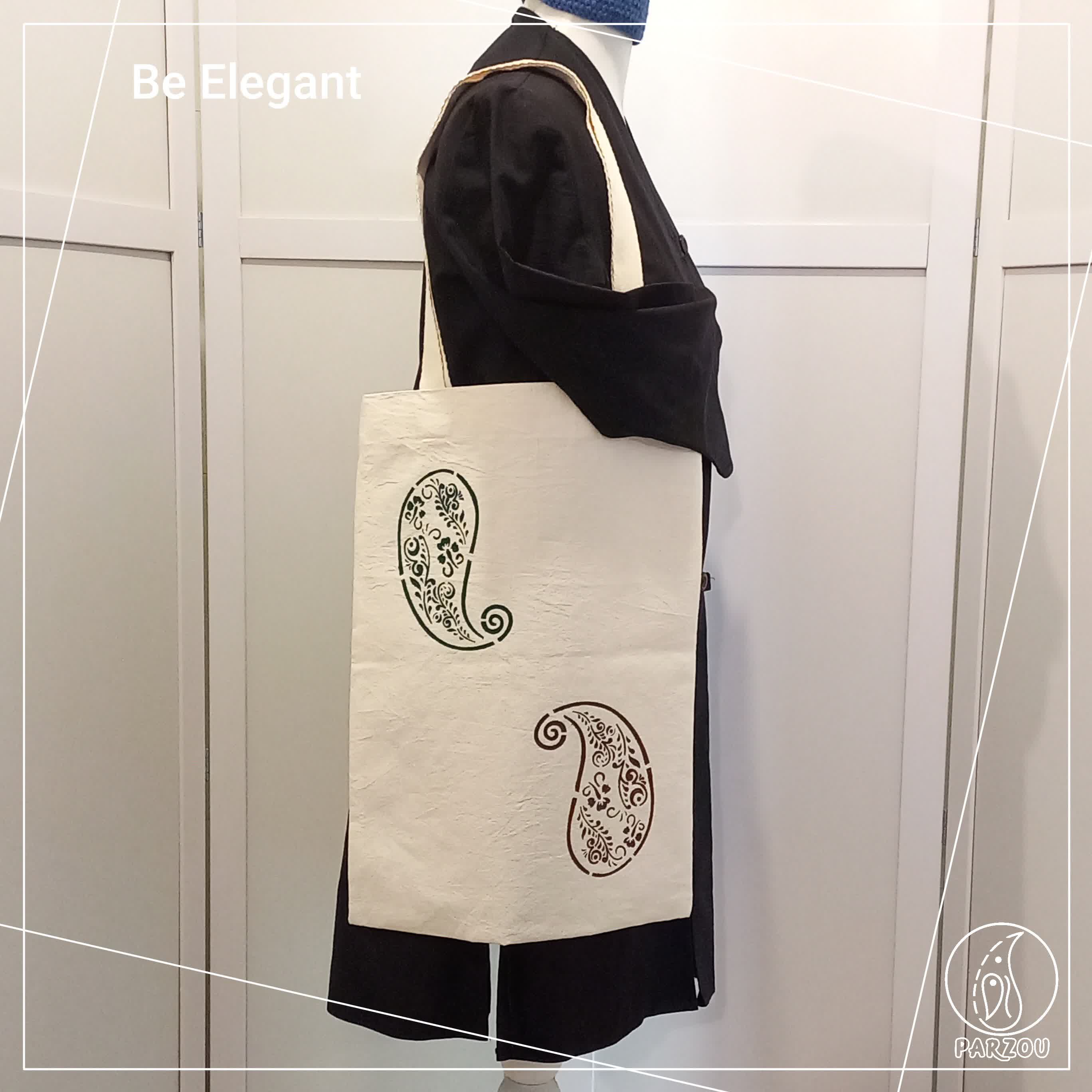 ساک پارچه ای متقال تمام نخ چروک سوزنی دستدوز با طراحی مخصوص دو رنگ جقه های زیبای یشمی و قهوه ای و بند مرغوب