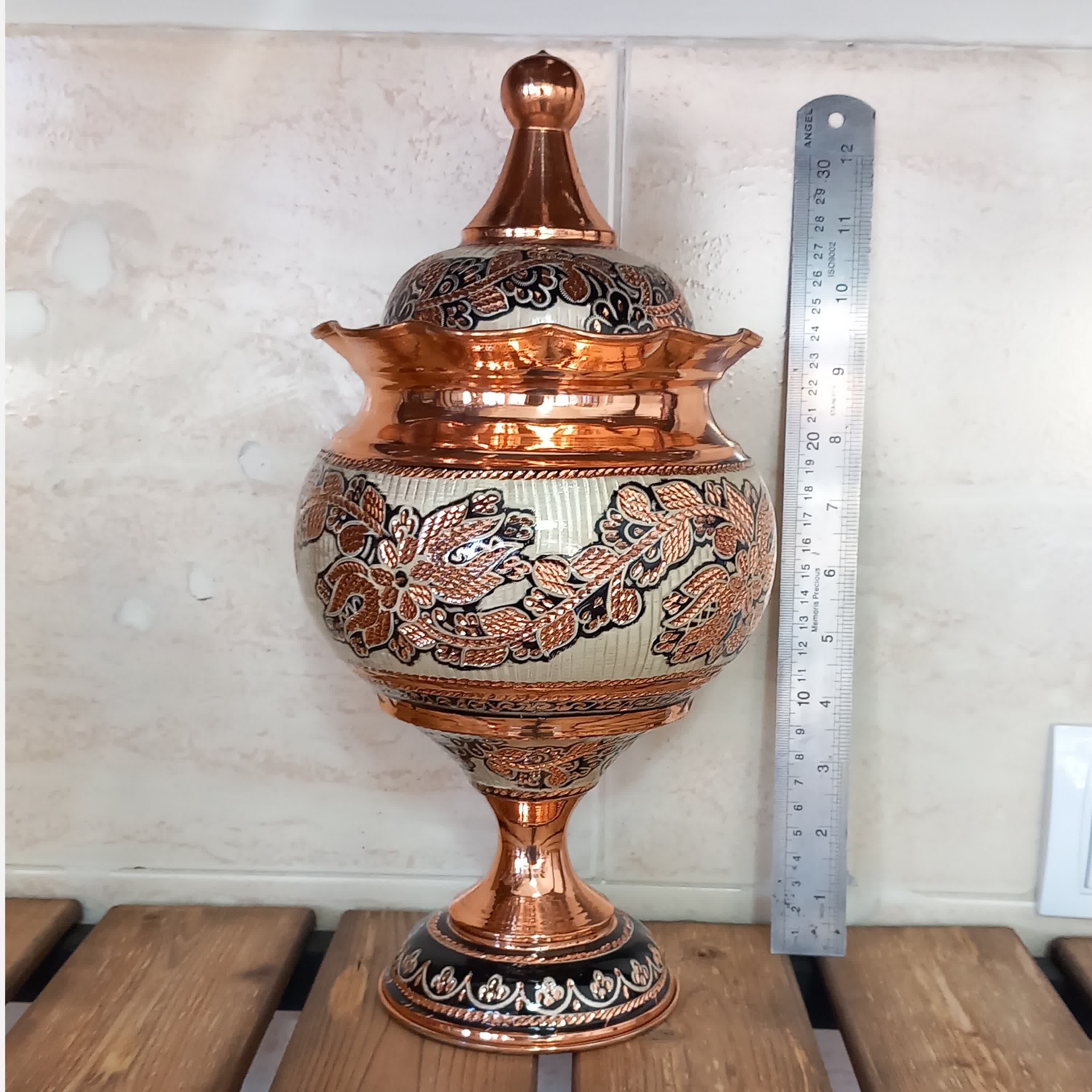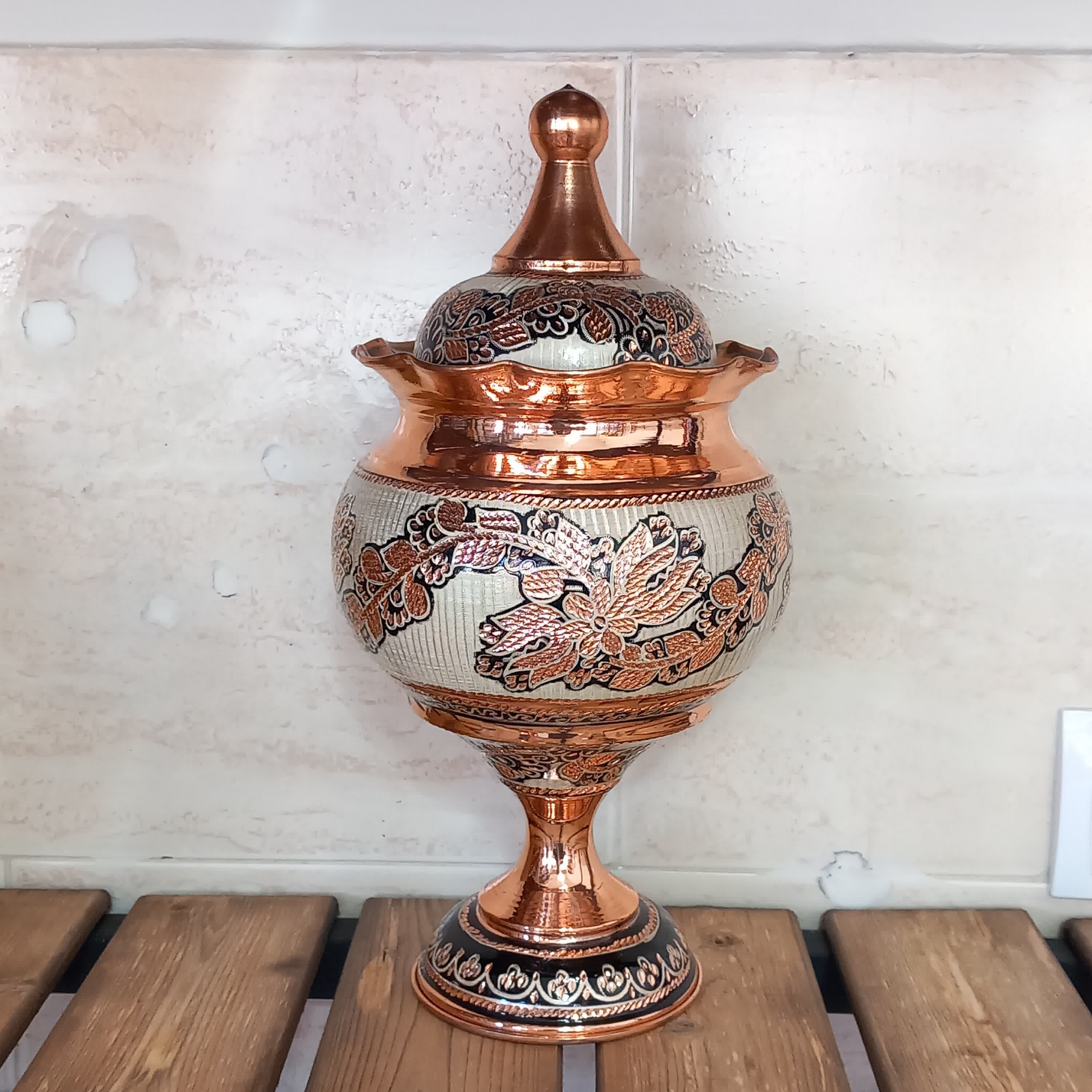 آجیل خوری مسی نقره کوب تراش خورده نانوشده بدون تغییر رنگ زیبا و خاص ارتفاع 32 ، قطر 15 سانت