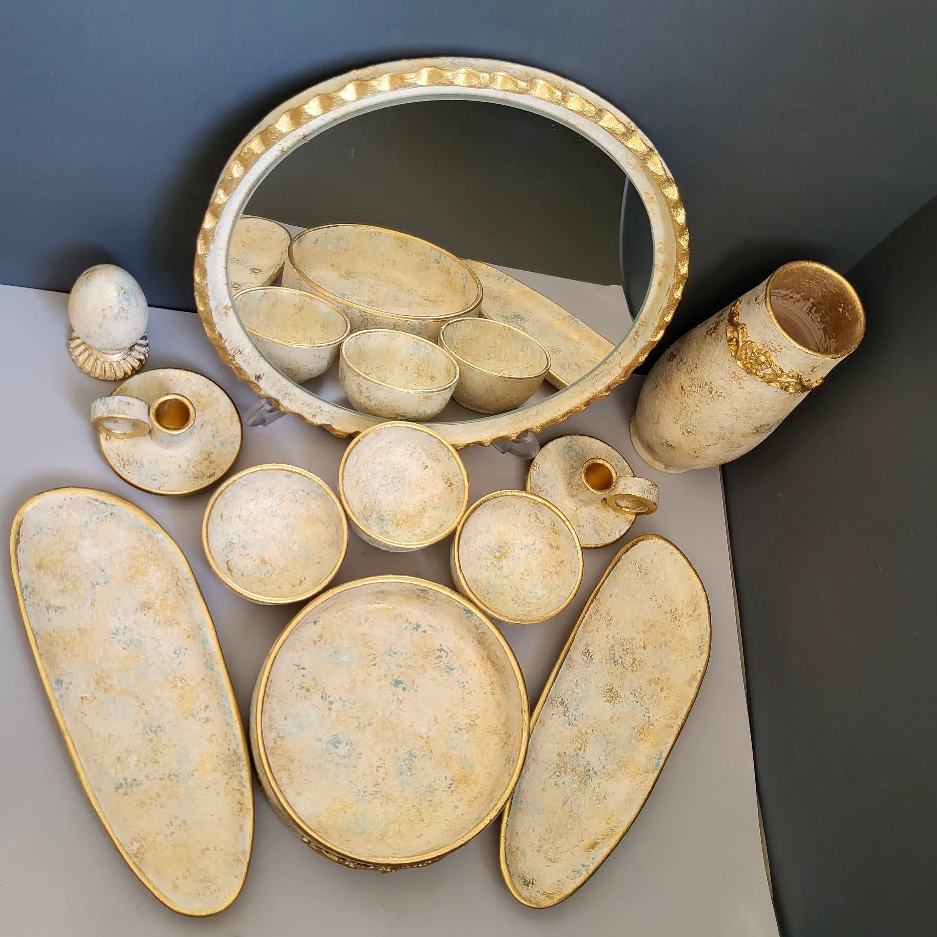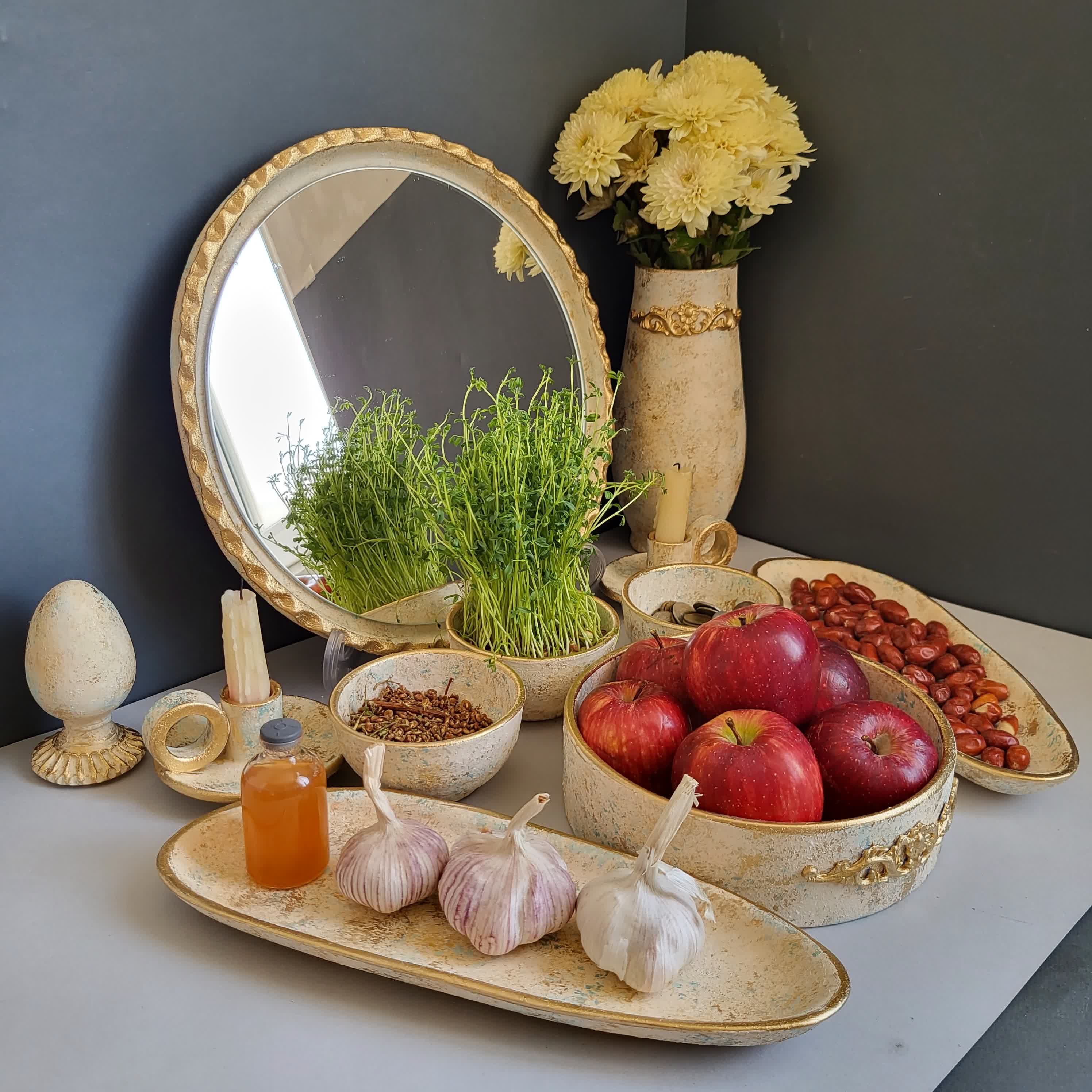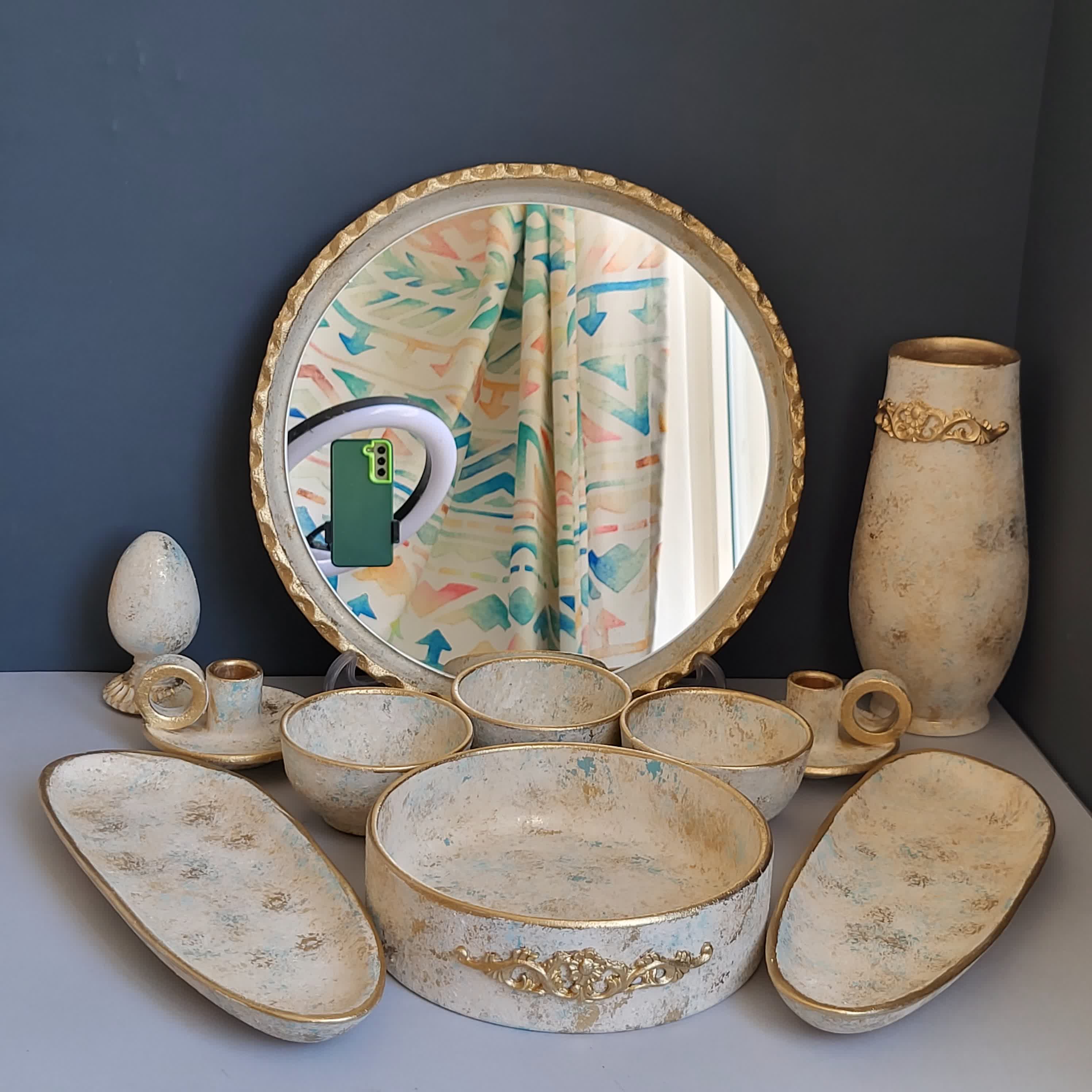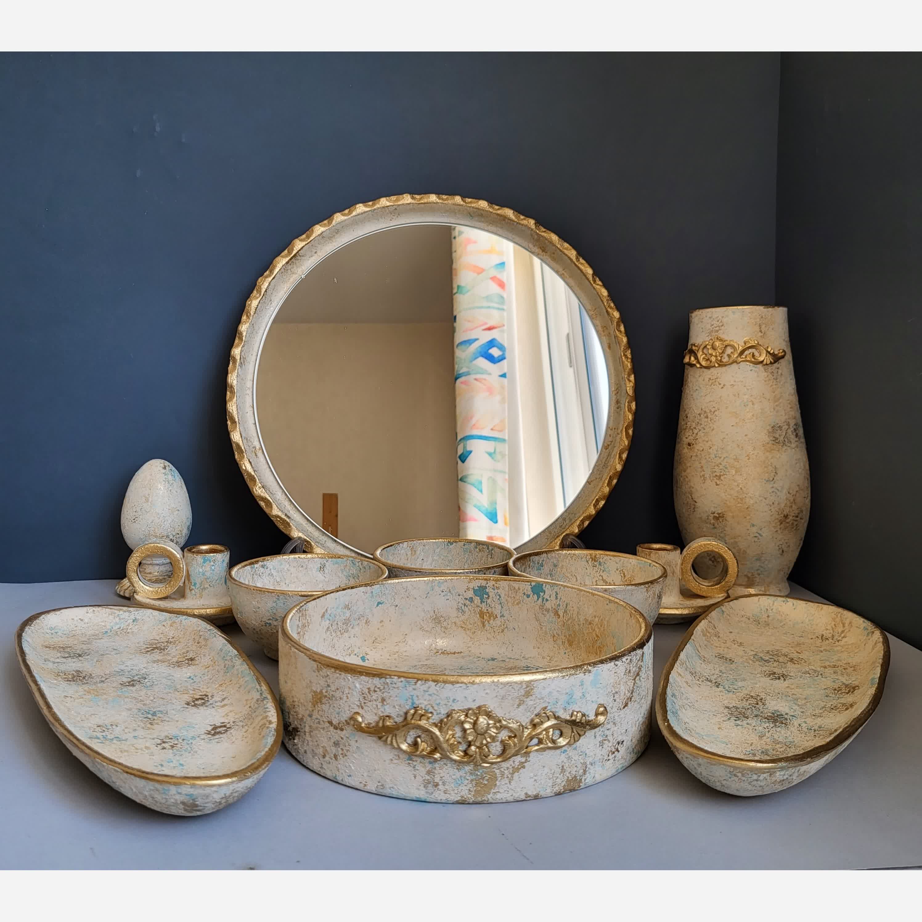 قطر آینه 35،دهانه کاسه بزرگ 20،دهانه کاسه کوچک 10،ارتفاع گلدان20،ارتفاع تخم مرغ12