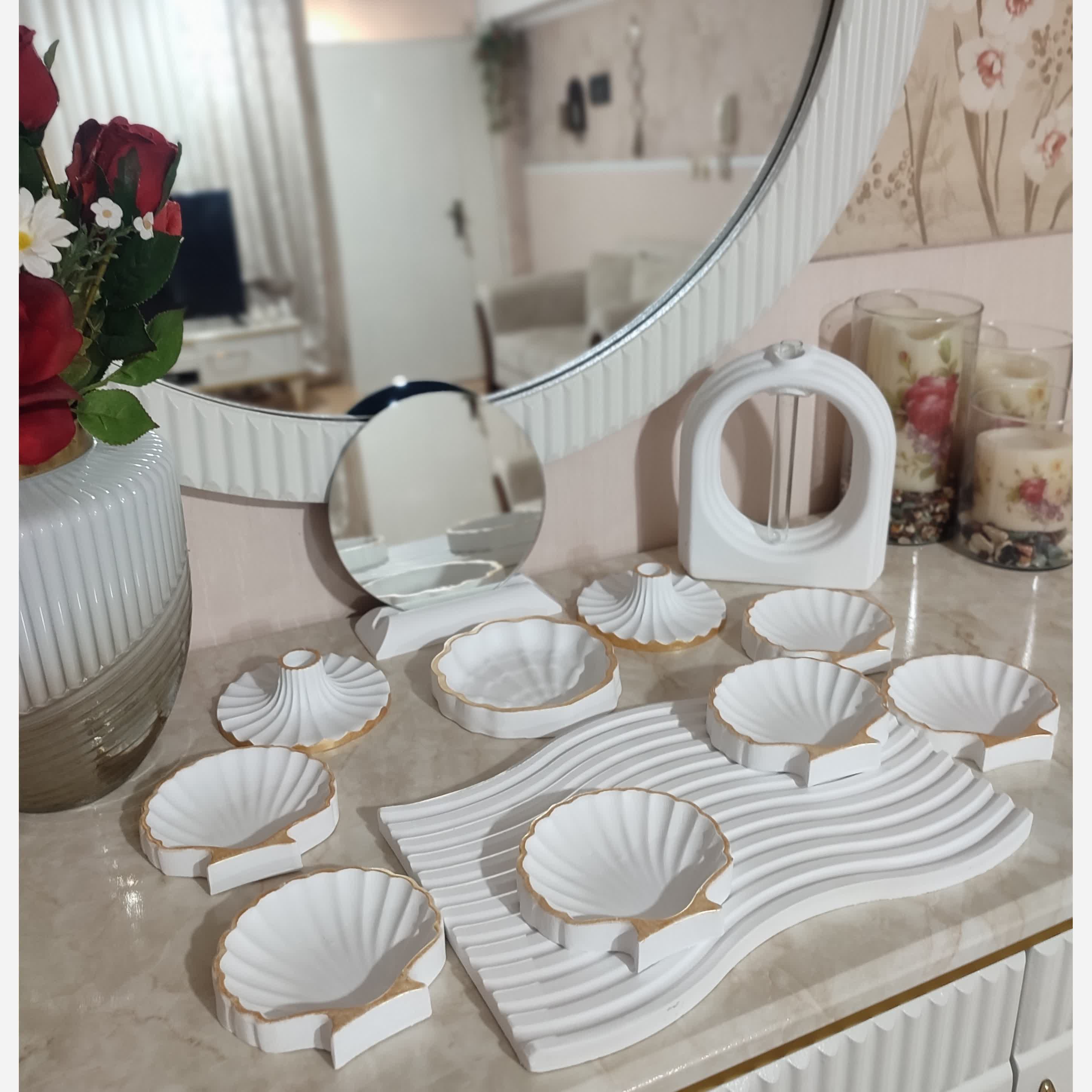 هفت سین مدل صدفی شامل 6 عدد ظرف هفت سین 1عدد ظرف سبزه 2عدد شمعدان 1 عدد پایه آینه 1 عدد آینه گرد با قطر 15 سانتیمتر 1عدد گلجا با شیشه 1 عدد استند موج دار