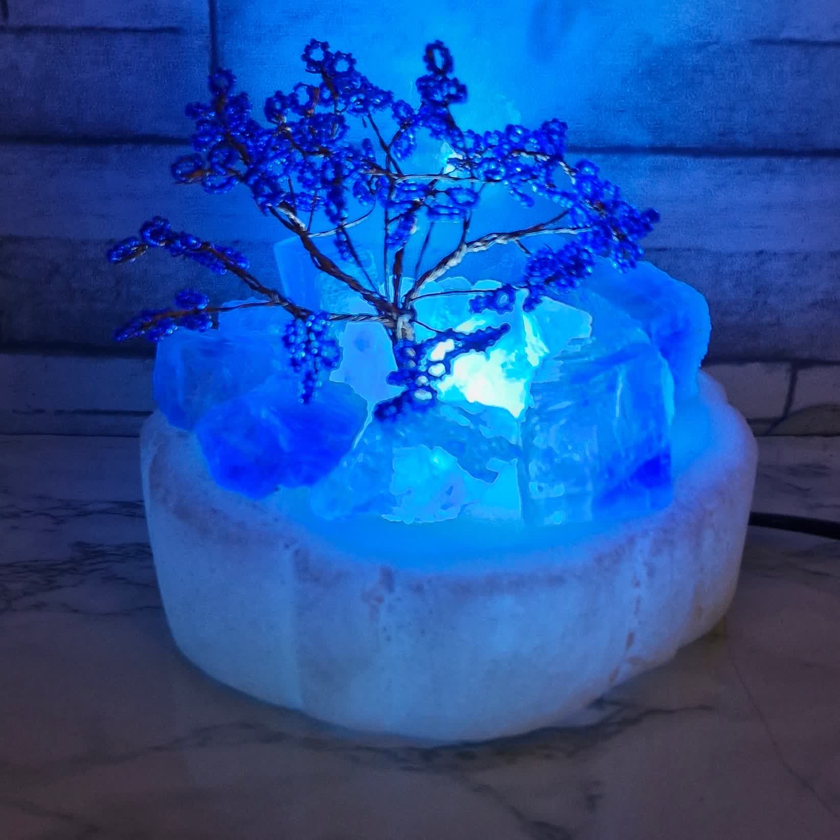 جنس سنگ نمک:کریستال آبی درجه گرمسار کاسه آباژور از سنگ نمک صورتی و درختچه ازرمس هست