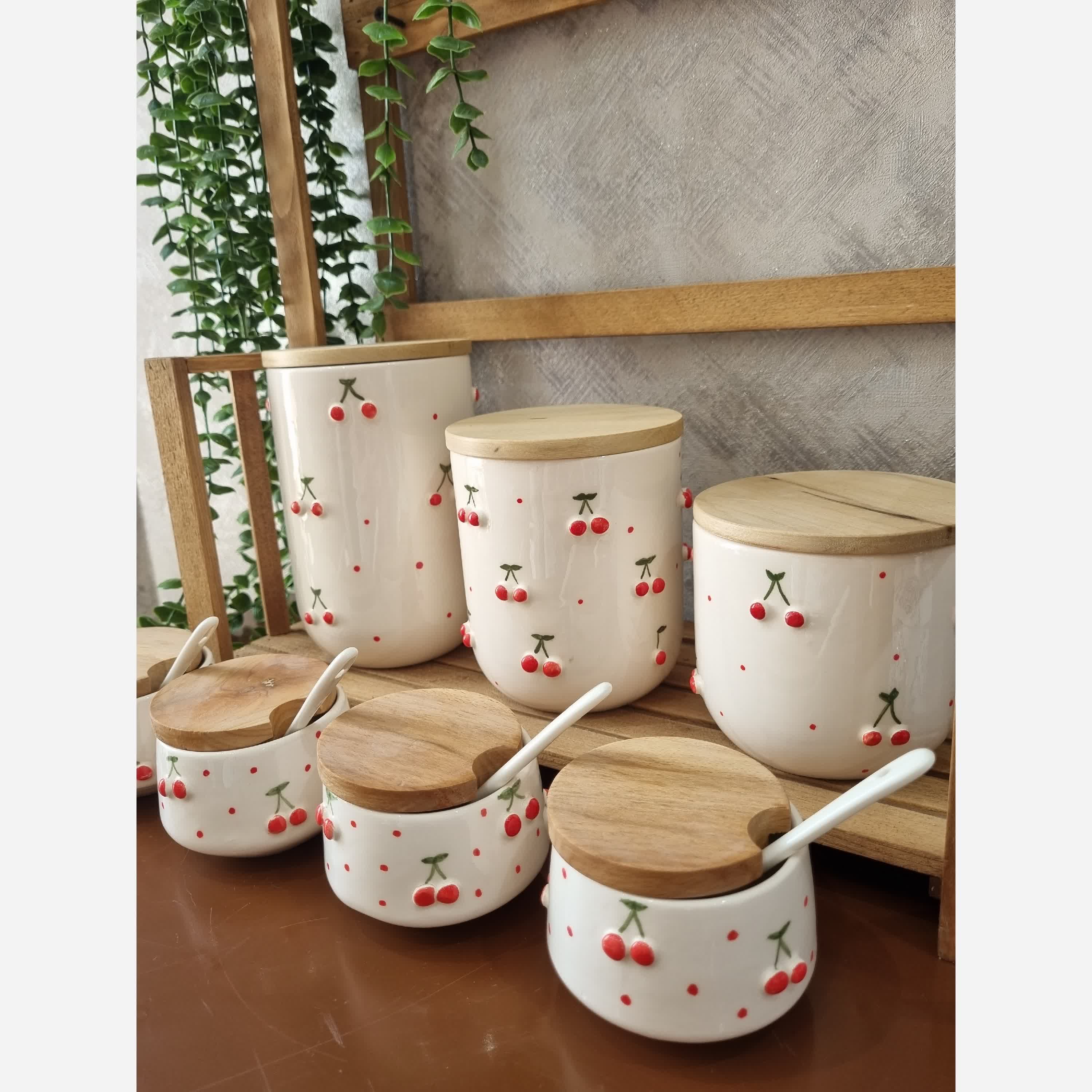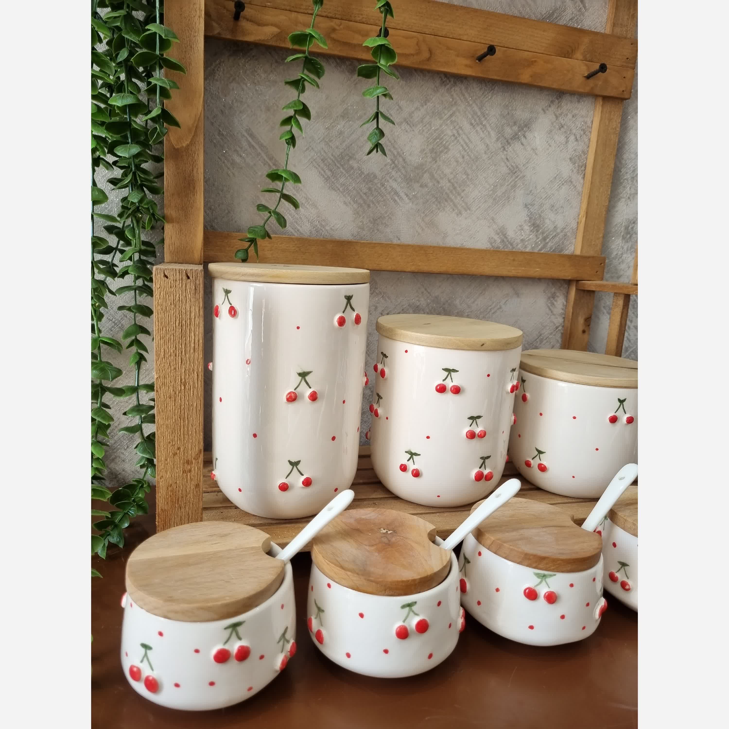 این ست شامل سه عدد بانکه با در چوبی و چهار عدد جاادویه با در چوبی و قاشق می باشد.درب بانکه و جا ادویه بدون واشر می باشد. رنگ در بانکه و جاادویه به دلیل چوبی بودن ممکن است تیره یا روشن تر باشد. استند داخل عکس جز سفارش نمی باشد.