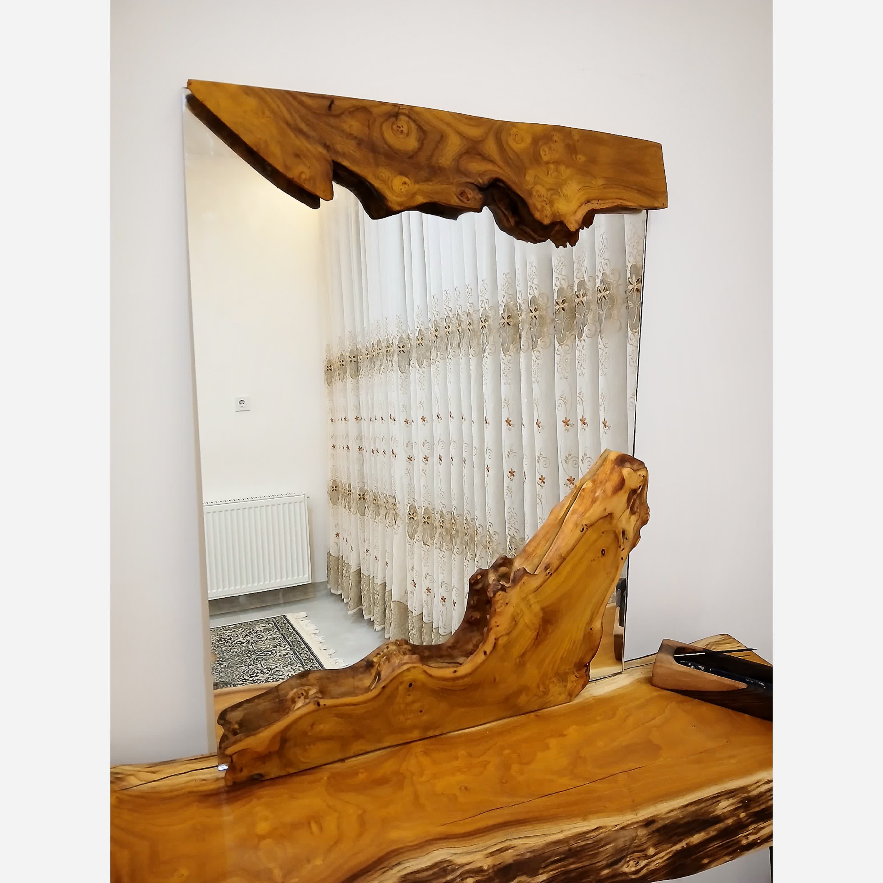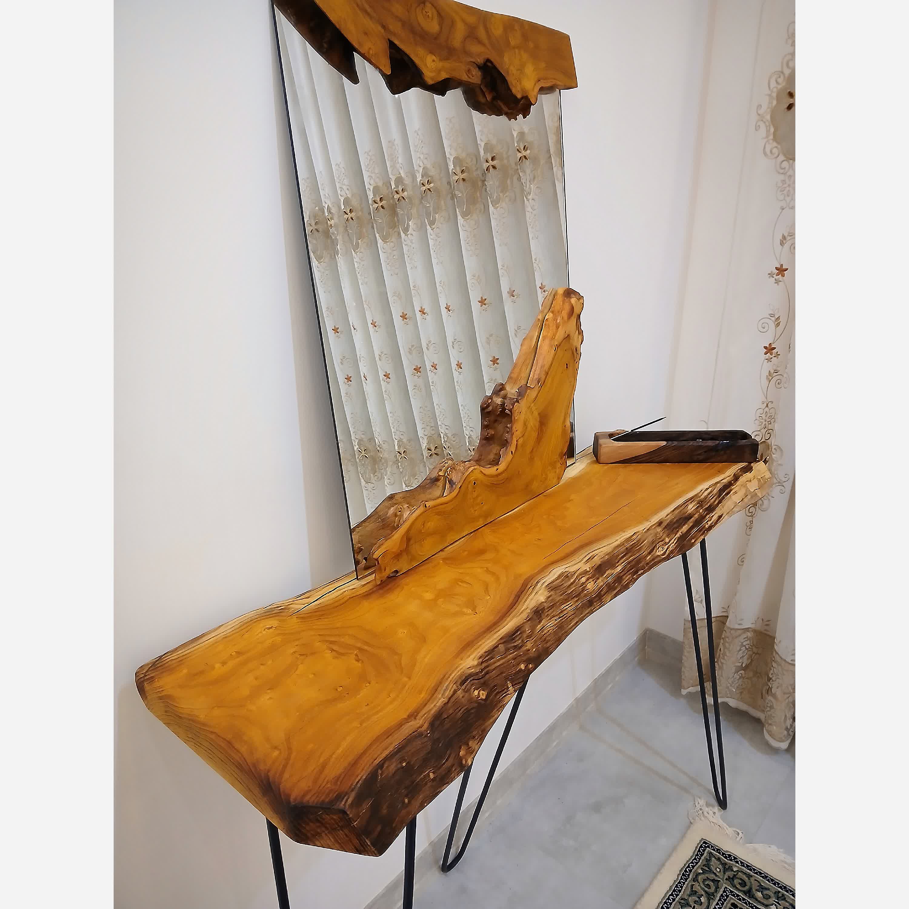 کنسول و آیینه رستیک چوب شاه توت کاری فوق العاده شیک و لاکچری عایق شده با روغن گیاهی کاملا مقاوم و ضد آب وضد خش پایه های سنجاقی مقاوم