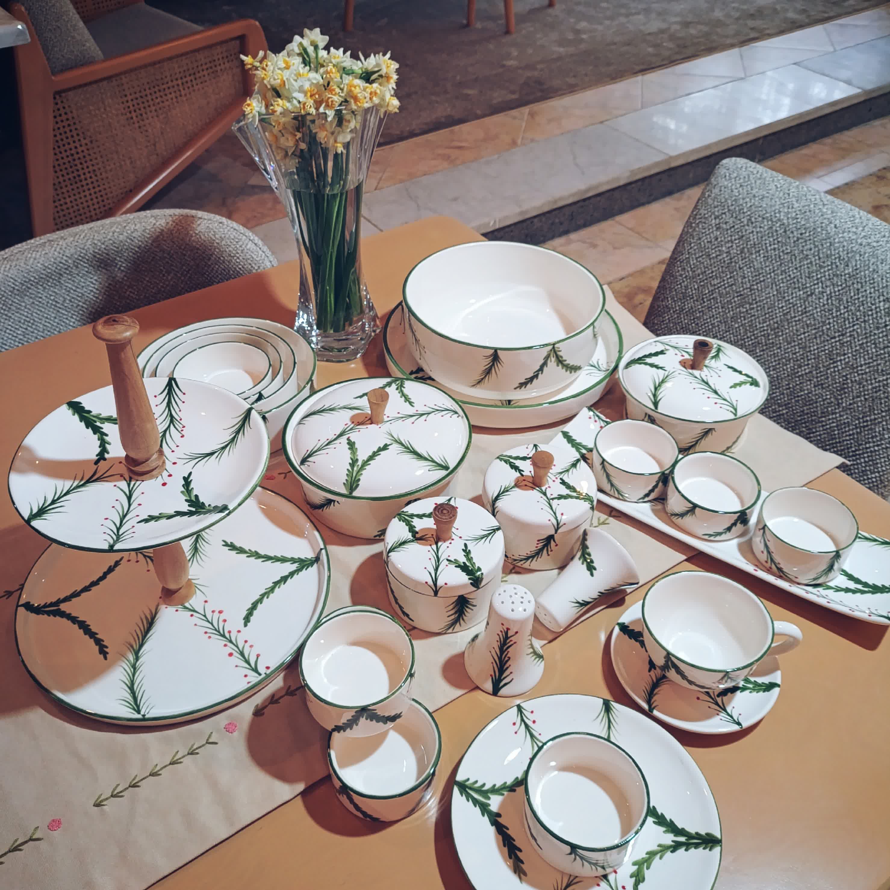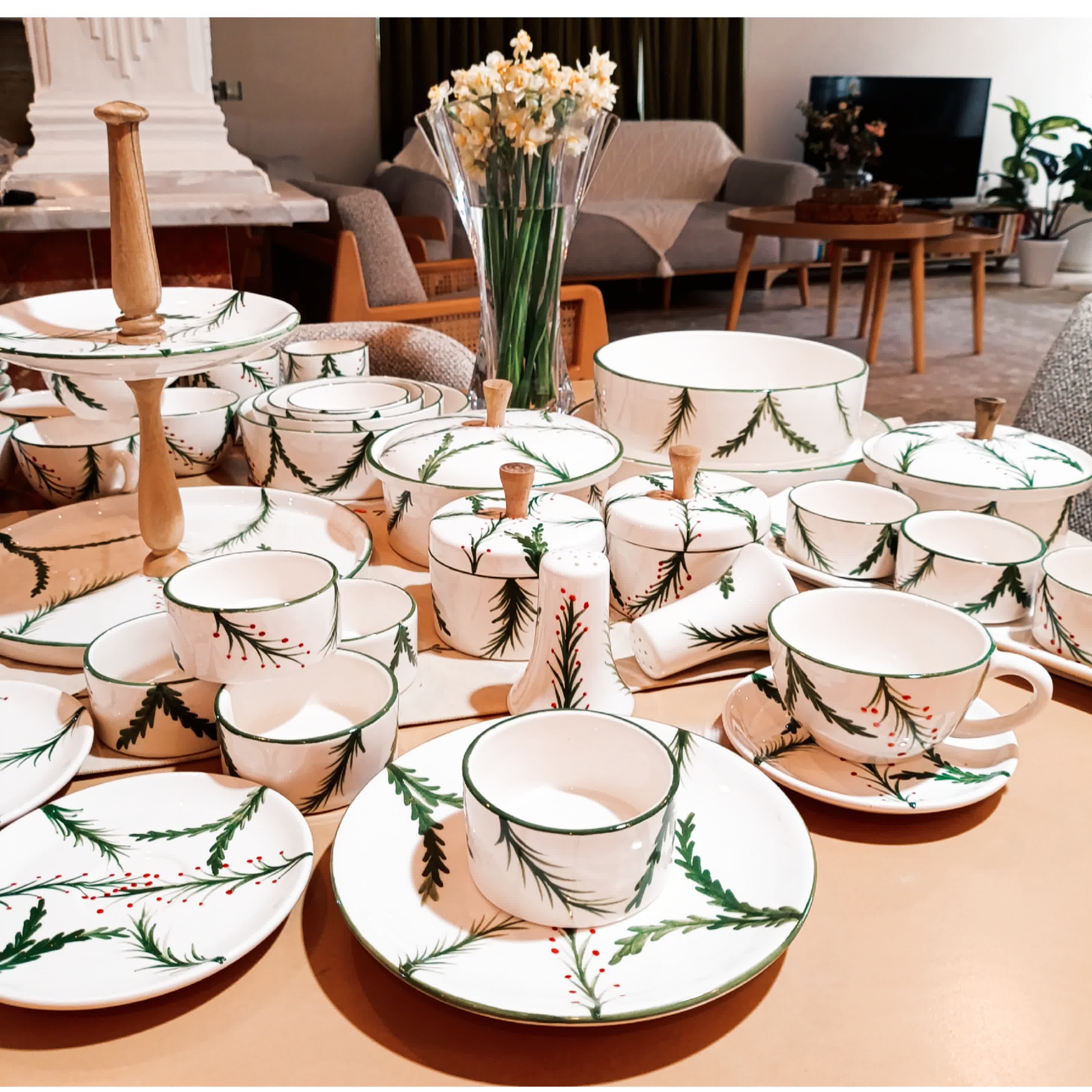 شیرینی خوری دو طبقه با دستگیره چوبی میوه خوری 24 سانت بشقاب بزرگ 27 سانت لبه دار 6عددپیش دستی 6عددفنجان و نعلبکی قندان 2 عدد شکلات خوری اجیل خوری 18 سانت درب دار رولت و 6 عدد کاسه 2عدد نمکدان کاسه 4 عددی 11.14.17.20 سانت