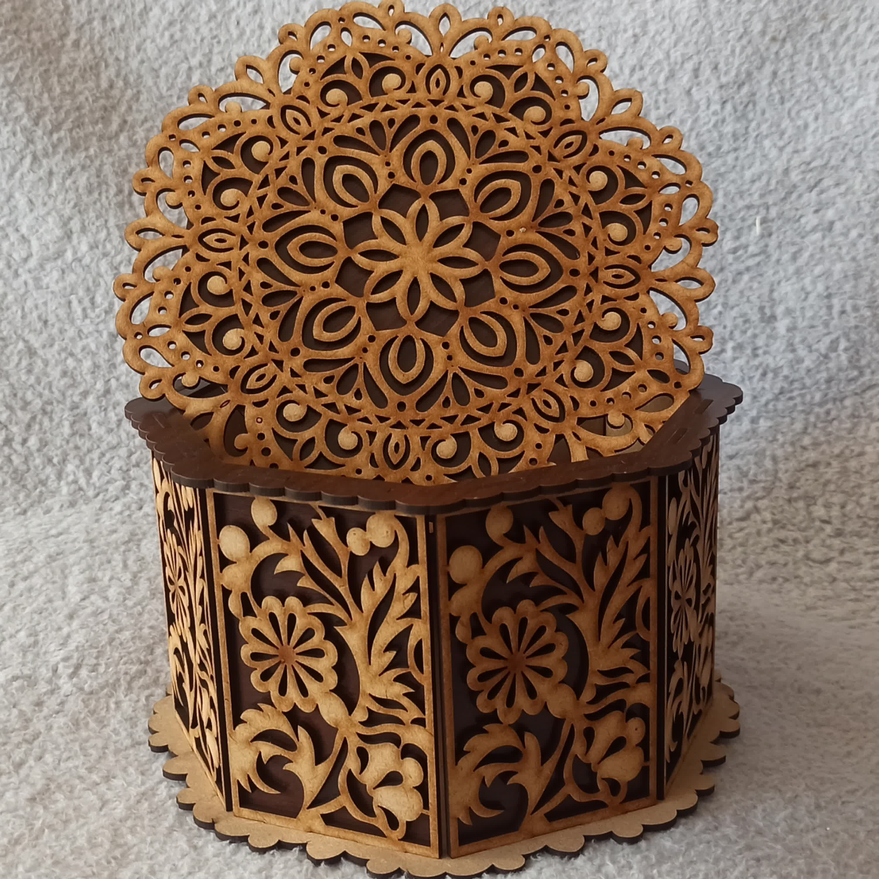 درود فراوان آجیل خوری یا شکلات خوری چوبی جنس چوب ام دی اف دولایه جهت استحکام بیشتر و زیبایی دوچندان طرح اسلیمی گنجایش یک کیلو آجیل را دارد ابعاد 17×17×15 سانتیمتر