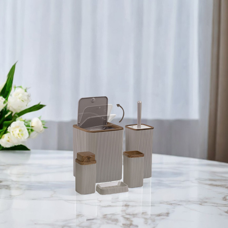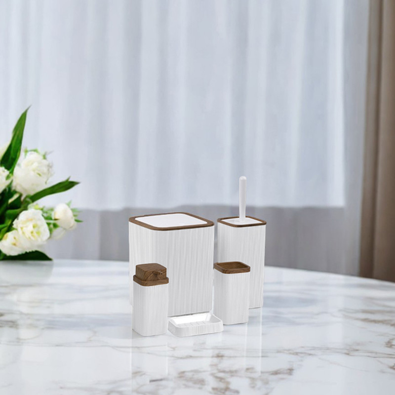 مشخصات کامل ست سرویس بهداشتی سفید ۵ تکه ترک: سطل زباله با ابعاد ۲۲.۳×۱۸×۱۸ (±۲) سانتیمتر سطل زبالهای کوچک و جمعوجور، ایدهآل برای استفاده در سرویس بهداشتی. این سطل با درب محکم و طراحی جذاب، به تمیزی فضا کمک میکند. برس توالت با ابعاد ۱۰.۵×۱۰.۵×۳۵ (±۲) سانتیمتر ابزاری ضروری برای نظافت کامل سرویس بهداشتی که با طراحی ارگونومیک خود استفاده آسانی دارد و به راحتی در فضای کم جا میگیرد. جامسواکی با ابعاد ۶.۸×۶.۸×۱۳ (±۲) سانتیمتر محفظهای ایدهآل برای نگهداری مسواکها و جلوگیری از آلودگی، با طراحی مینیمال که به راحتی با دکوراسیون مدرن هماهنگ میشود. مخزن پمپی صابون مایع با ابعاد ۶.۸×۶.۸×۱۵.۵ (±۲) سانتیمتر مناسب برای صابون مایع، با پمپی روان و طراحی شیک که استفاده از آن راحت و بهداشتی است. جاصابونی با ابعاد ۹×۲.۵×۱۳ (±۲) سانتیمتر نگهدارندهای مناسب برای صابون جامد، با طراحی کاربردی و سطحی که از لیز خوردن صابون جلوگیری میکند.