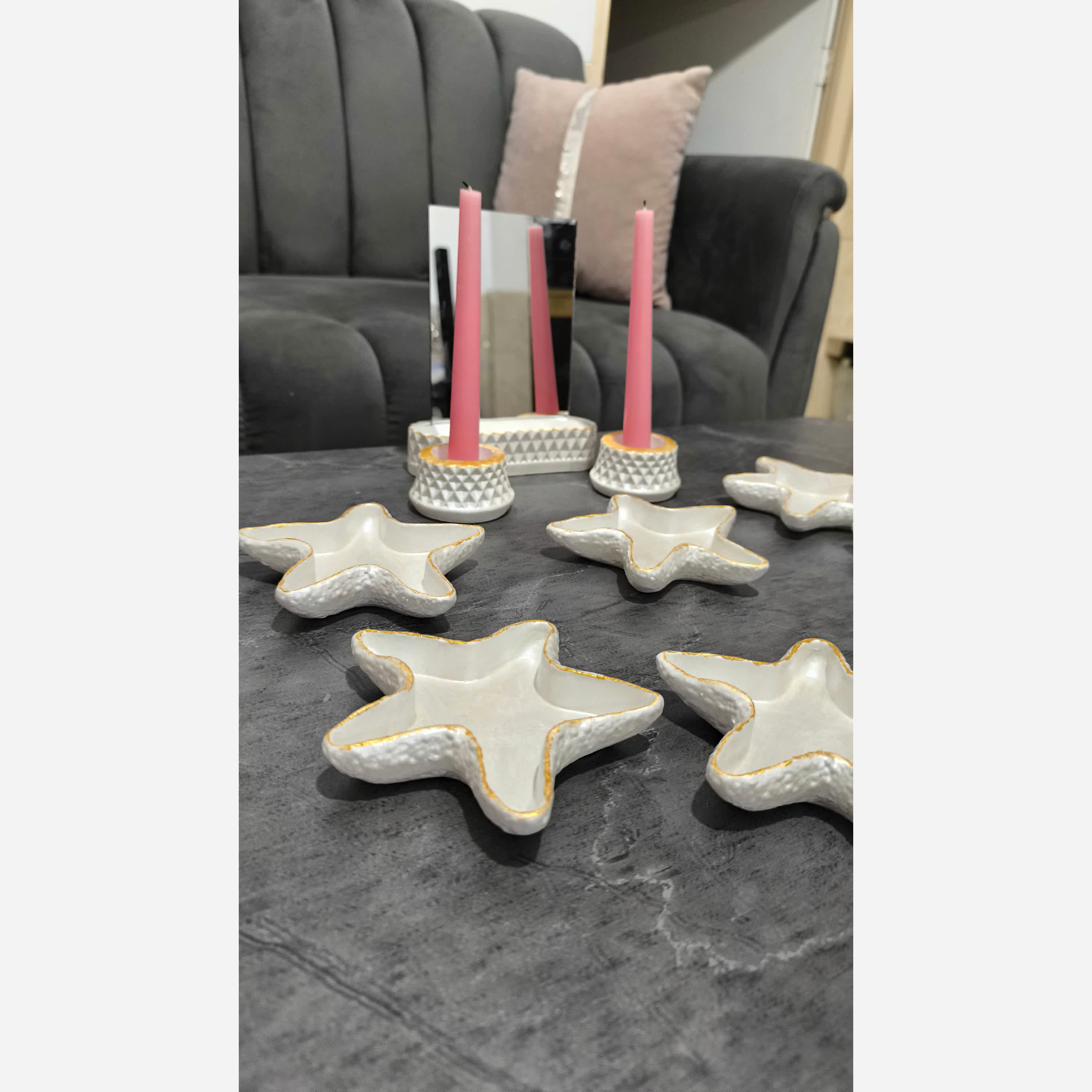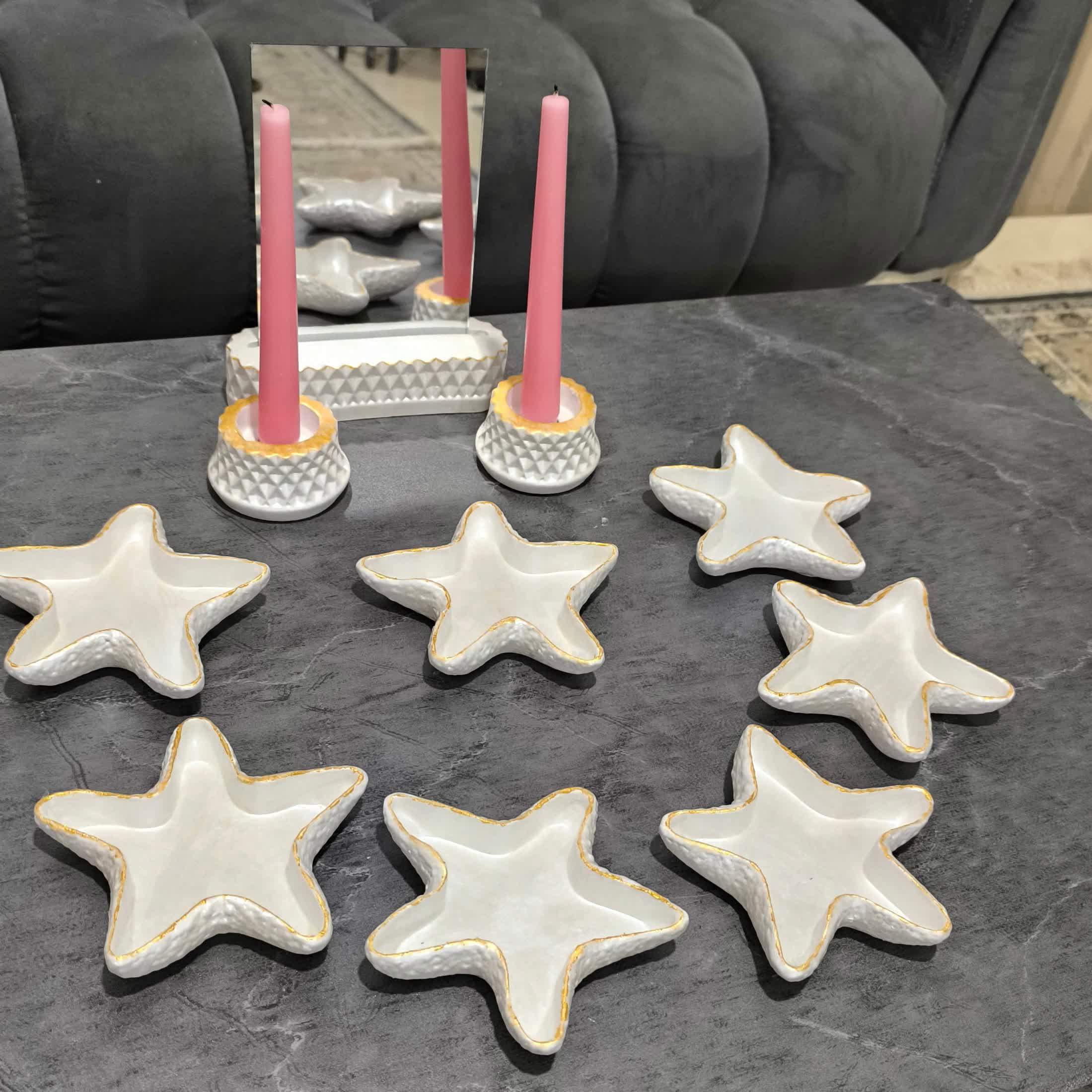 هفت سین ستاره شامل👇 💟7عدد ظرف هفت سین 💟2عدد جا شمعی 💟1عدد استند آینه 💟1عدد آینه