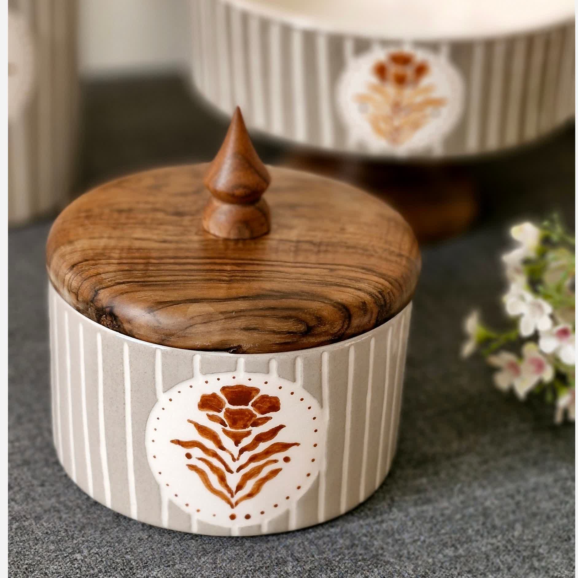 ظروف پذیرایی سرامیکی کاملا دستساز و رنگ ها ثابت هست قابل شستشو. با درب چوب با کیفیت گردو خراطی شده