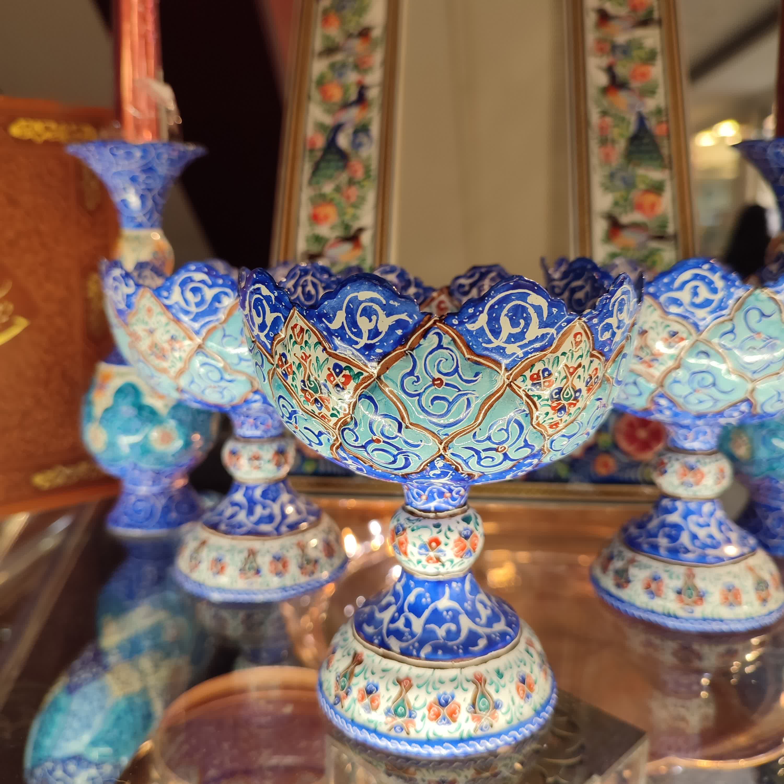 آینه گل و مرغ 20در 33س 800،000ت شمعدان میناکاری 16سانتی 2عدد 1،400،000ت کاسه پایه دار میناکاری هرعدد1،200،000 در صورت تمایل هر کدام از اجناس راکم یا زیاد میتوانید بکنید.وزن تغریبی است.